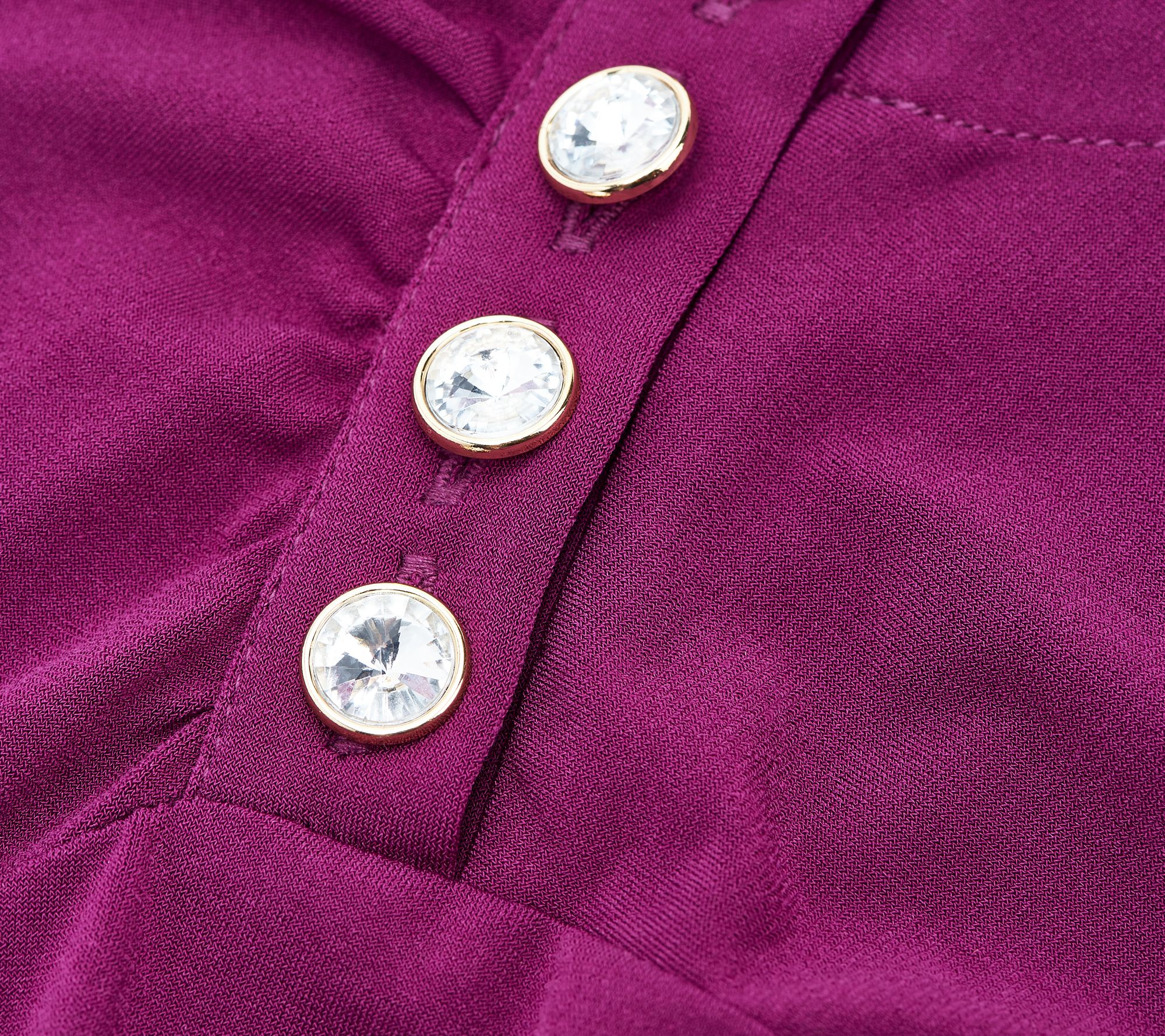 • Features: faux-gem button closure with ruching along left shoulder seam, front drape neckline, long sleeves, straight bottom hemline