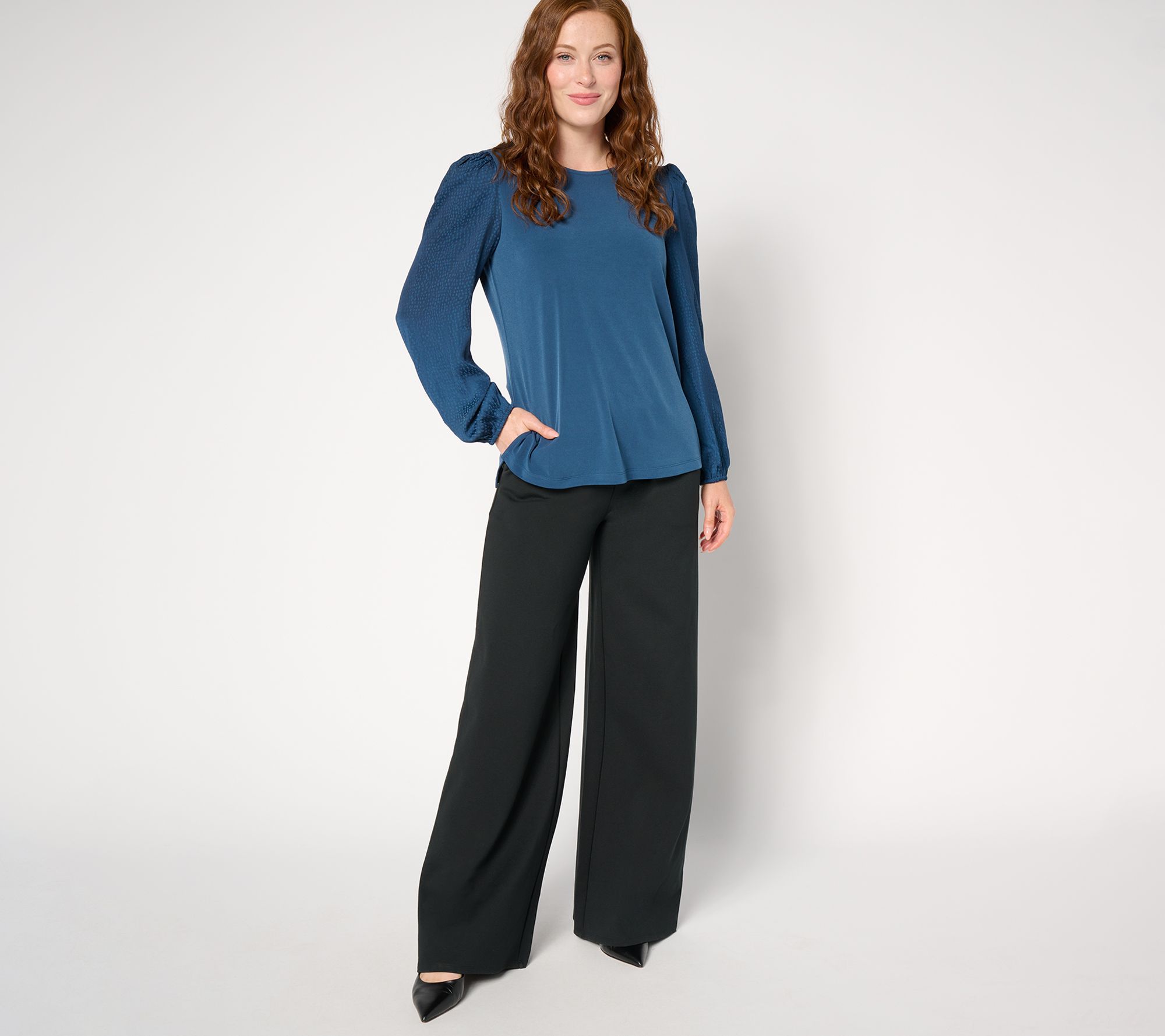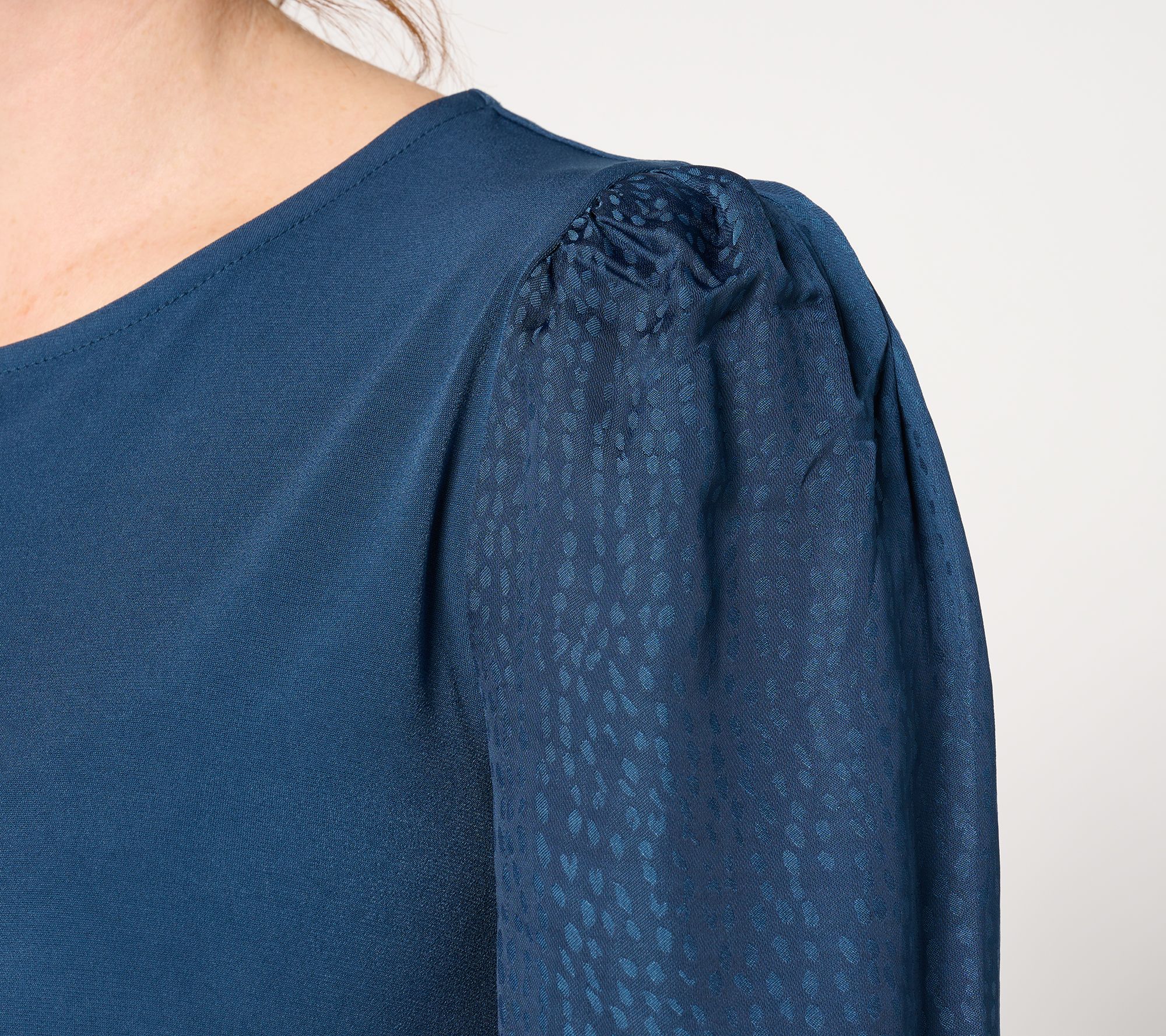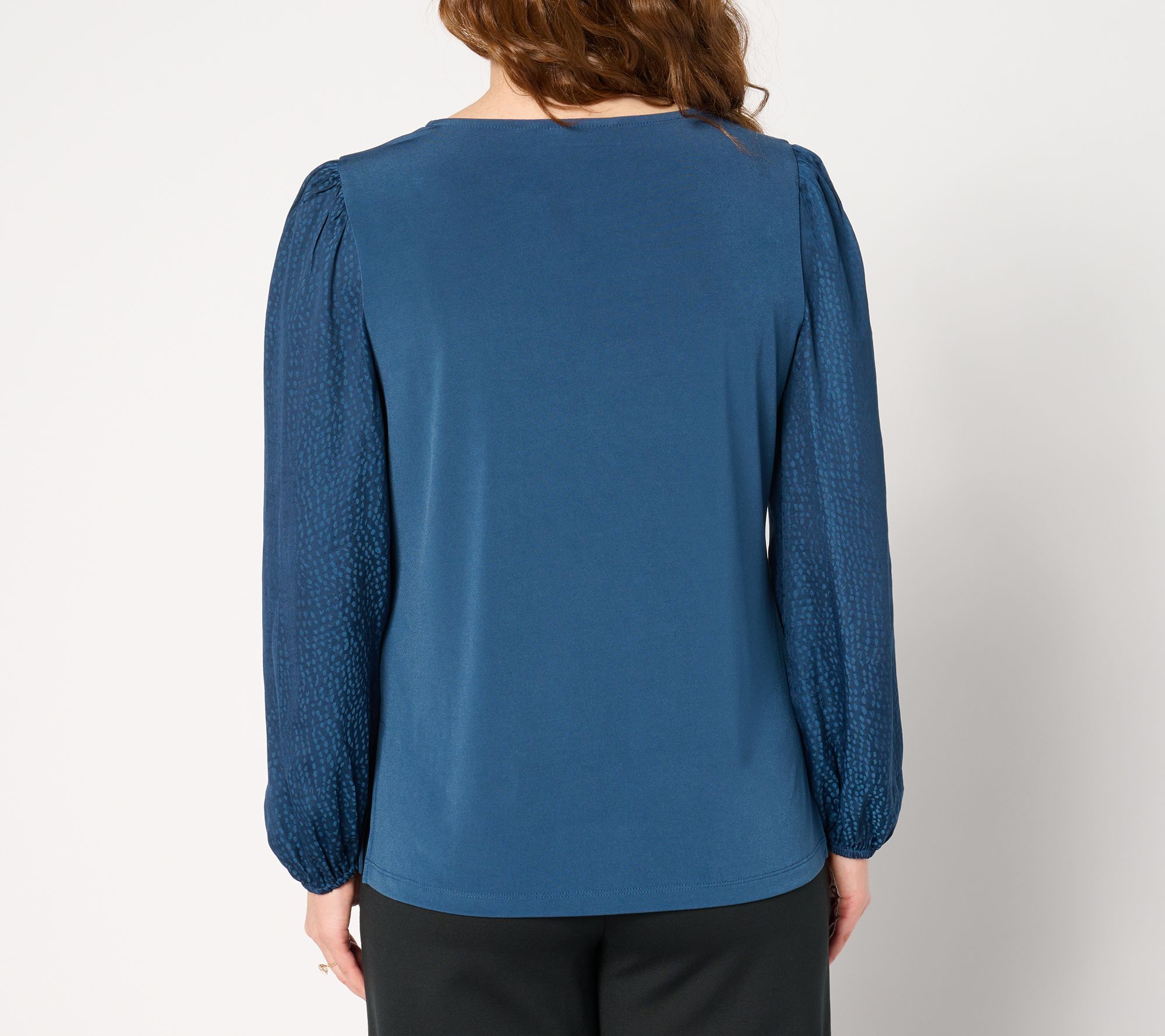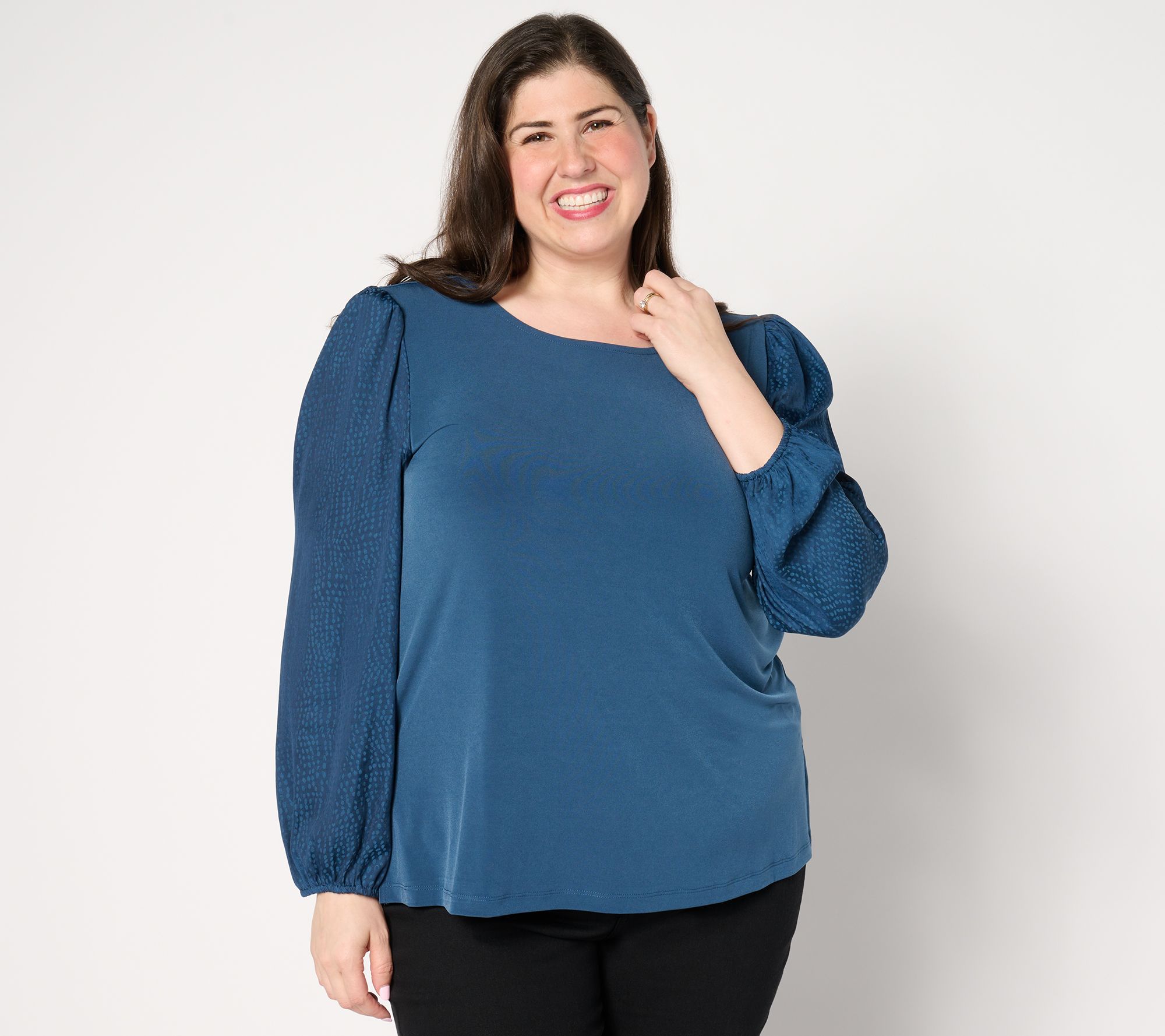 Look lovely in this luxe top featuring contrasting textured sleeves. Whether you're headed to happy hour or your bestie's birthday party, you'll arrive in standout style exuding confidence and feeling fabulous. From Susan Graver.