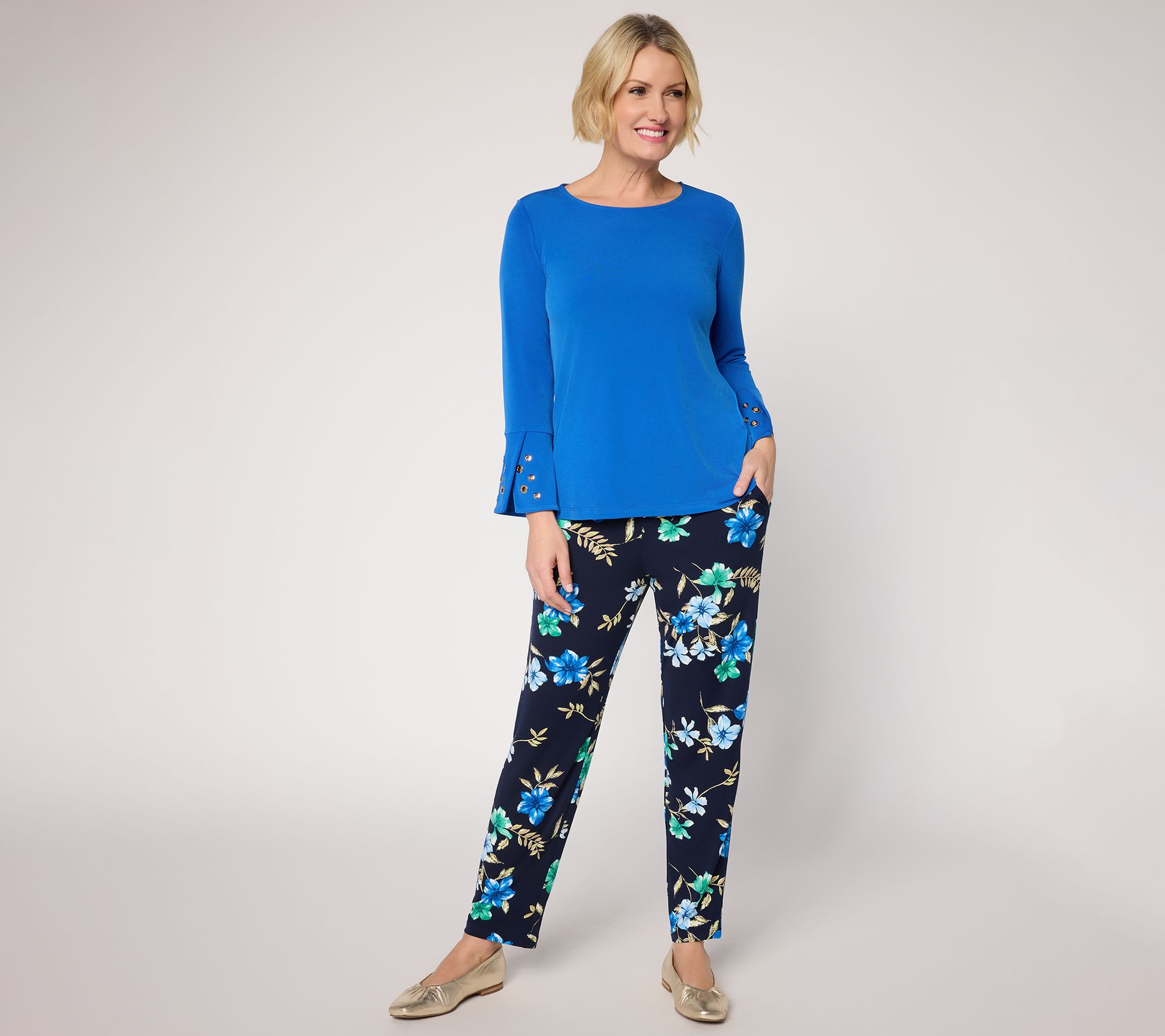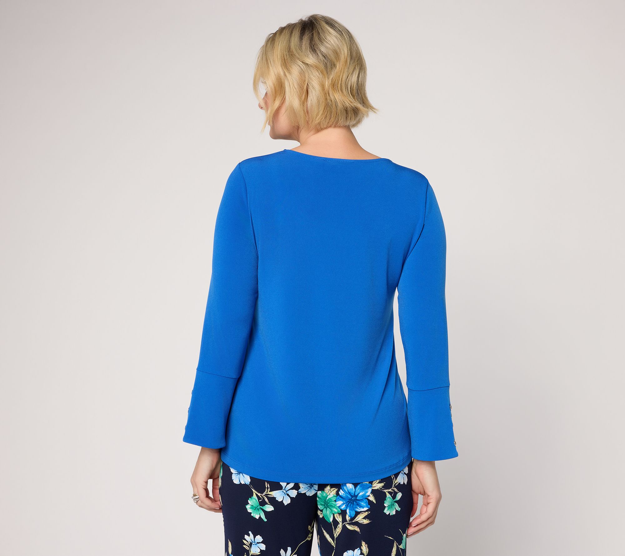 Effortlessly transition from weekday routines to weekend gatherings in this Liquid Knit® top, where grommet-adorned bracelet sleeves and a vented cuff add a standout touch to your look. The easy pullover style and scoop neckline create a laid-back vibe, while the signature Liquid Knit® fabrication offers comfortable stretch you'll appreciate throughout the day. From Susan Graver.