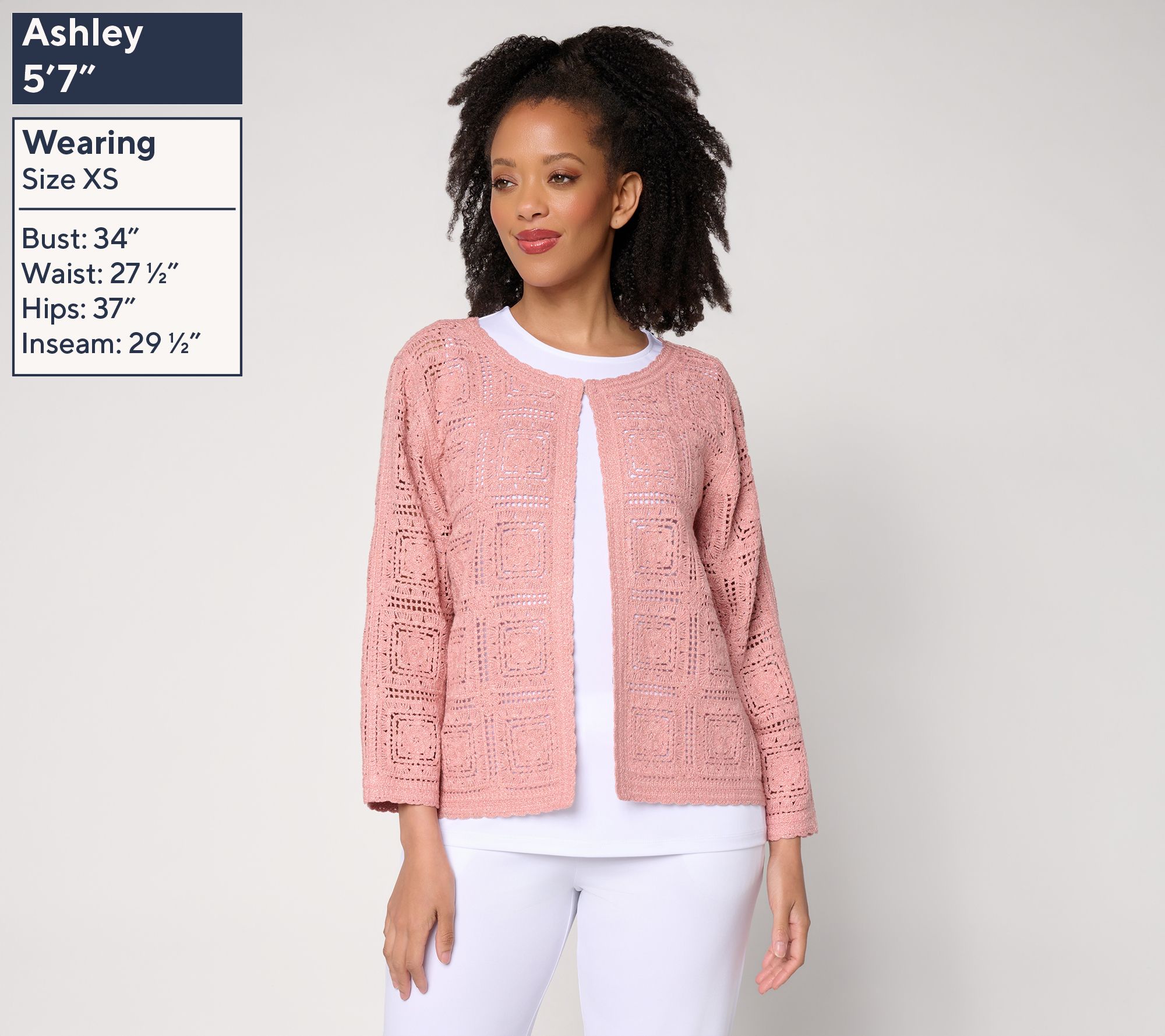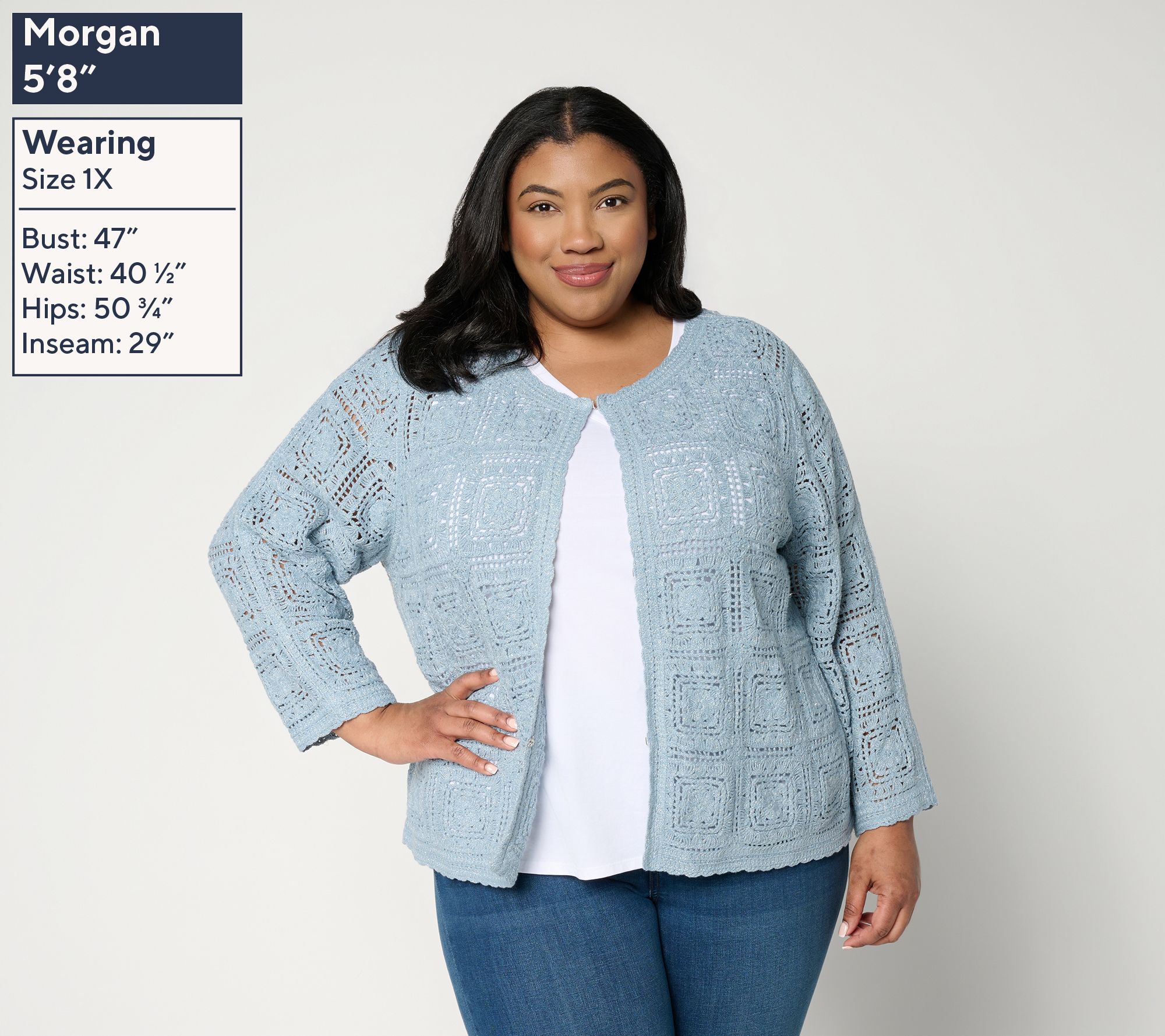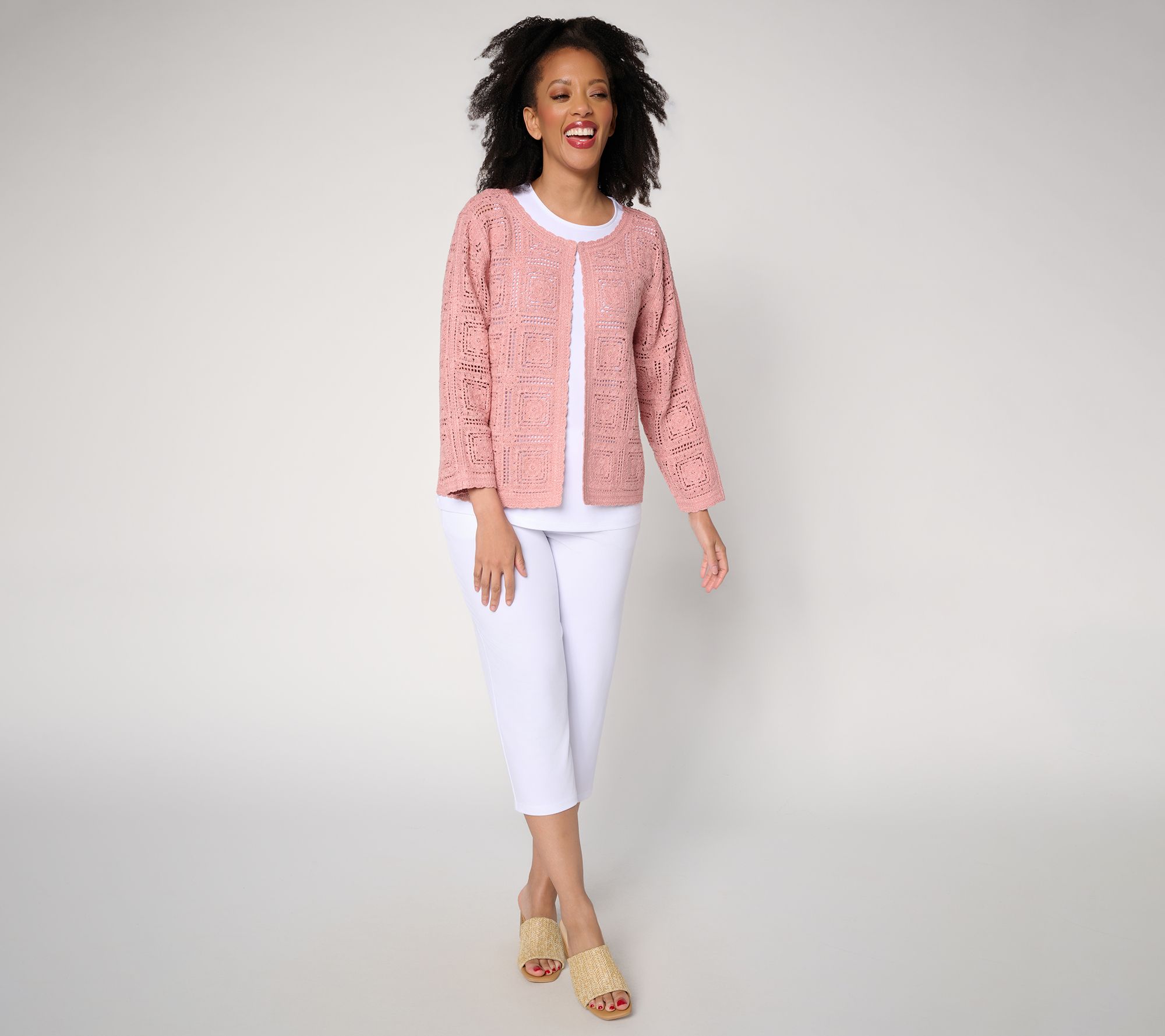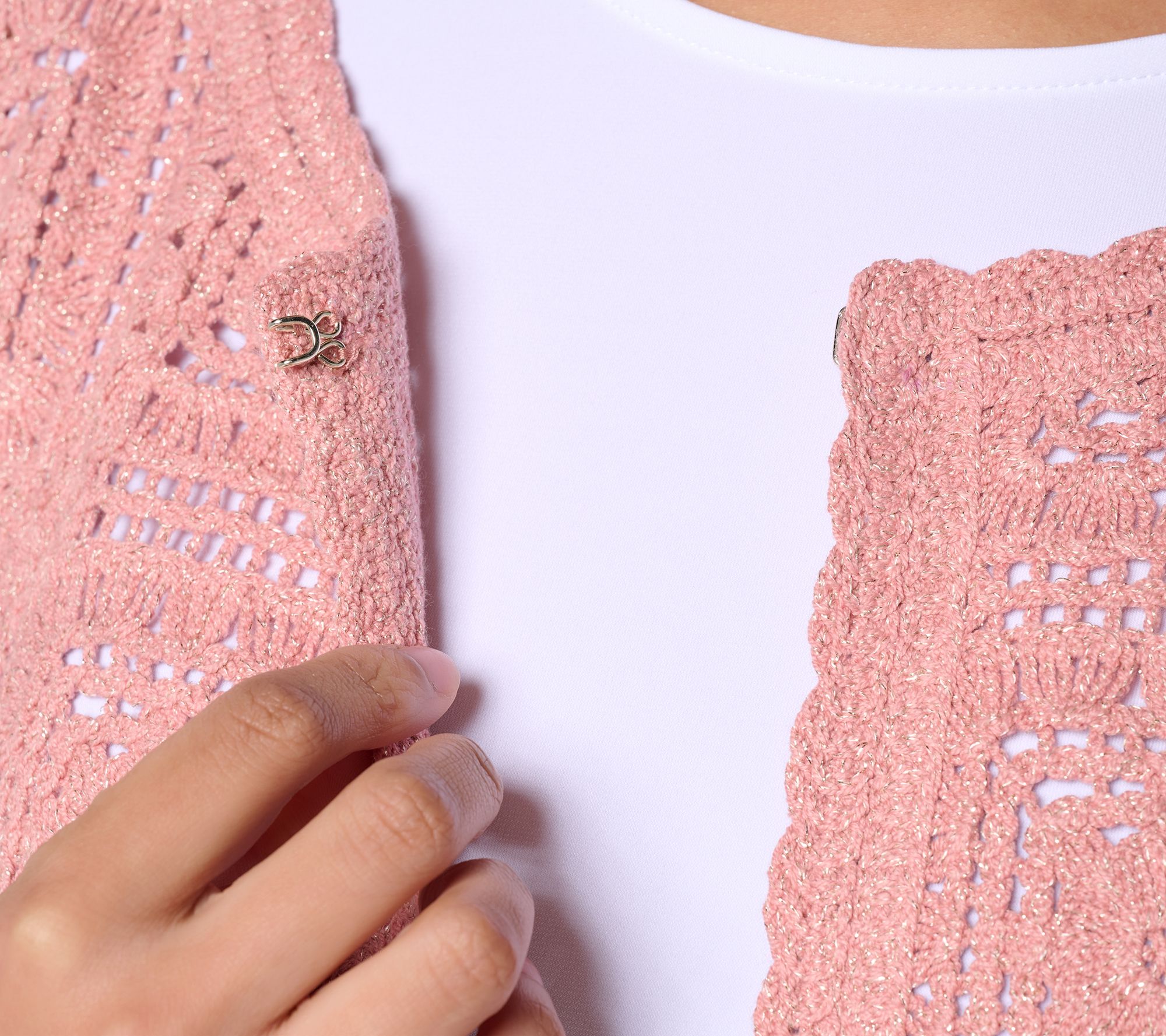 Finally, a topper worthy of all your favorite tanks, tees, and blouses. This metallic crochet lace shrug is beautifully fashioned with braided stitching, 3/4-length sleeves, and hook-and-eye front closures. From Susan Graver.