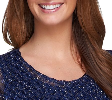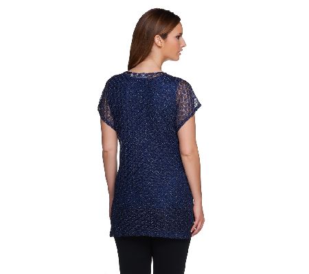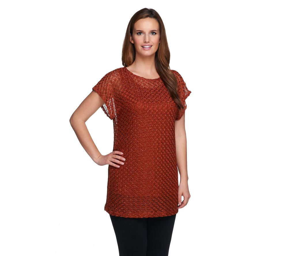 Two lovely layers for endless possibilities. Featuring a metallic lace tunic and a solid, scoopneck tank, this Susan Graver duo creates a light, airy look you'll appreciate throughout the seasons. A bateau neckline and extended sleeves define the graceful silhouette. From Susan Graver.
