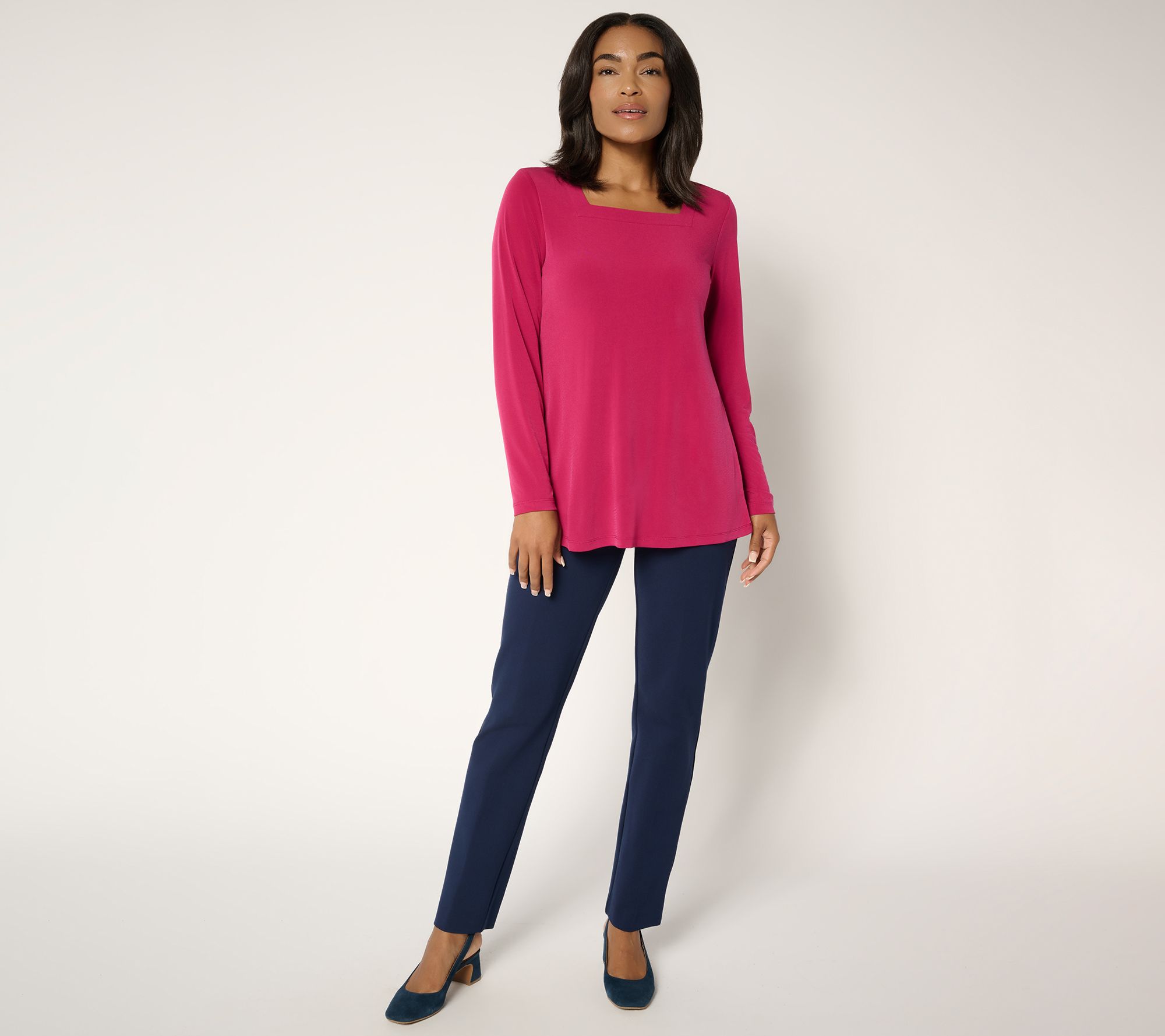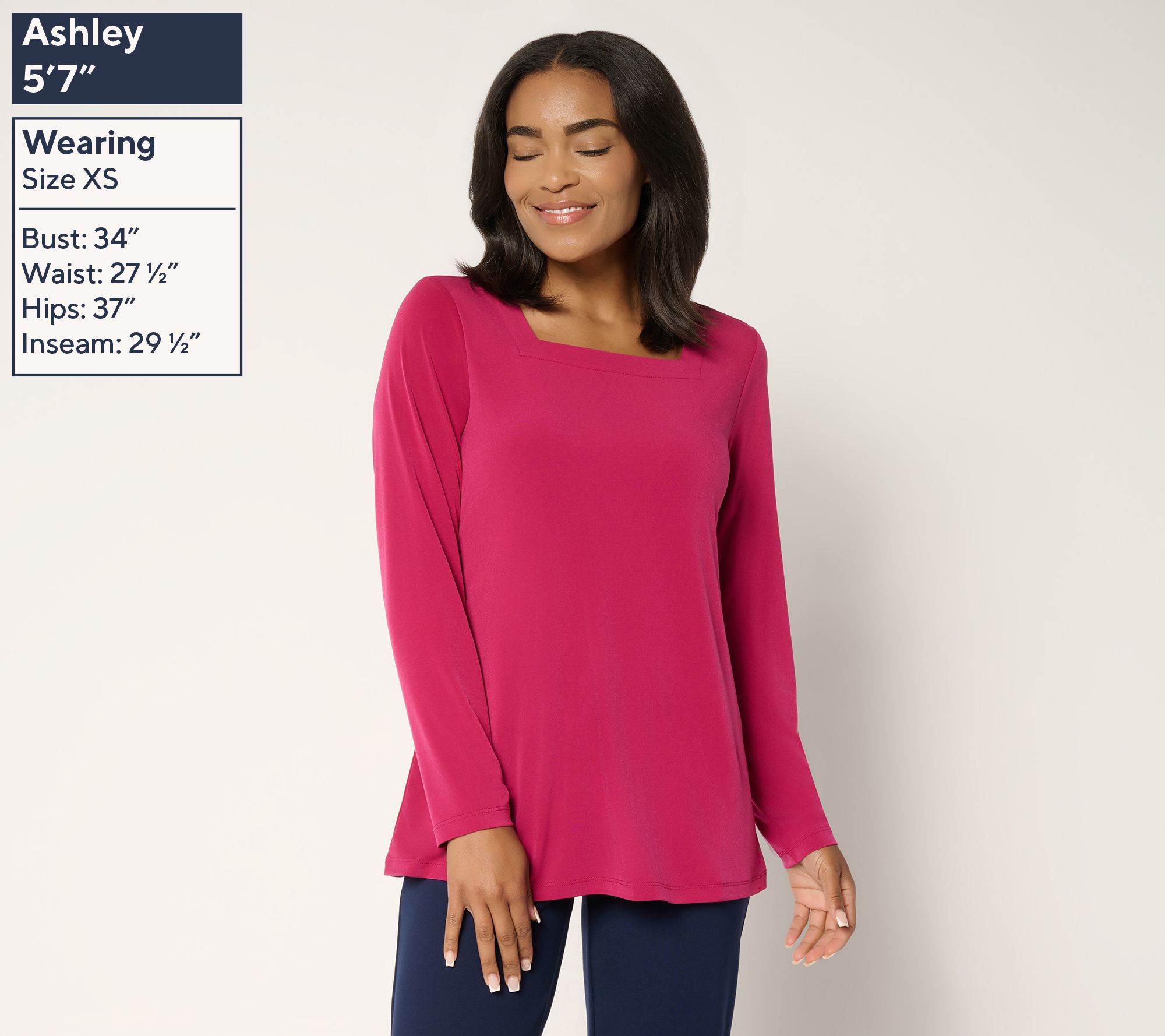 Find easy outfit inspiration for your weekday plans with this Liquid Knit® top. Its trend-right square neckline is the ideal frame for a favorite necklace or pretty scarf, while its versatile shape works as well with tailored pants as it does with denim or skirts. From Susan Graver.