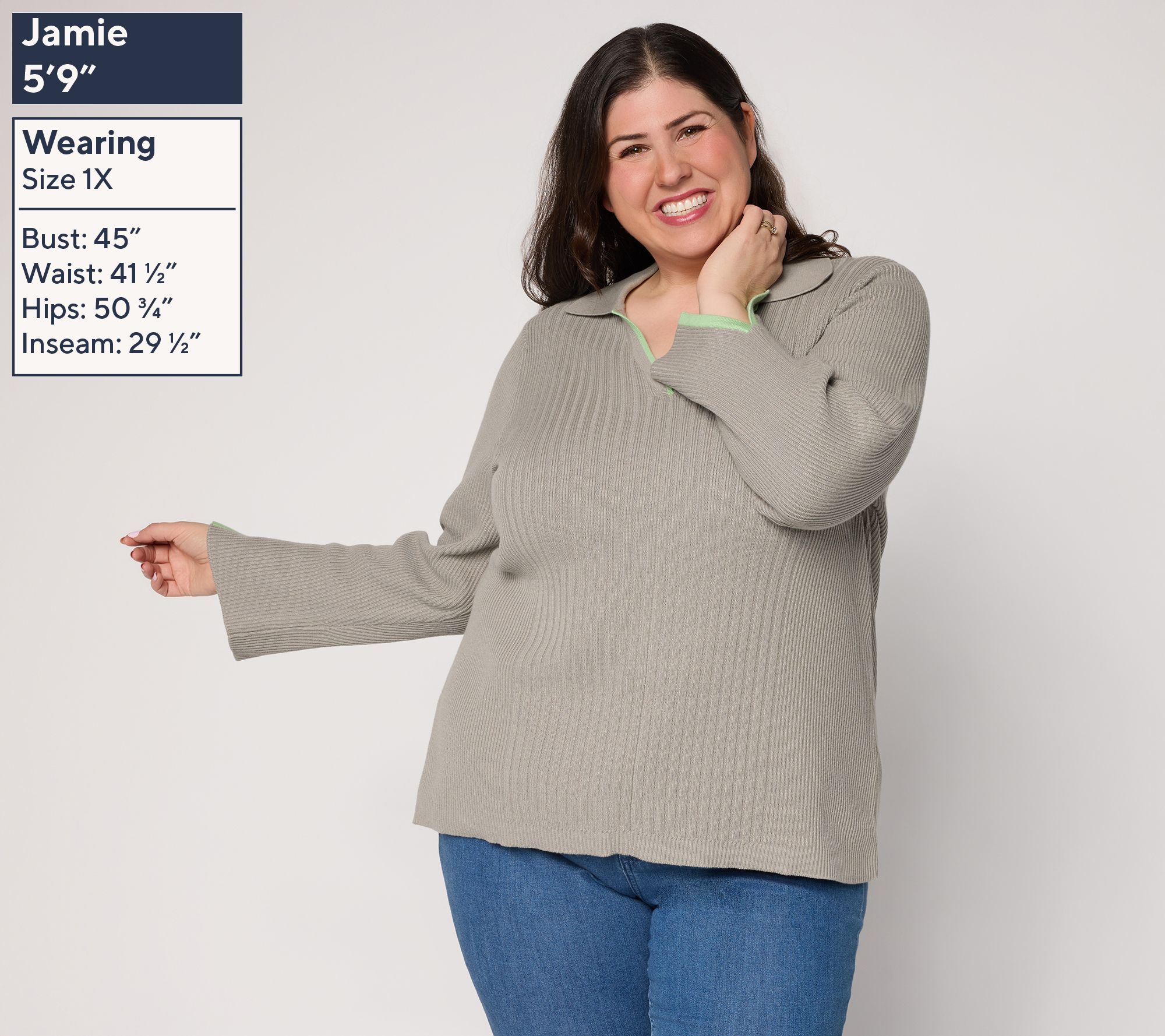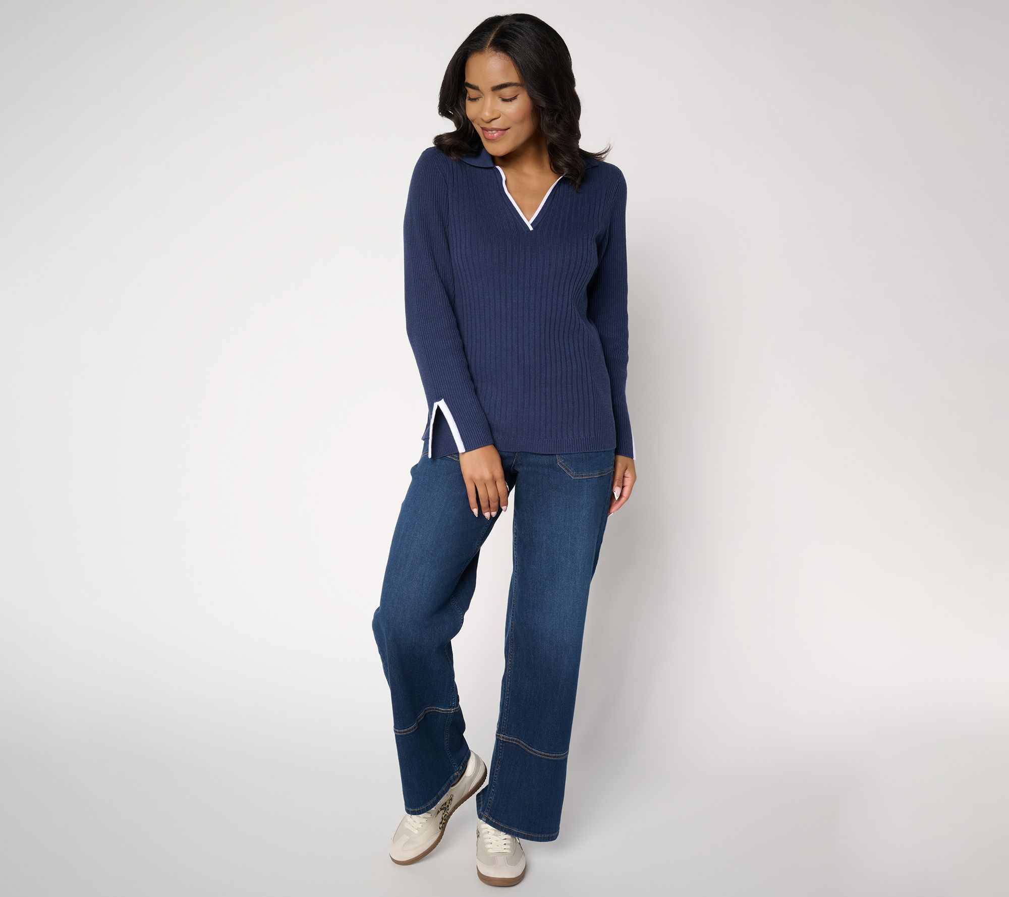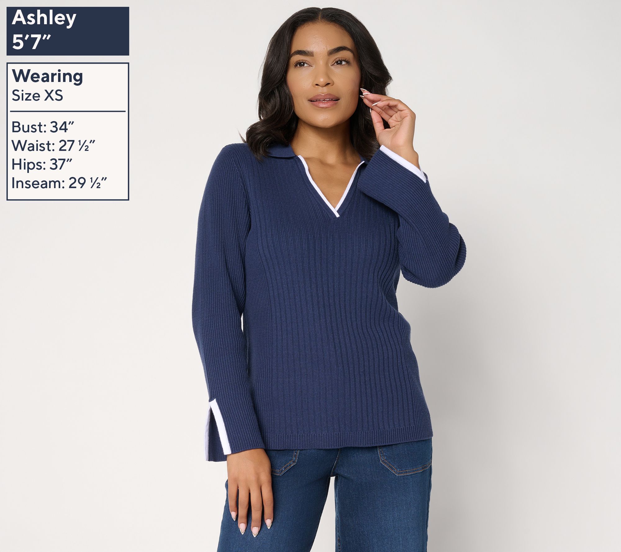 When an everyday sweater just won't do, Susan Graver pulls out all the stops with this polished pullover. Modern charm takes center stage with contrast tipping at the neckline and sleeve vents. A refined collar and gentle ribbing finish off this cotton-rich V-neck with confidence. From Susan Graver.