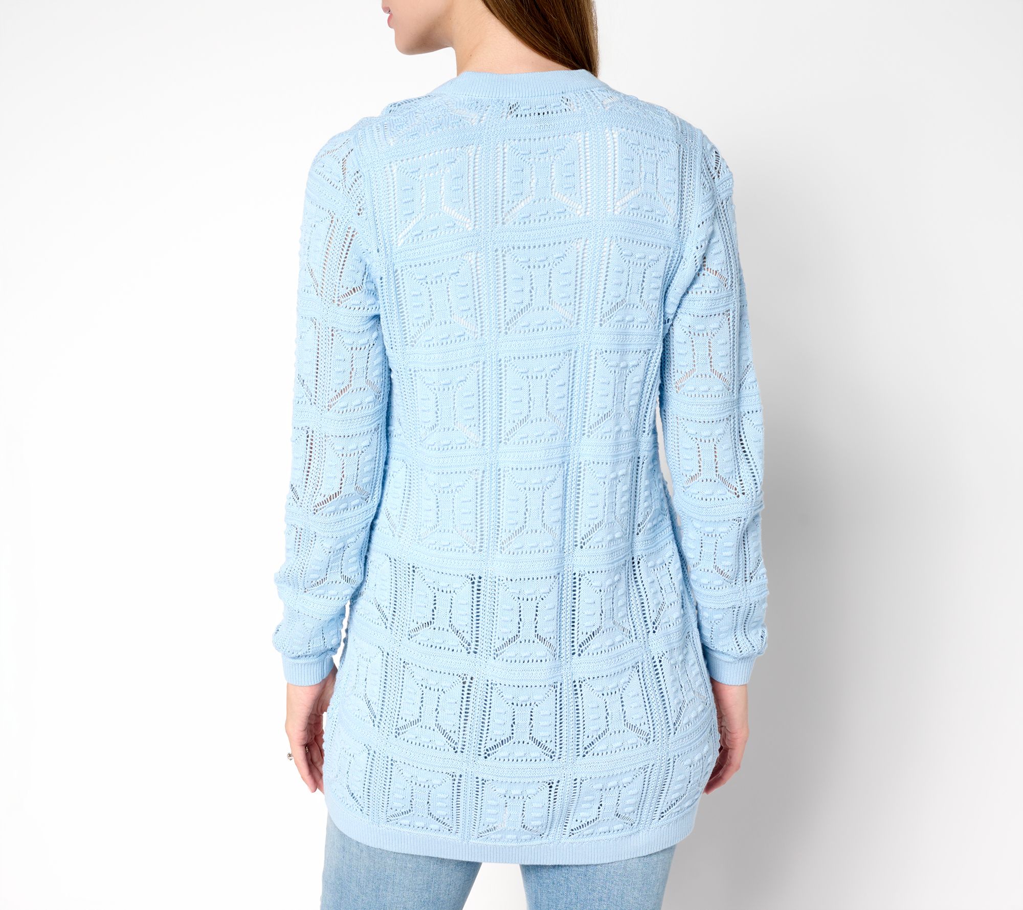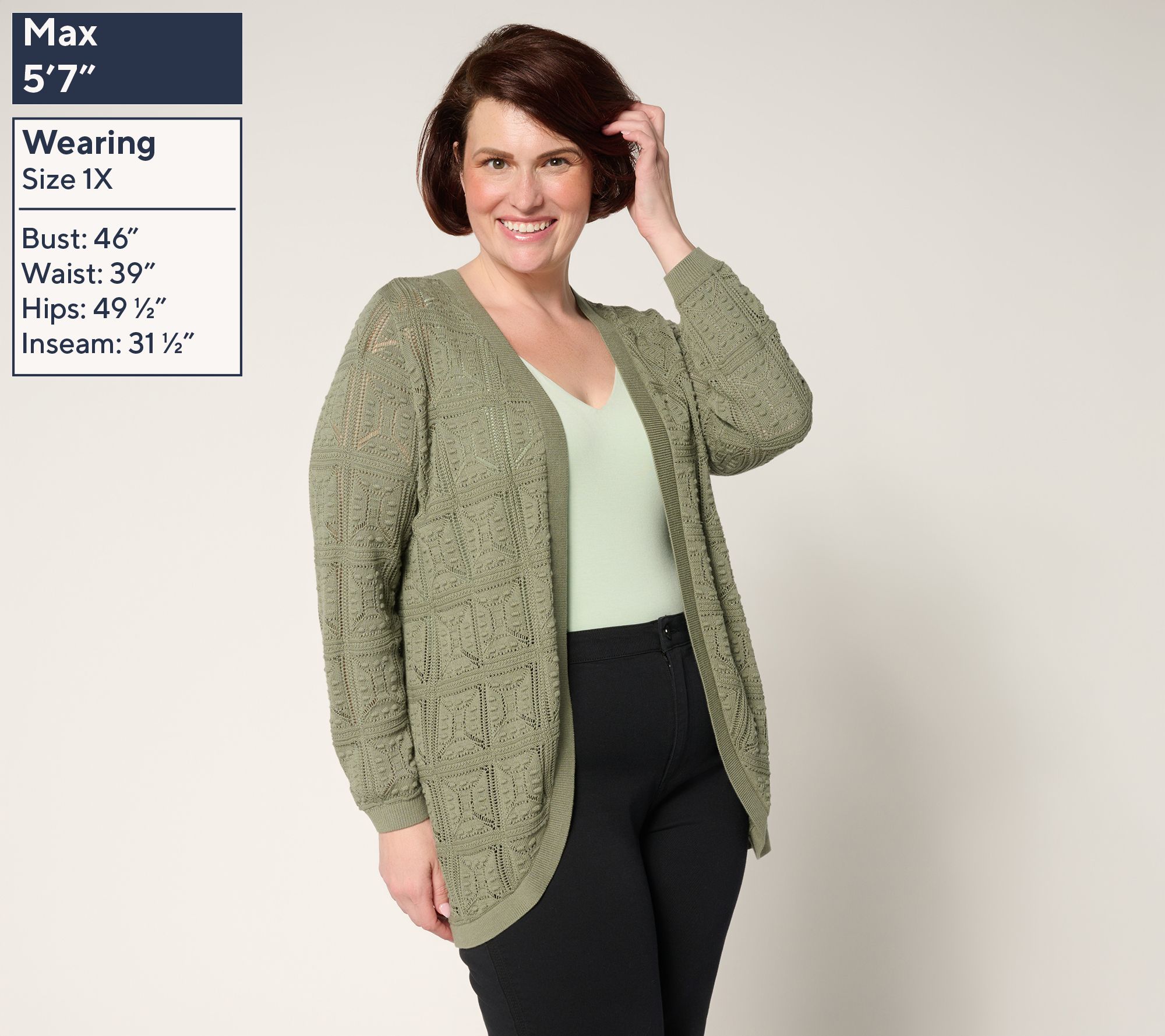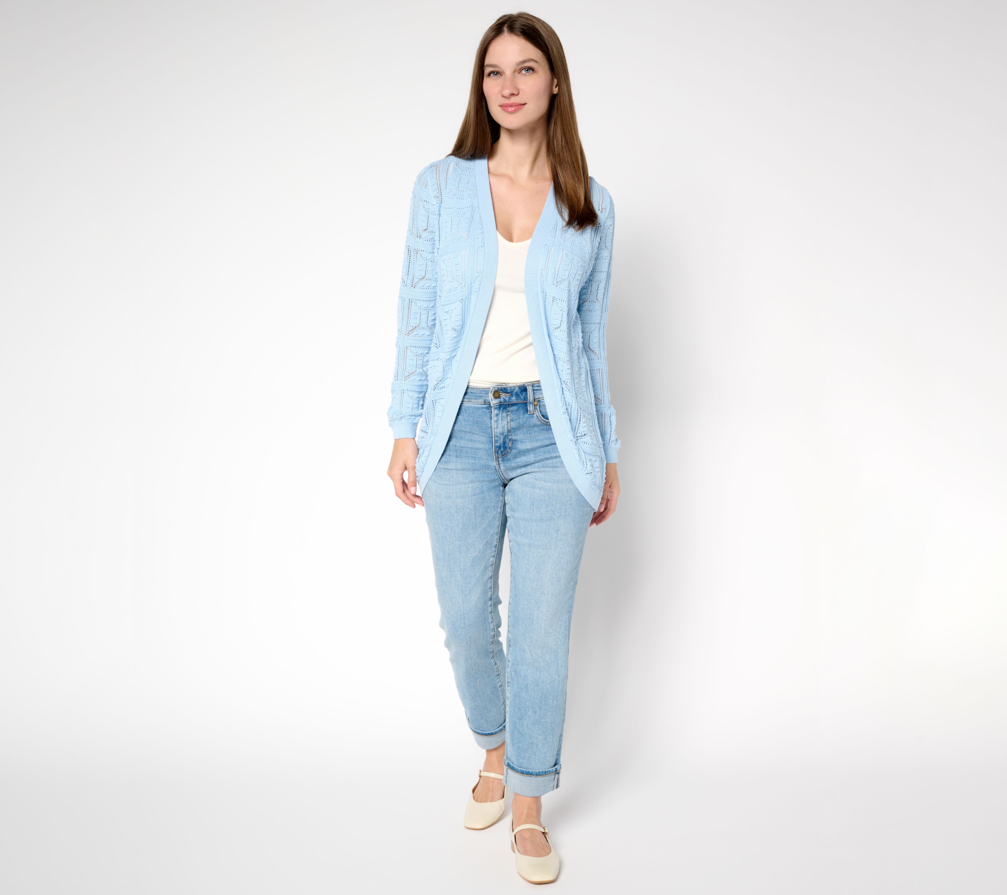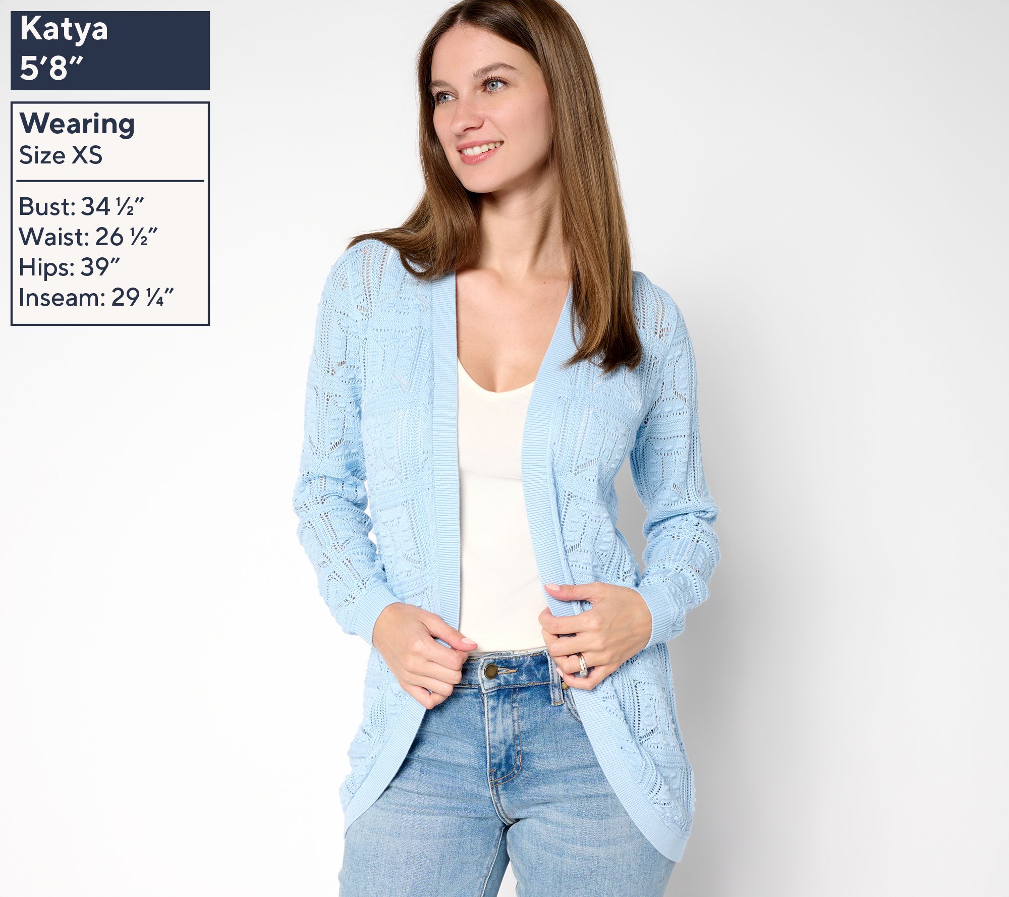 Whether it's layered over a dress for a dinner date or paired with jeans for a stroll through the park, this cardigan adds effortless elegance to any moment. Signature curved front panels and ribbed trim give the sweater its fresh, modern appeal, while the open front makes it simple to slip on and go. From Susan Graver.