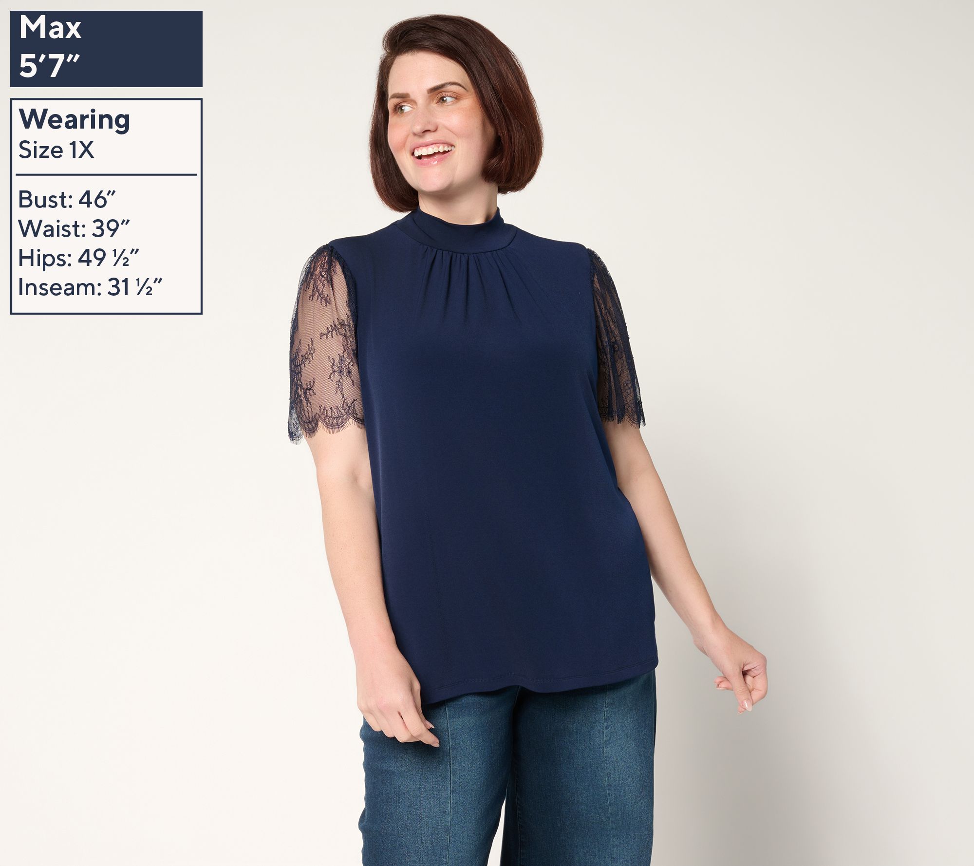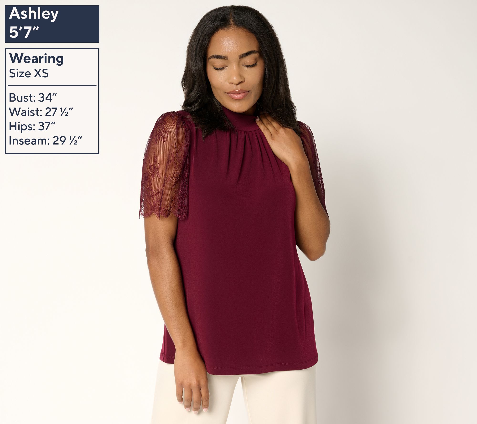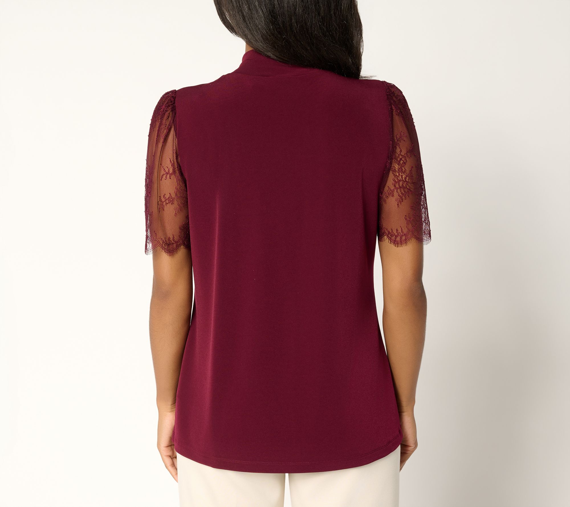 • Features: mock neckline, pullover style, dyed-to-match and slightly fuller lace sleeves with scallop detail at sleeve opening, spot shirring at front neckline, straight bottom hem