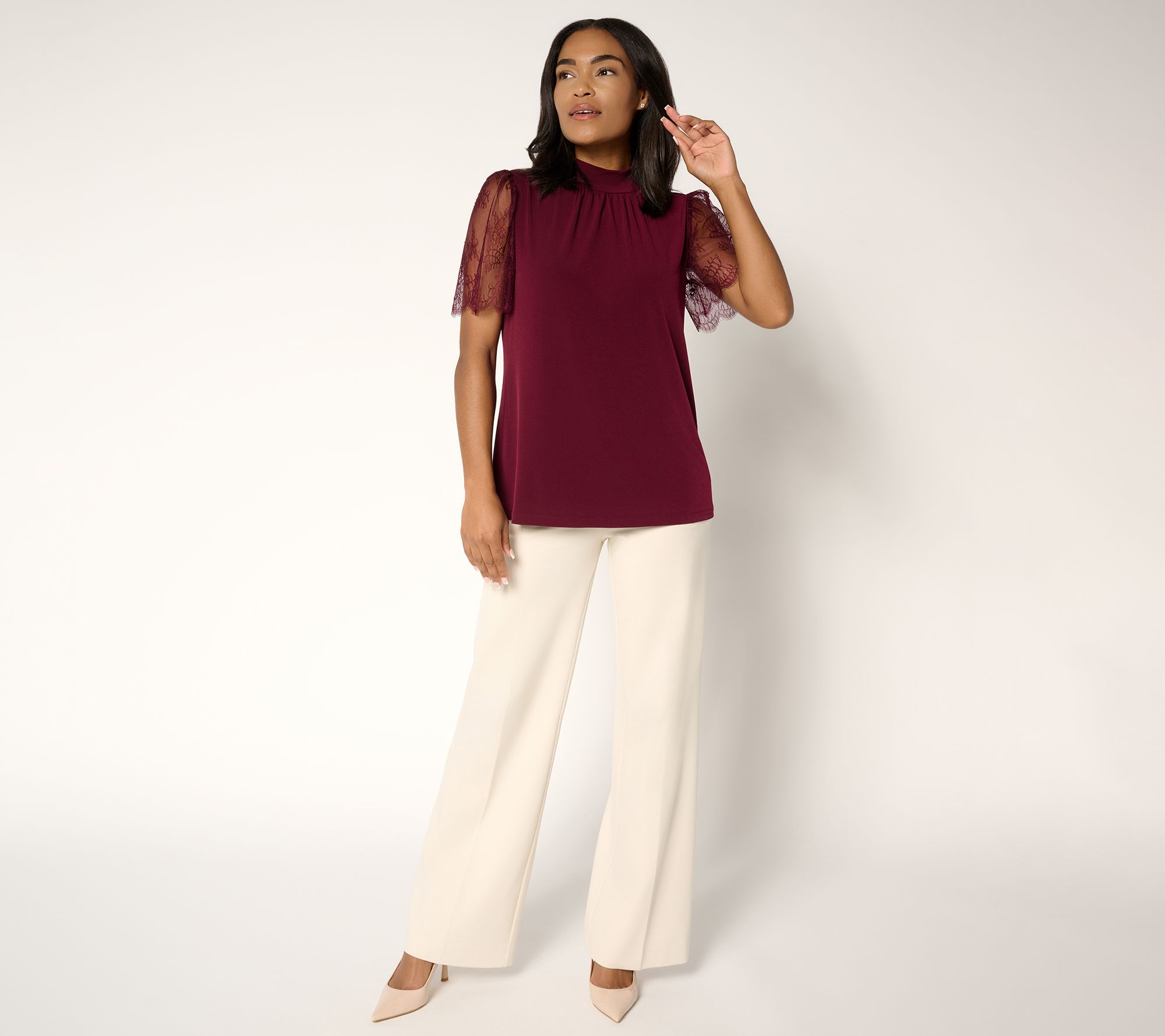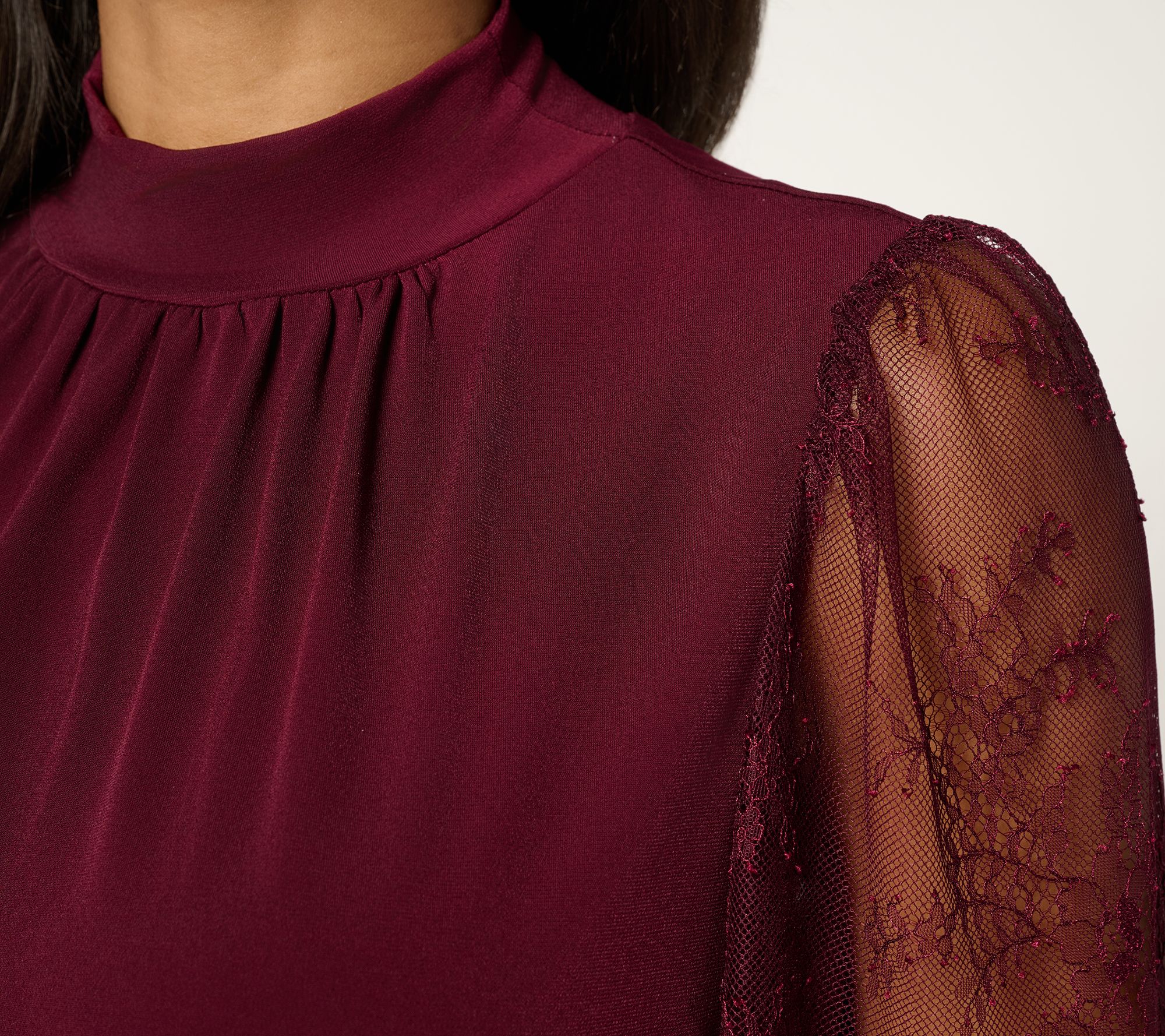 Susan Graver Occasions Liquid Knit Mock Neck Top w/ Lace Sleeves