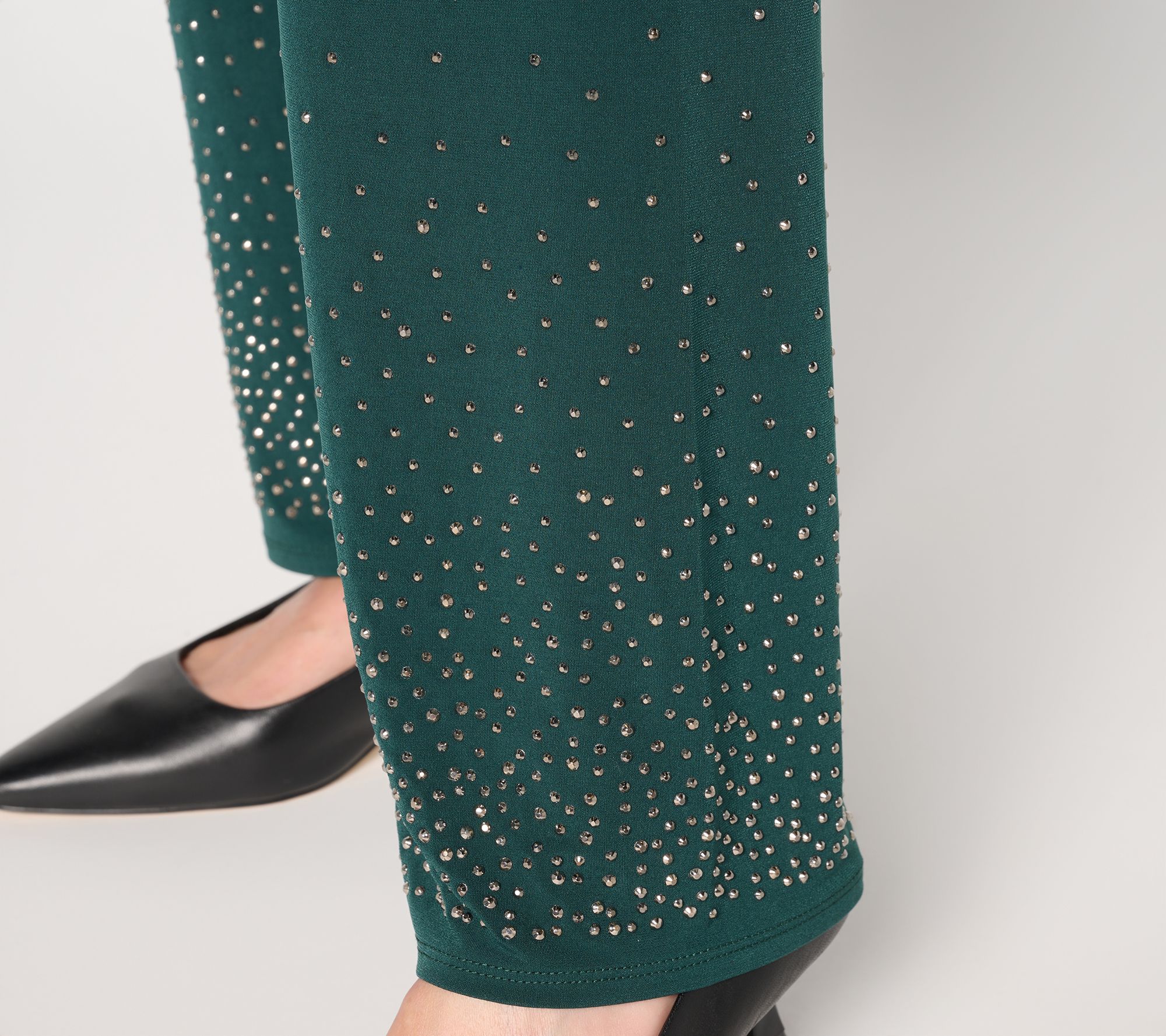 You're party-ready! A dusting of embellishments begin up top on these Liquid Knit® pants and slowly dazzle downward, ending in a concentrated constellation of sparkle at the leg opening -- exactly the excitement your 'fit needed to rock the room! From Susan Graver.