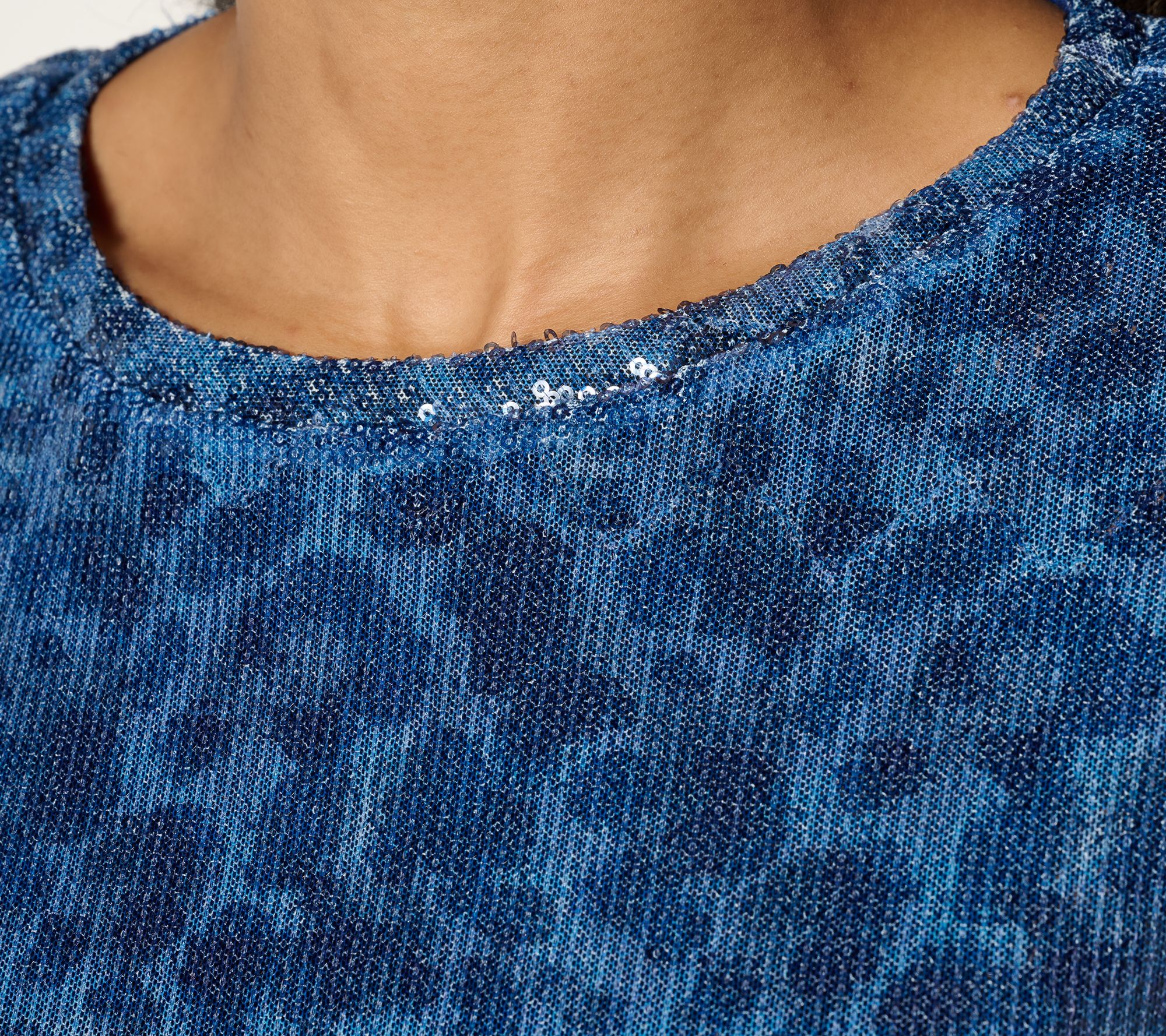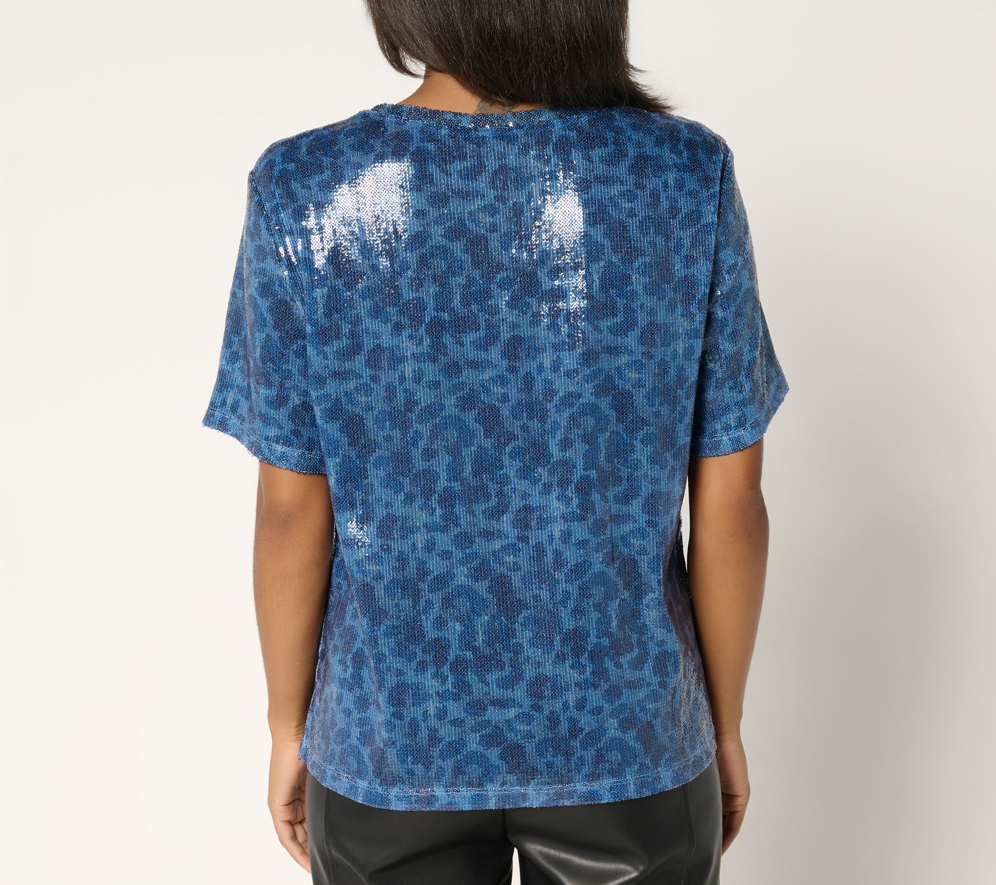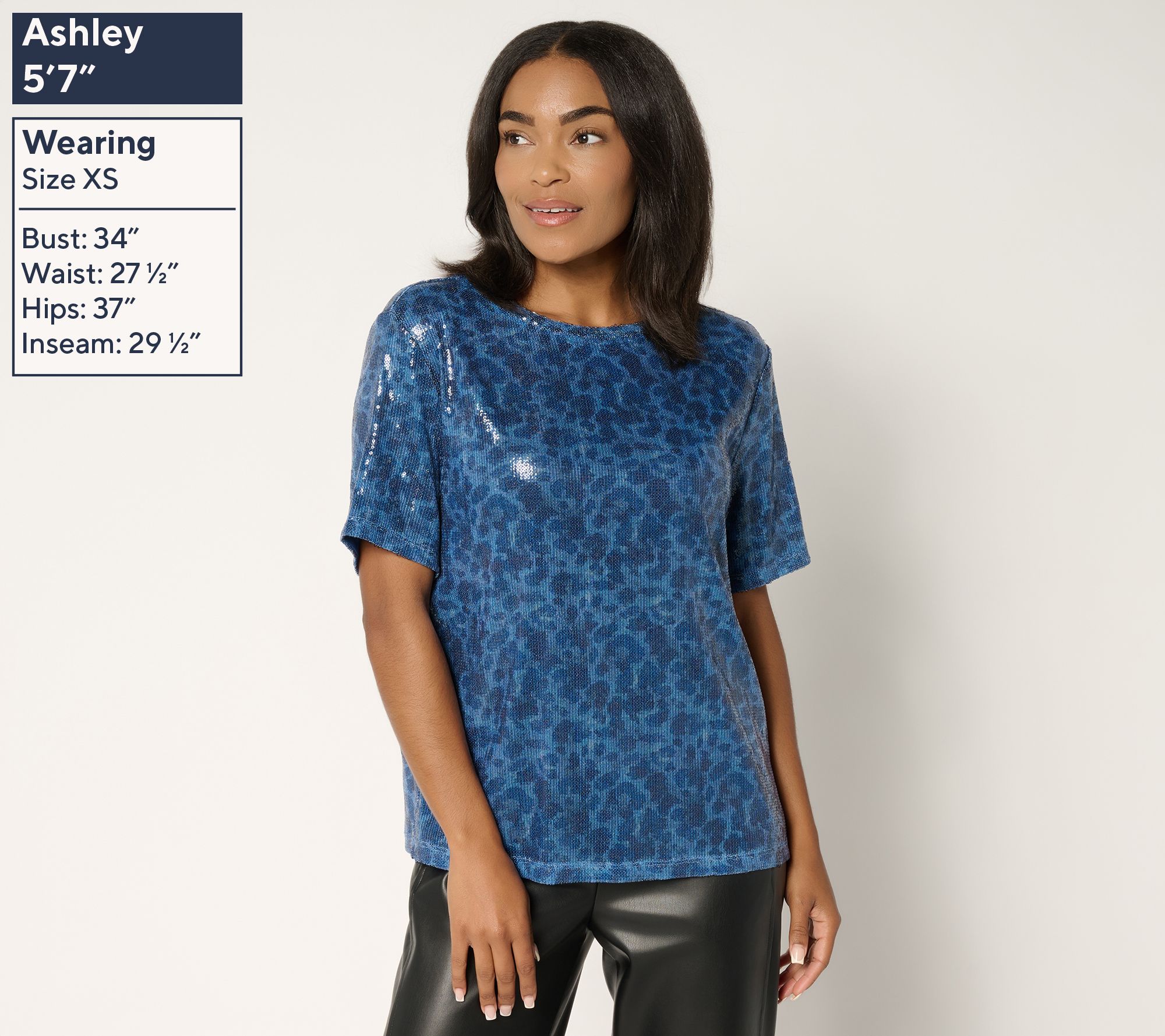 Mix, mingle, and sparkle -- through birthday celebrations, dinner parties, and holiday gatherings in this printed sequin top. The knit fabrication provides ease and movement, while shimmering sequins and a full lining deliver standout style and comfort -- whether layered beneath a jacket or worn solo with dress pants. From Susan Graver.