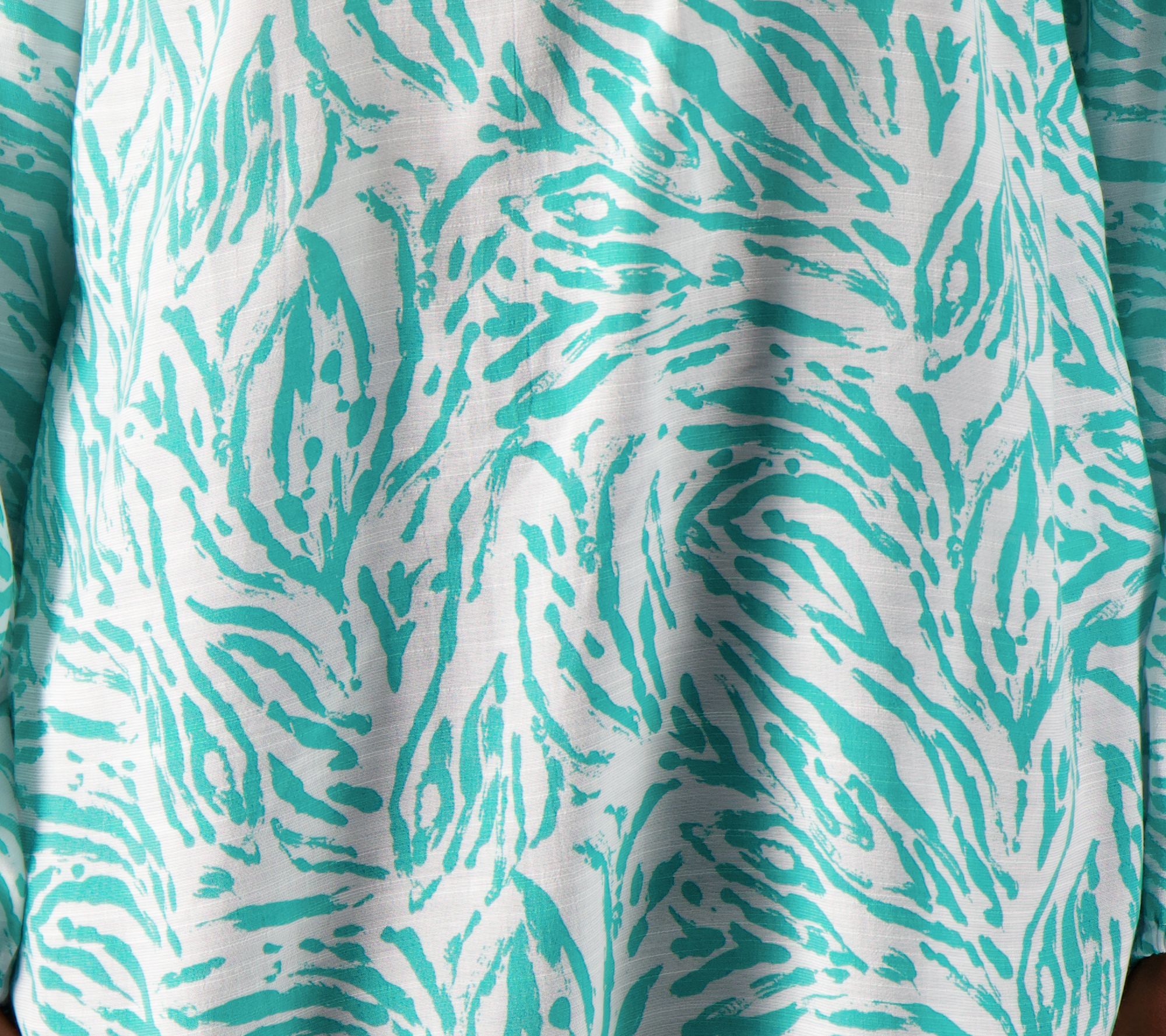 • Features: three-button closure, split Y-neckline, metallic piping trim, curved hemline, elastic encased sleeve opening and bust darts