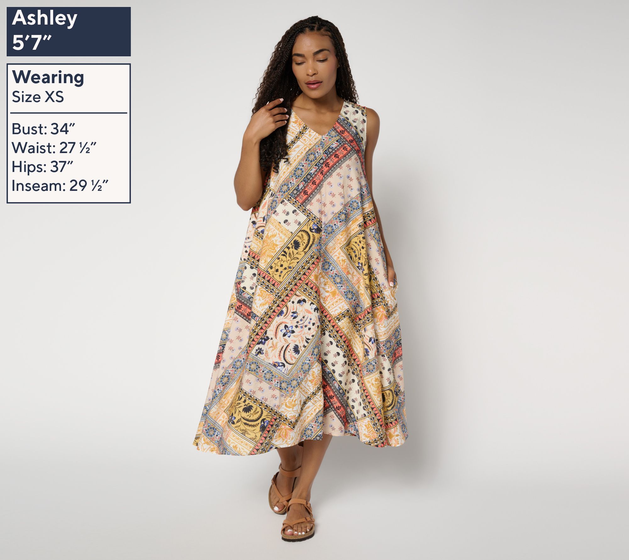 Whether you're strolling through a summer festival or weekend-ing by the water, this vibrantly printed midi dress never fails to make an impression. And hooray -- it has pockets! From Susan Graver.