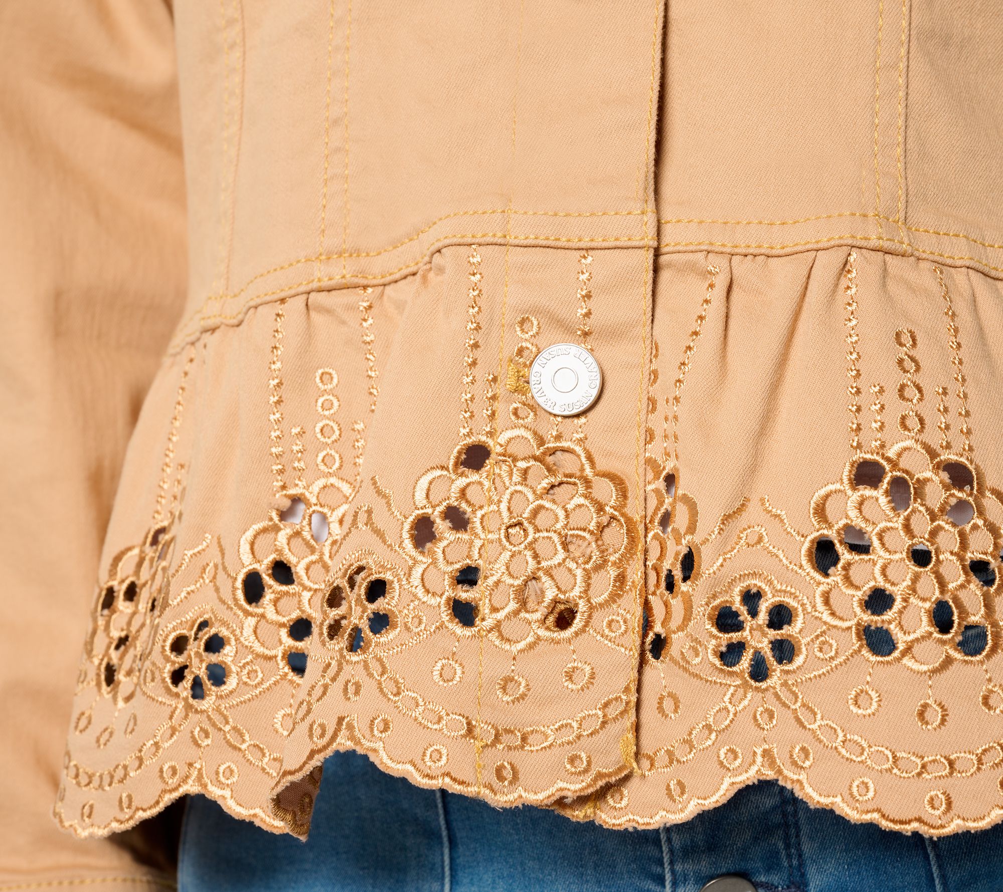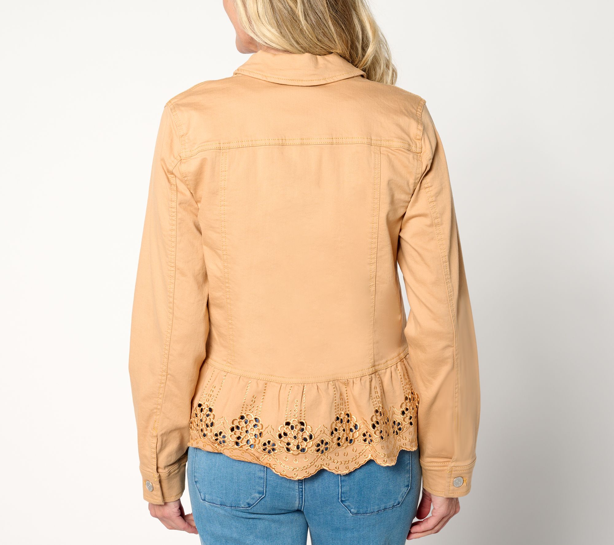 A fresh take on a fashion favorite, this denim jacket combines a peplum silhouette with an eyelet hem to create a luxe yet laid-back look. From Susan Graver.