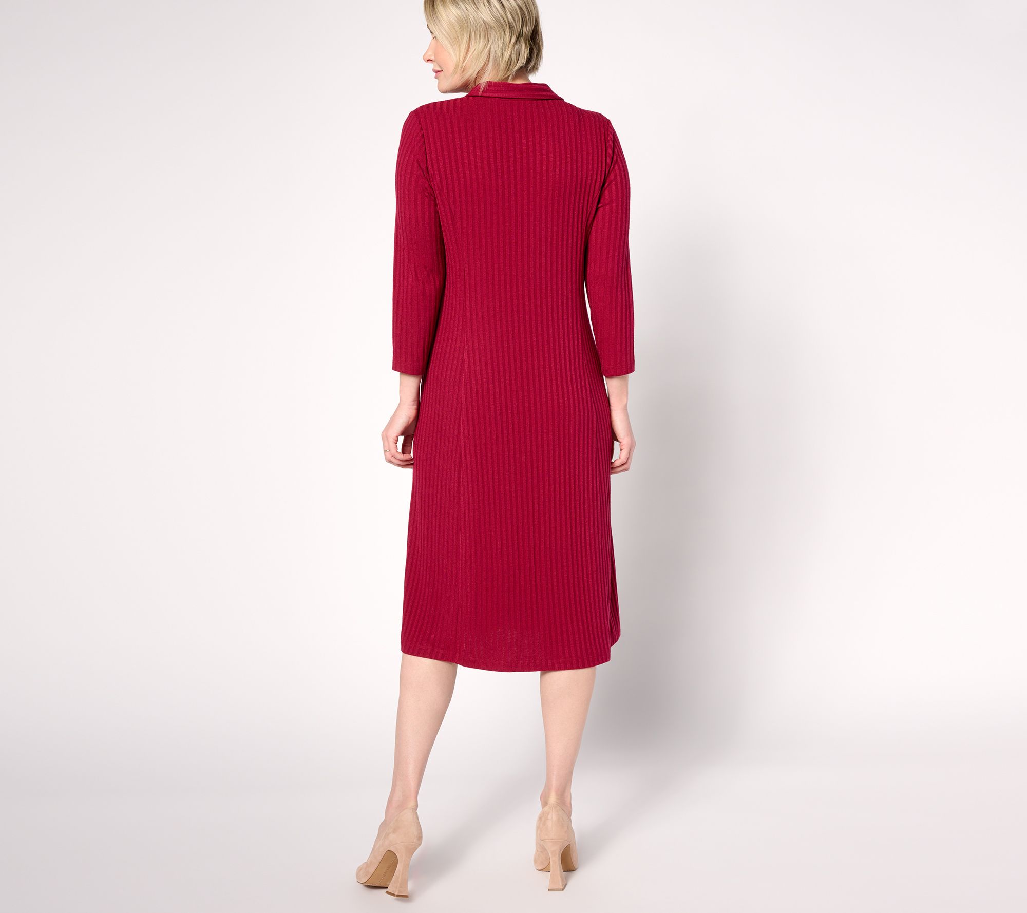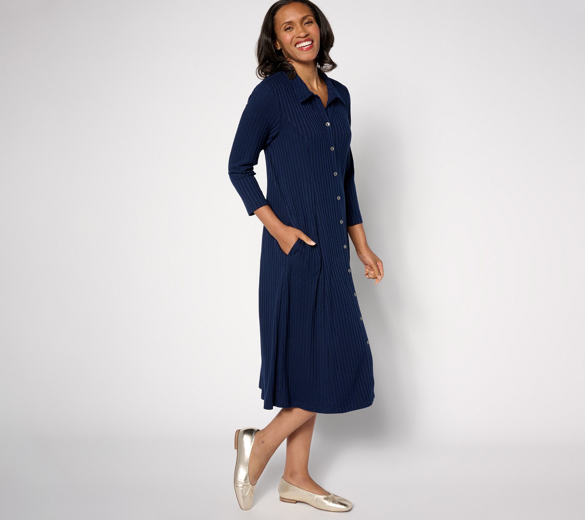 Sashay through the day in this button-front midi dress. The ribbed sweater knit is oh-so comfy, a true testament to your impeccable style. From Susan Graver.