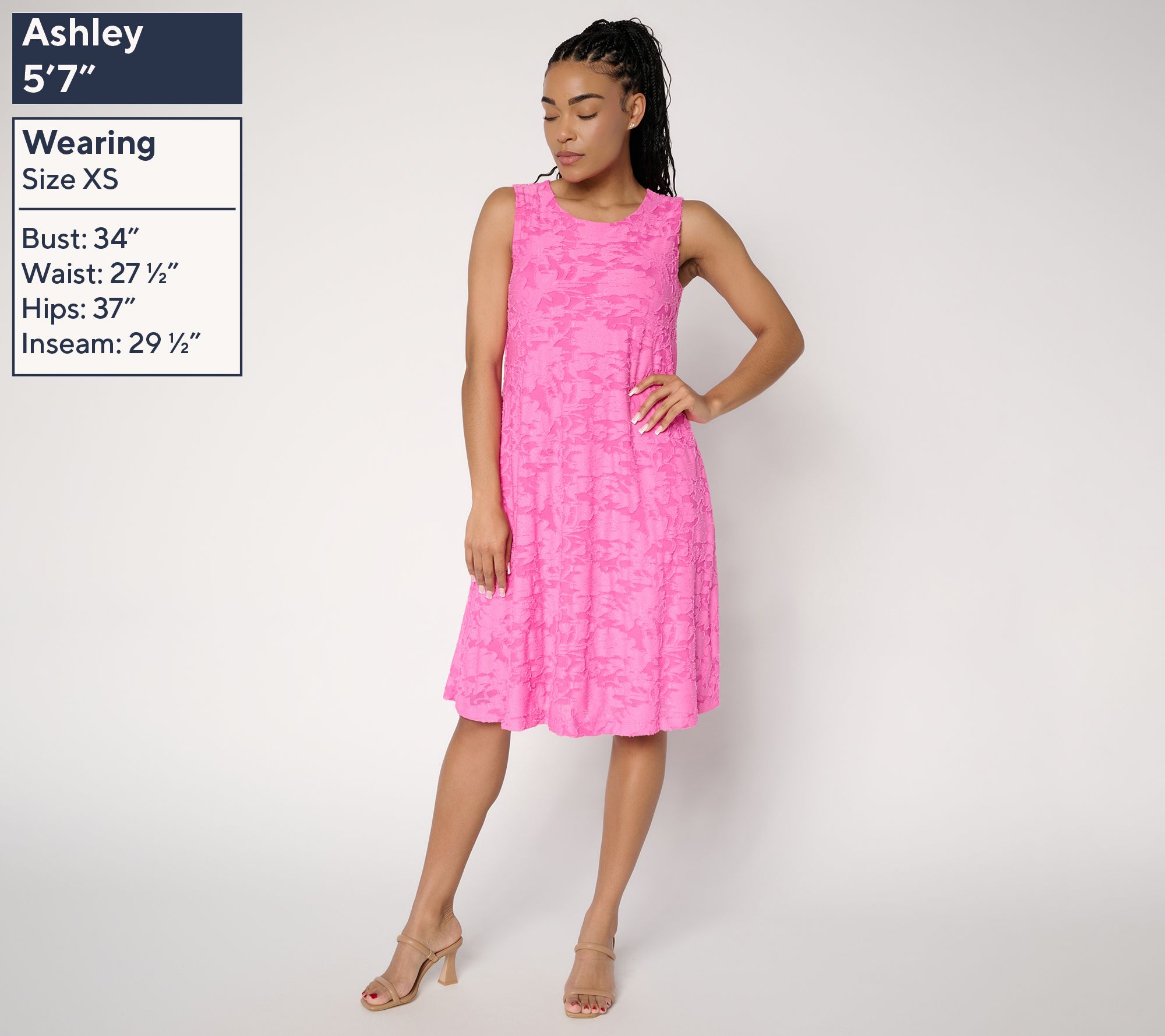 Take a seat at the graduation, mix and mingle at the bridal shower, or bust a dance move at the birthday dinner -- the richly textured yet lightweight fabric never restricts movement and drapes beautifully (and it's fully lined). The universally flattering A-line silhouette skims the body without clinging and flows away from the waist and hips, so you won't have to bother with special shapewear. And the sleeveless style is wide enough at the shoulder for bra coverage (bingo) but also layers like a dream with a denim jacket. Dress it up with heels and jewelry. Dress it down with sneakers or sandals. Either way, you're beautifully dressed (with so little effort). From Susan Graver.