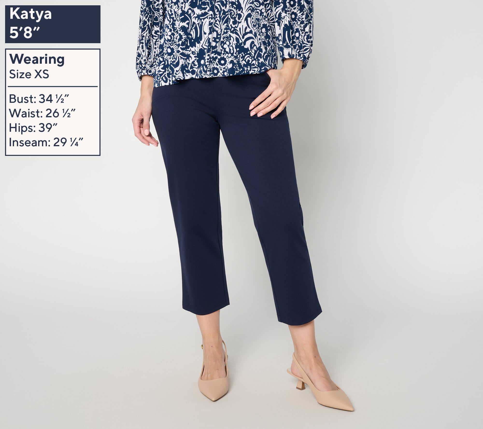 Busy day ahead? Slip into Susan Graver's cropped ponte pants in a warm weather-friendly cotton blend. Easy to pull on and just as easy to wear all day, they keep you comfortable from morning to night -- no rush to change when you get home. From Susan Graver.
