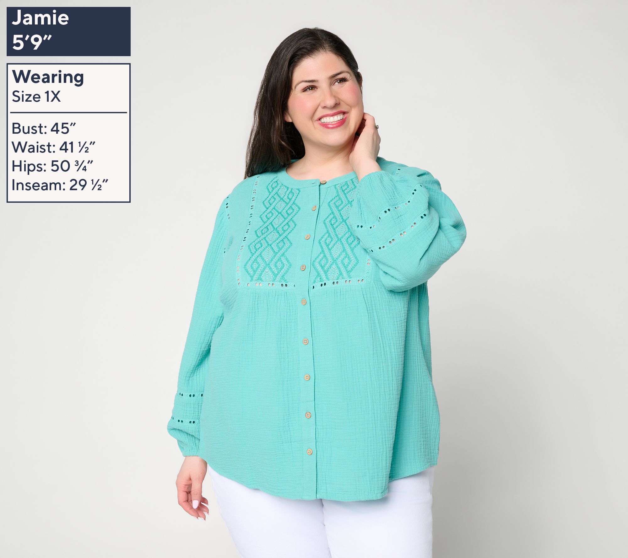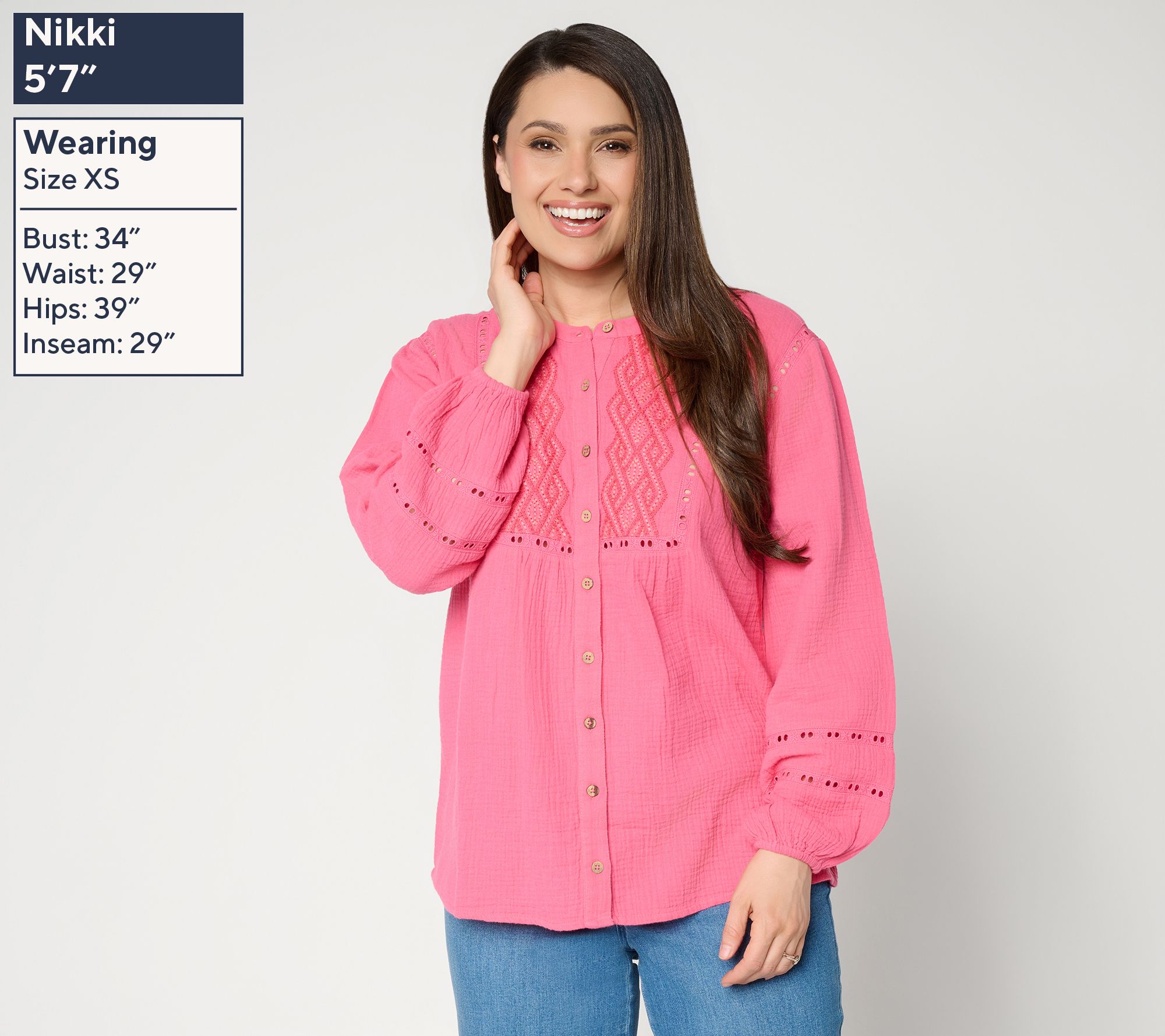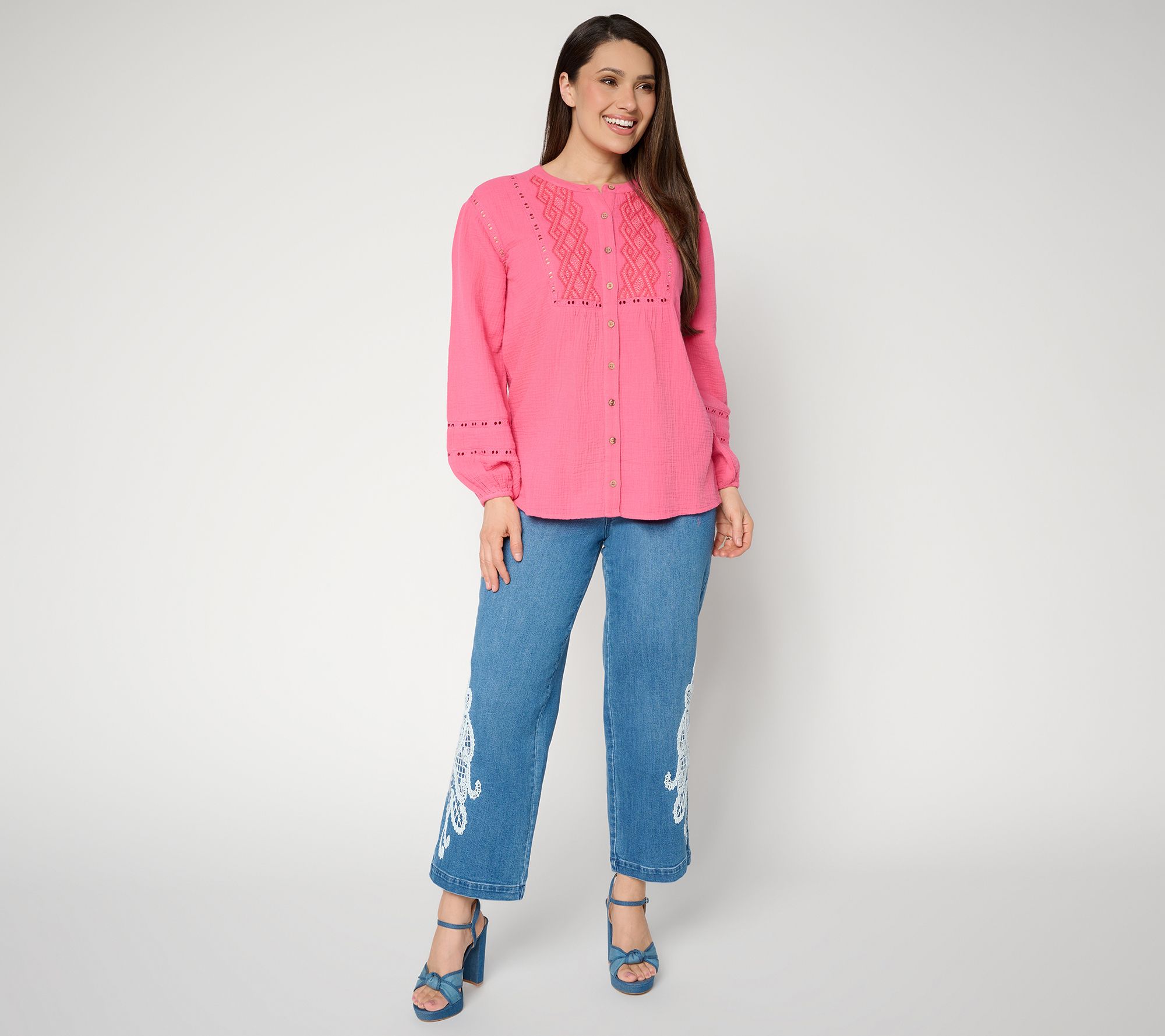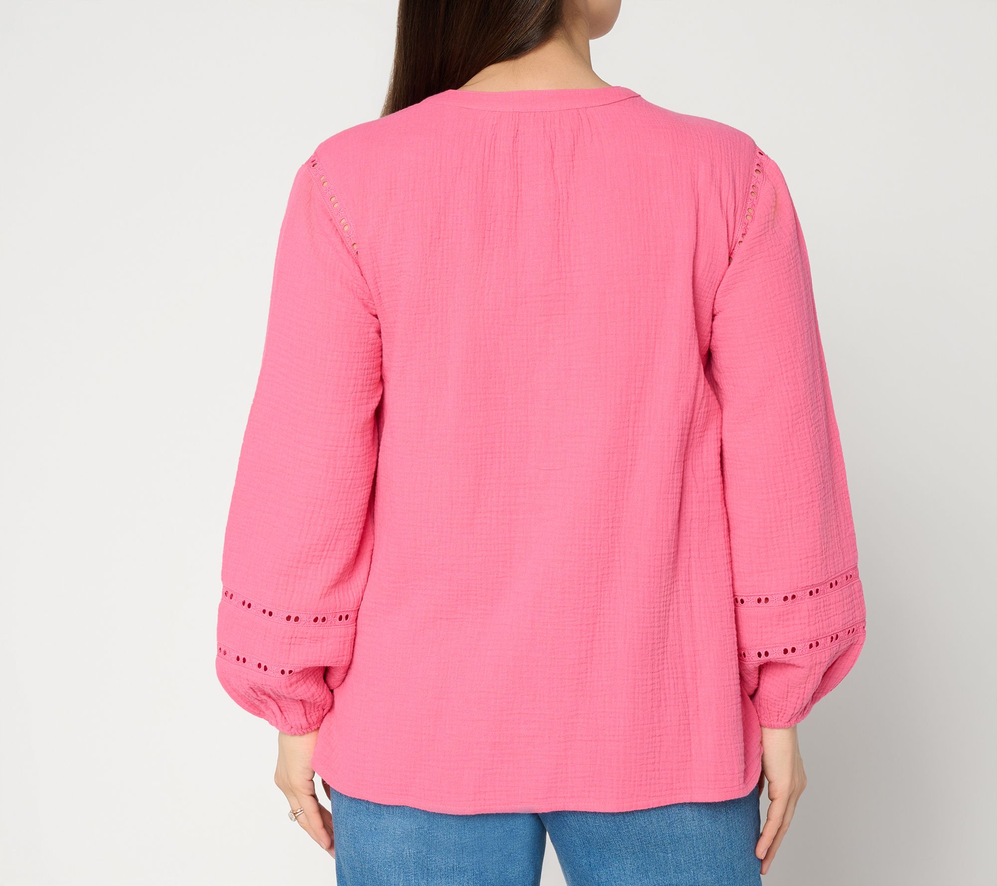 Opt for something a little flirtier and a lot more fun when you wear this cotton-gauze tunic. The embroidery details and eyelet trim add a feminine touch to the flattering top. From Susan Graver.