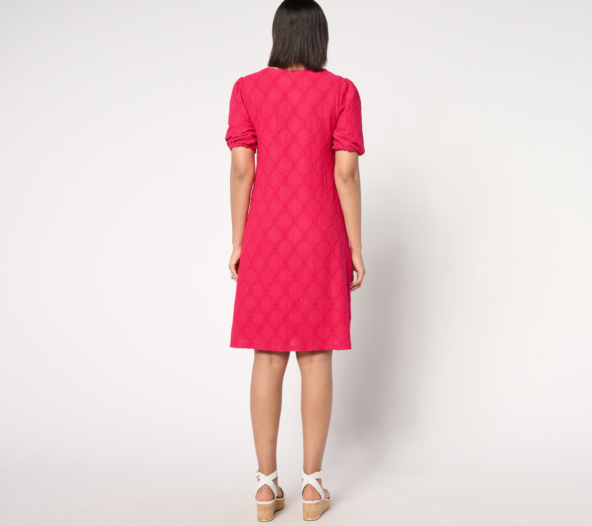 When you're hosting or toasting, this charming knit eyelet dress brings the easy elegance and the moves-with-you comfort (hello, full lining). And its length makes it a winner for the office, too! From Susan Graver.