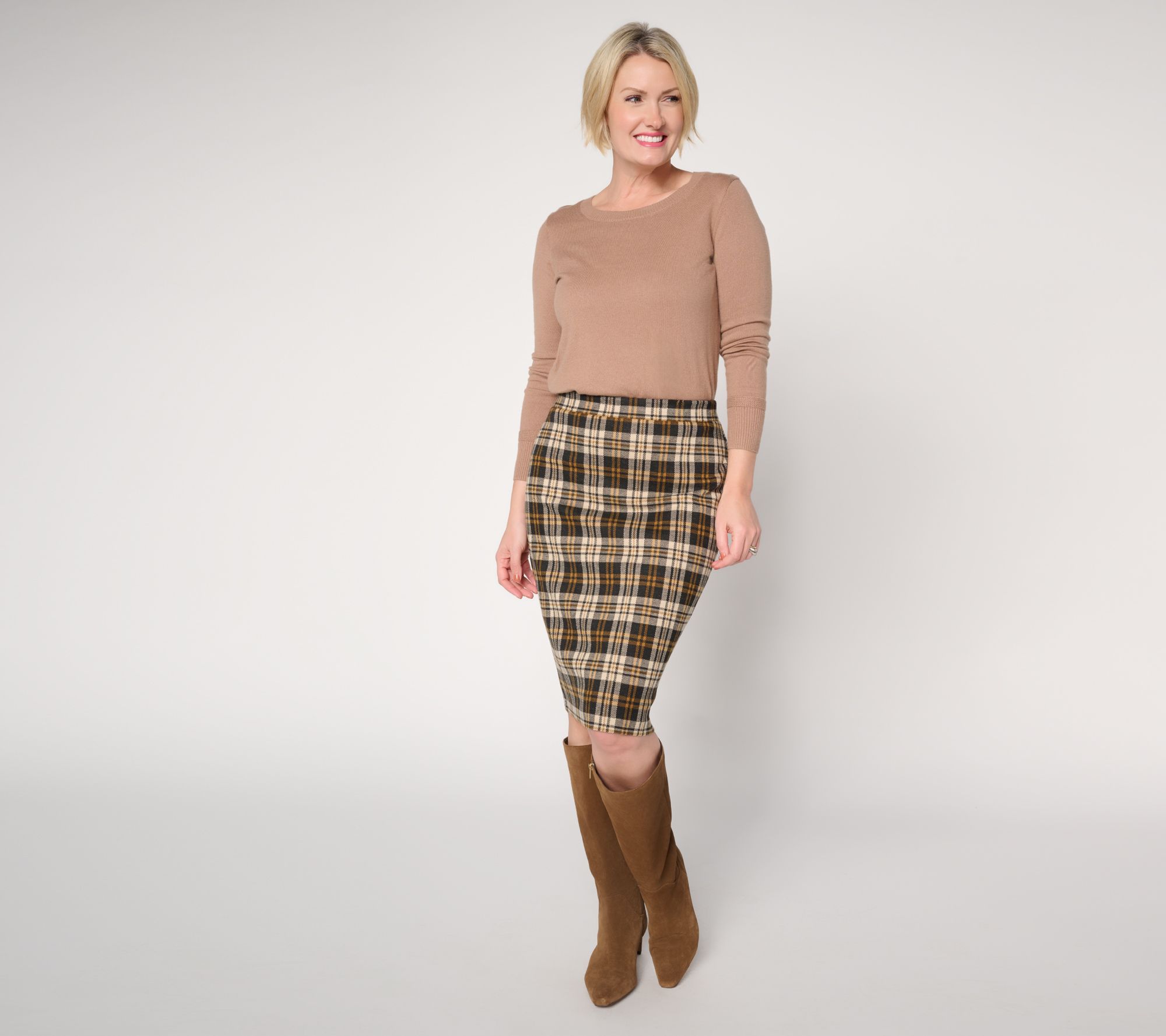 Your favorite tops and turtlenecks get an instant season-smart refresh with the addition of this plaid pencil skirt. The pull-on knit style with built-in stretch keeps you moving through client meetings, carpools, appointments, and dinner dates without a hitch. (It's that comfy.) From Susan Graver.