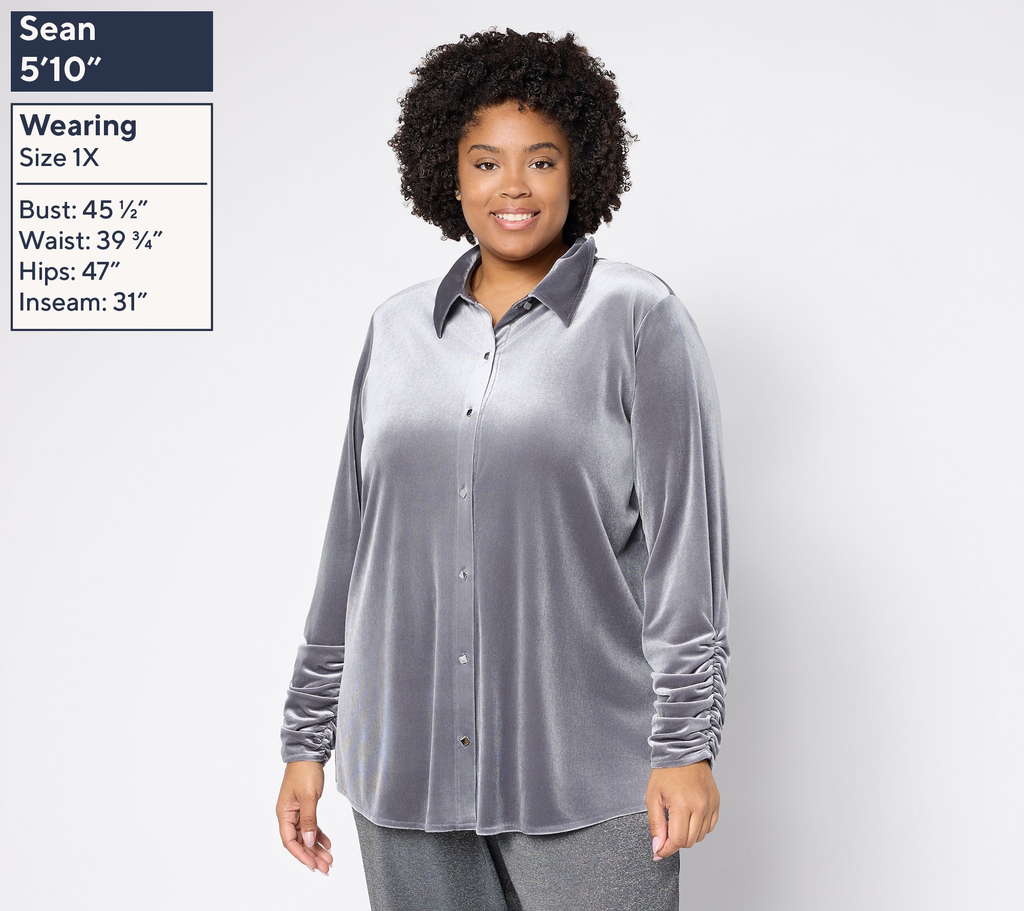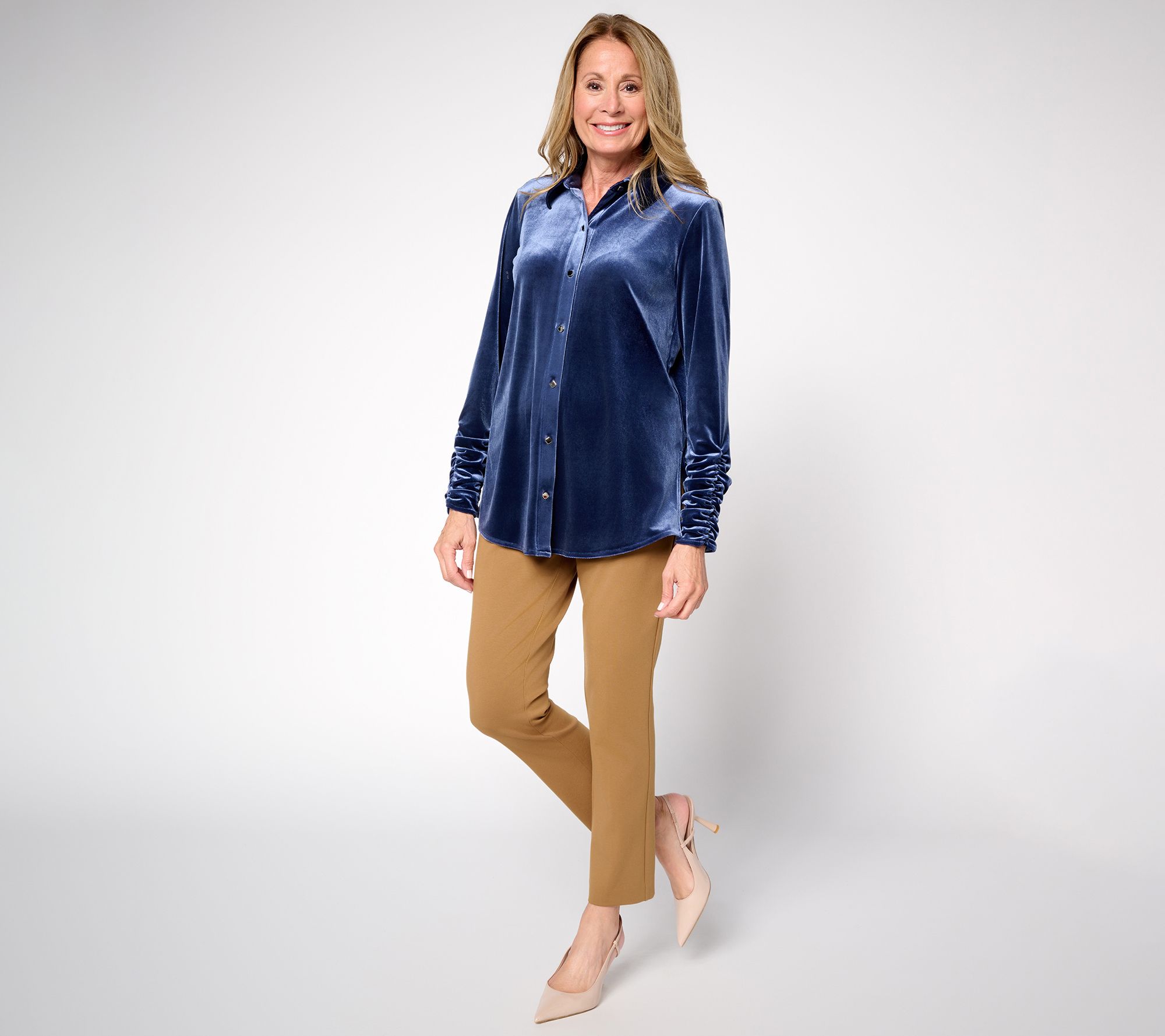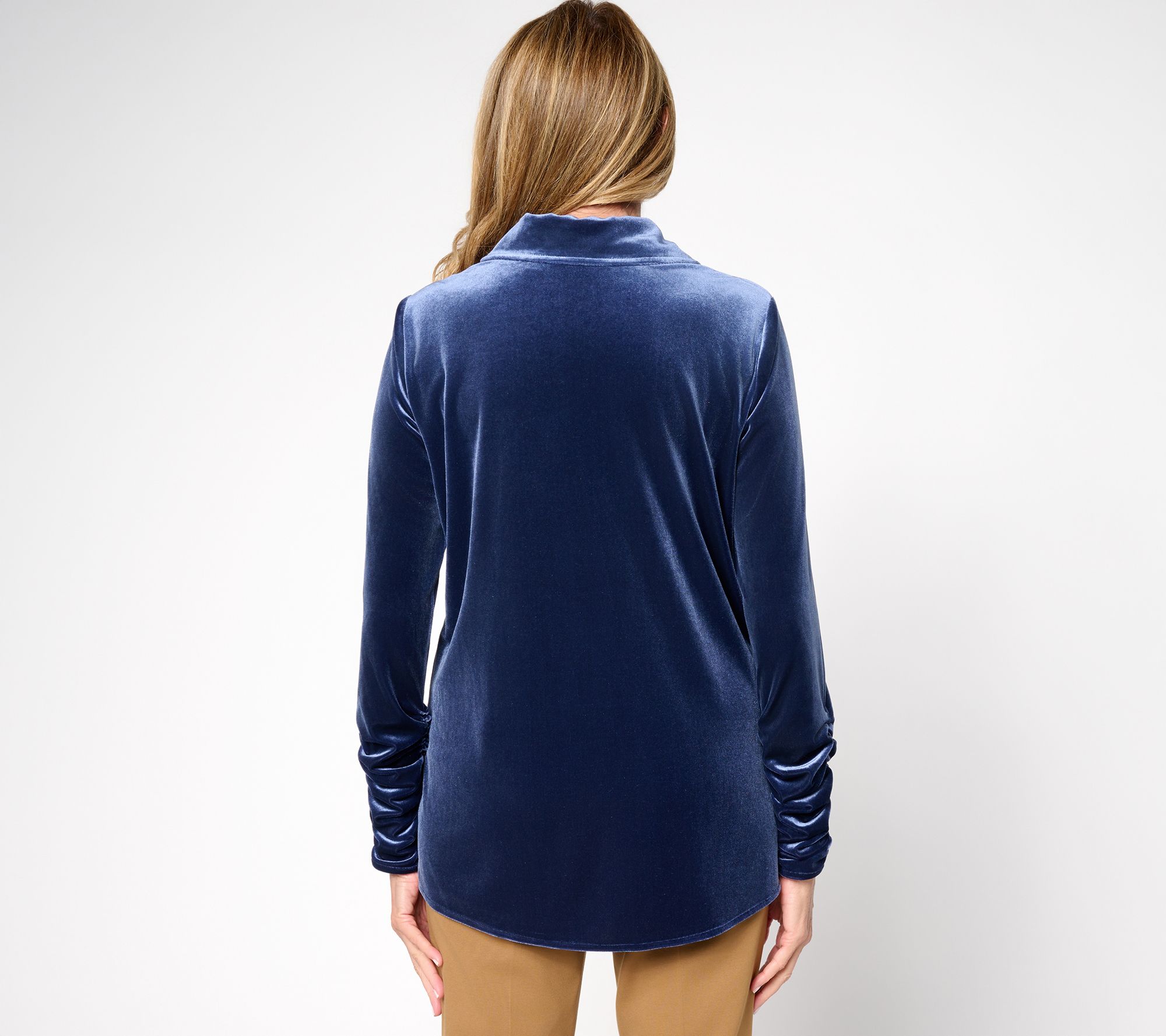 This knit velvet top is the ideal piece for completing that special outfit. Button it up for a sleek silhouette, or keep it open for a layered look. From Susan Graver.