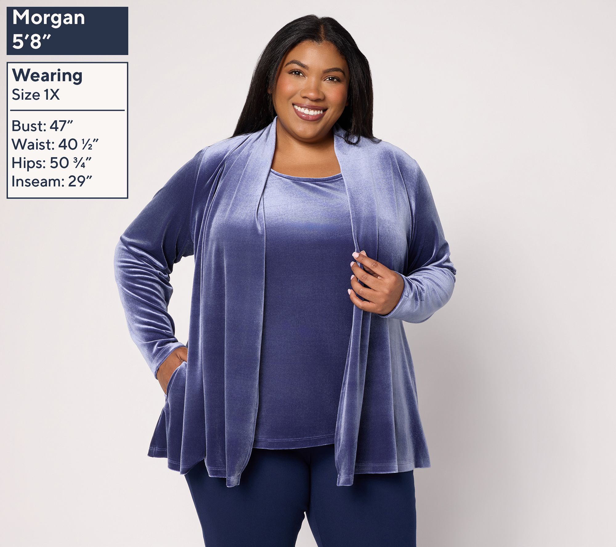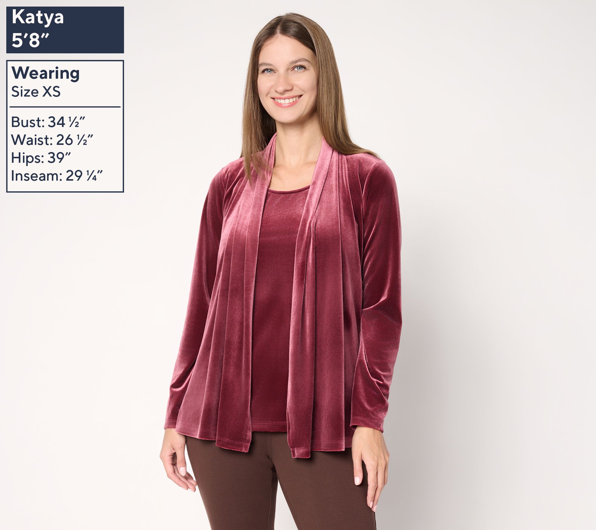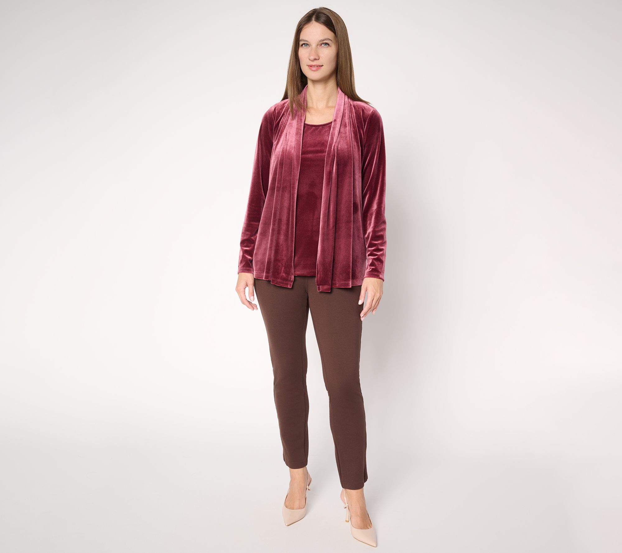 This pair is party-ready! Susan Graver has curated a winning combo of knit velvet separates that stun for daytime drama or dressy evenings out. Wear each polished piece separately or mate them with a matchy-matchy vibe in mind. They bring soft texture and a subtle shine (plus a whole lotta fun) to any 'fit. From Susan Graver.