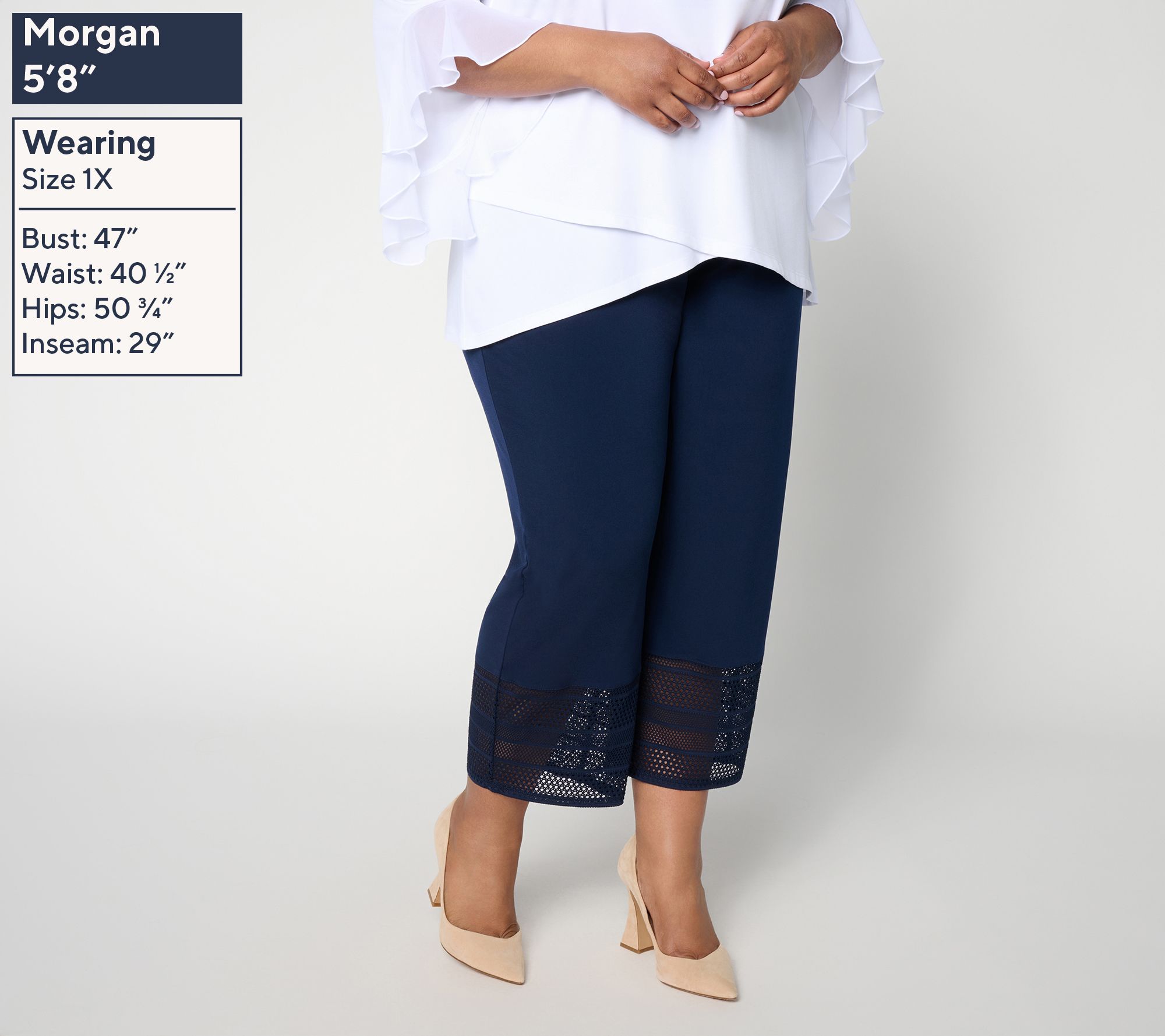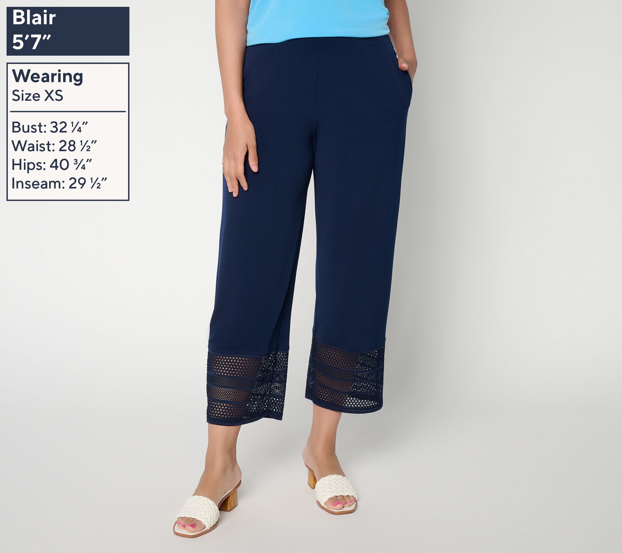 Crochet all day! Whether you're heading to brunch with friends or soaking in a sunny afternoon at the park, these crochet lace-trimmed crop pants offer effortless movement and style. Soft Liquid Knit® and feminine detailing create a breezy look you can dress up or down for any warm-weather occasion. From Susan Graver.