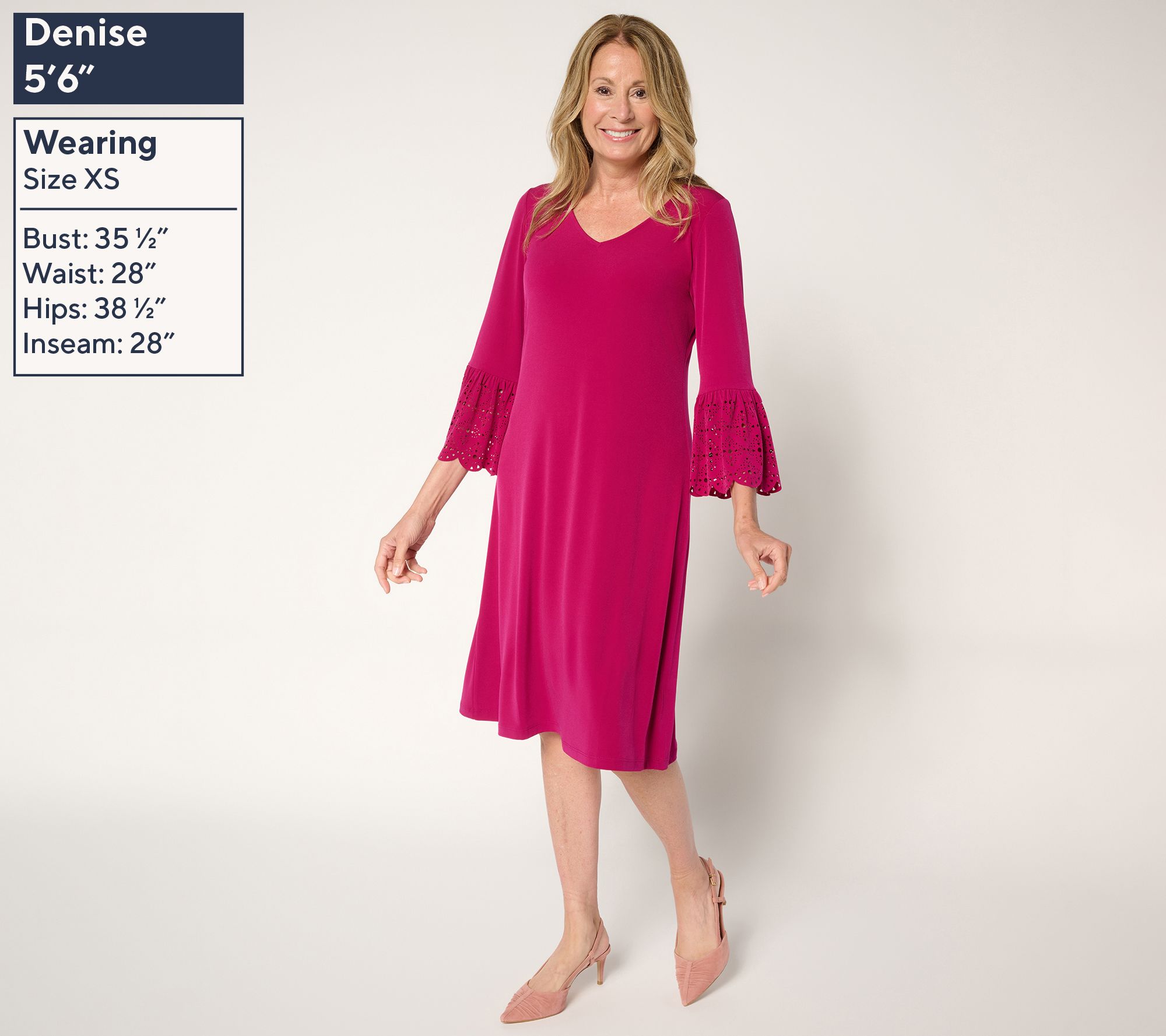 Lunch with friends or evening plans on your calendar? This Liquid Knit® dress brings easy sophistication to every occasion with its flattering fit-and-flare silhouette and flared sleeves. The laser-cut detailing adds a lively twist, while the soft knit keeps you feeling polished from day to night. From Susan Graver.