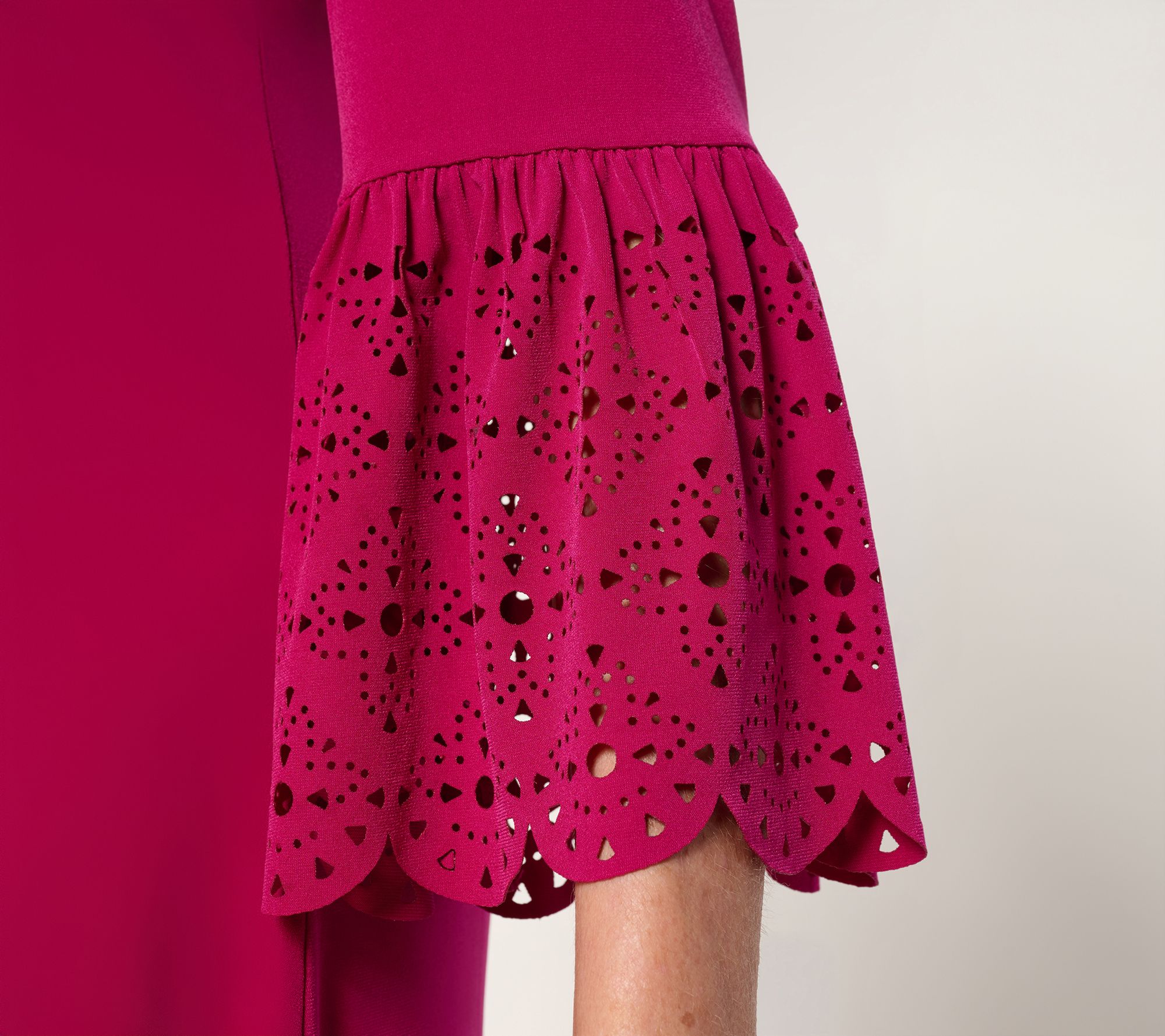 • Features: V-neckline, laser-cut detail on 3/4-length flared sleeves, fit-and-flare silhouette