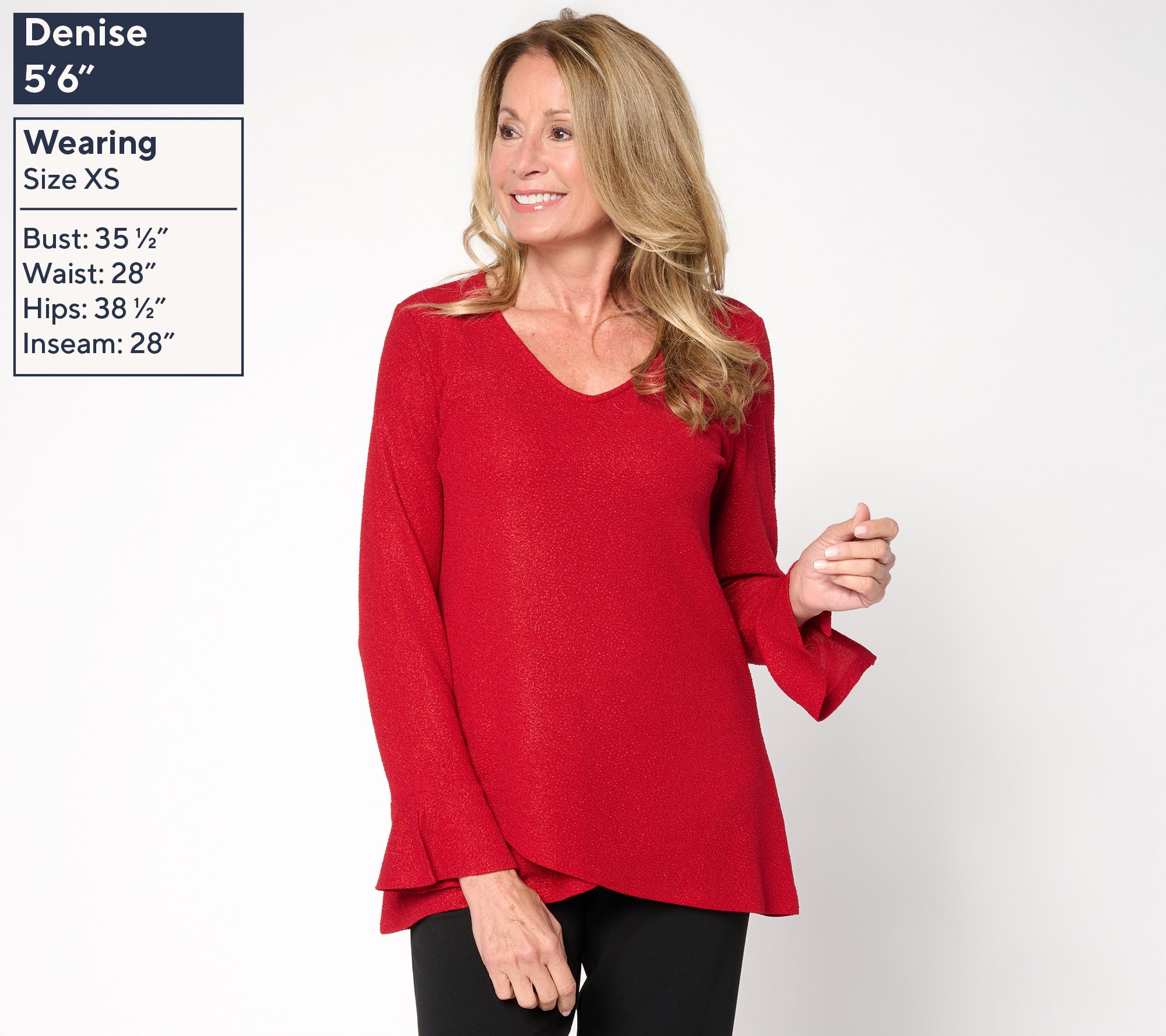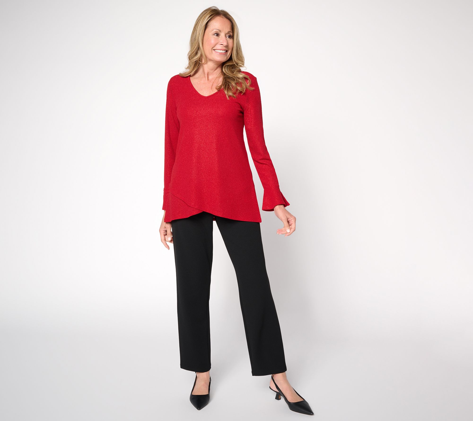 Is a celebration in order? Ease and elegance are knit right into this ruffly metallic knit top -- so you can focus on friendships and conversations. Seamlessly pair the graceful shape with your favorite jeans or a tailored skirt. From Susan Graver.