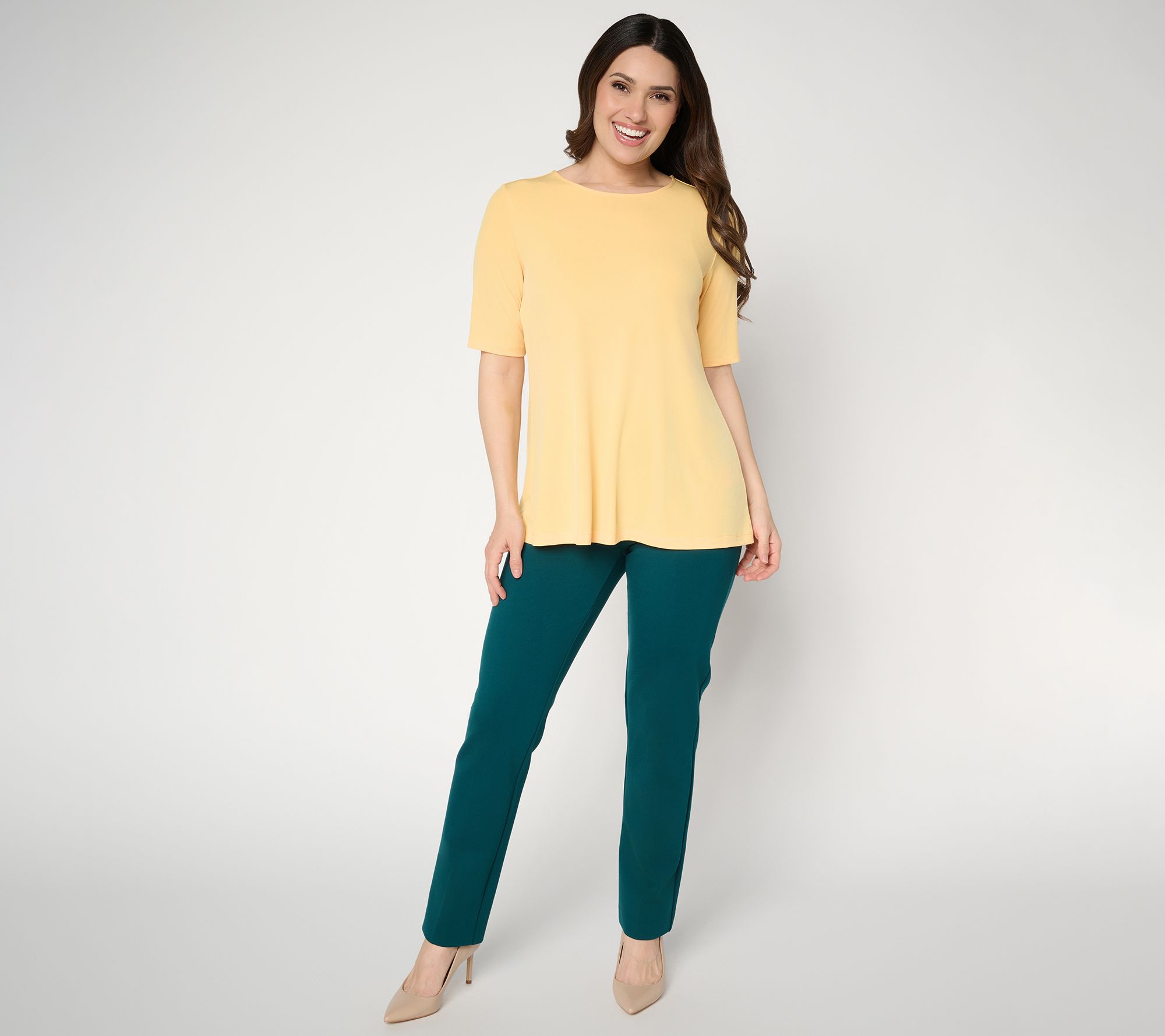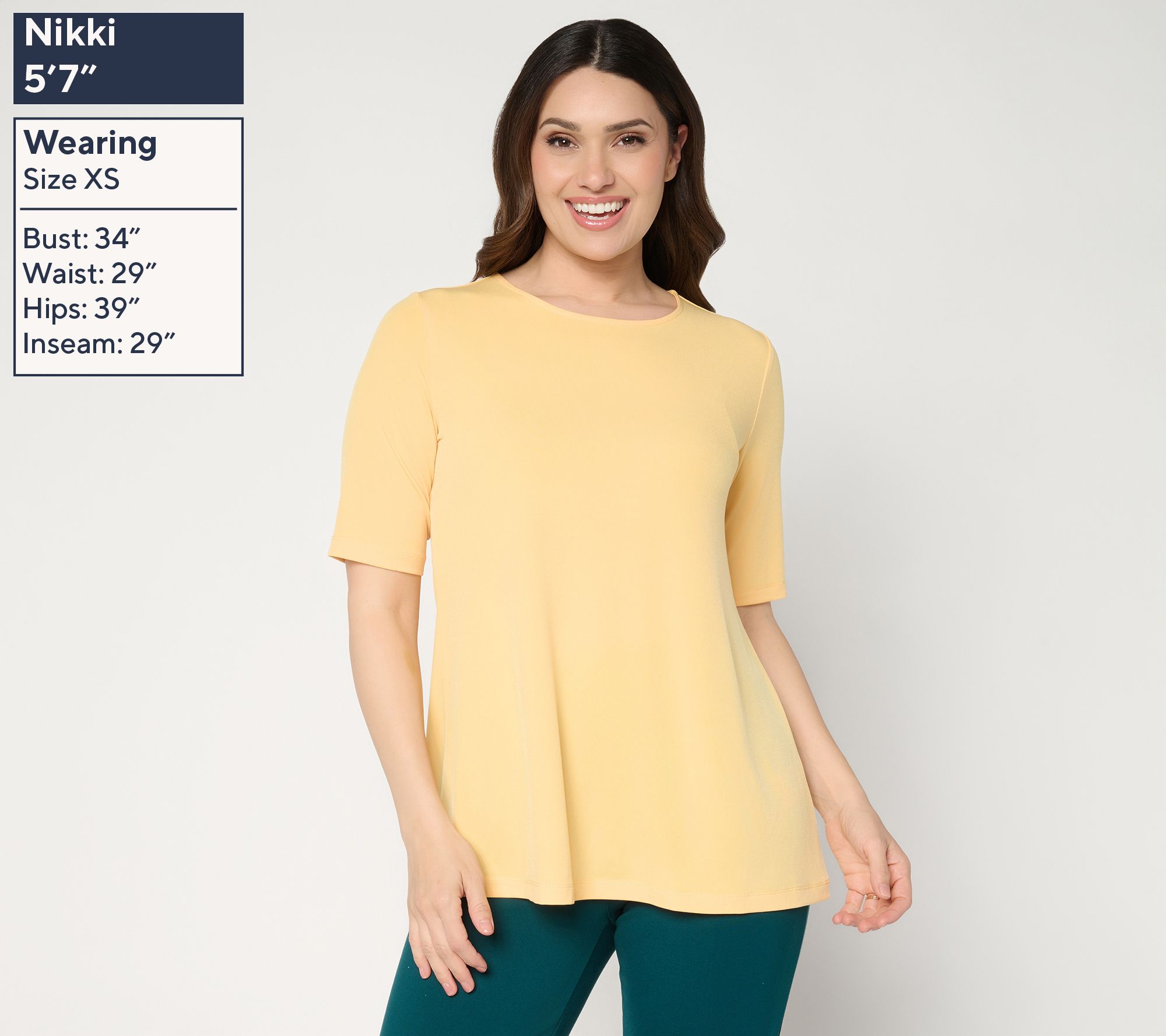 Not a day for tight or tugging tops? This A-line pullover in Liquid Knit® flows right over your curves and edges. The jewel neckline is a favorite for elegantly framing your neck and decolletage while still providing coverage. From Susan Graver.