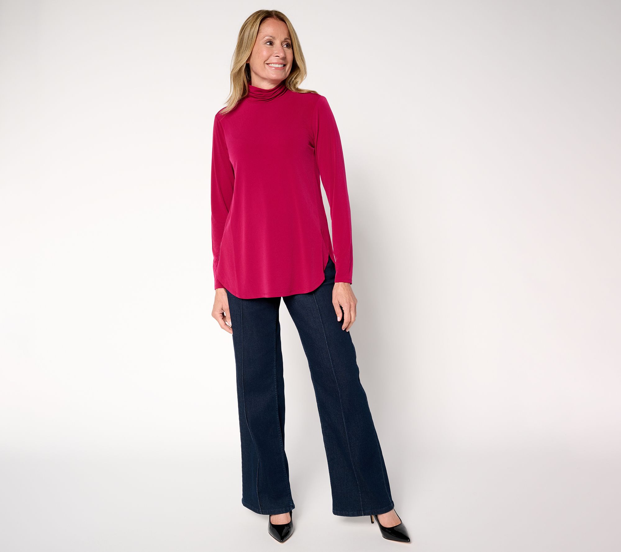 Meeting friends for lunch or tackling your to-do list, this Liquid Knit® tunic brings modern flair with a ruched mock neckline and soft curved hem at the sides. Forward side seams create a flattering look, while long sleeves and fluid knit drape keep you comfortable from errands to evening events. From Susan Graver.