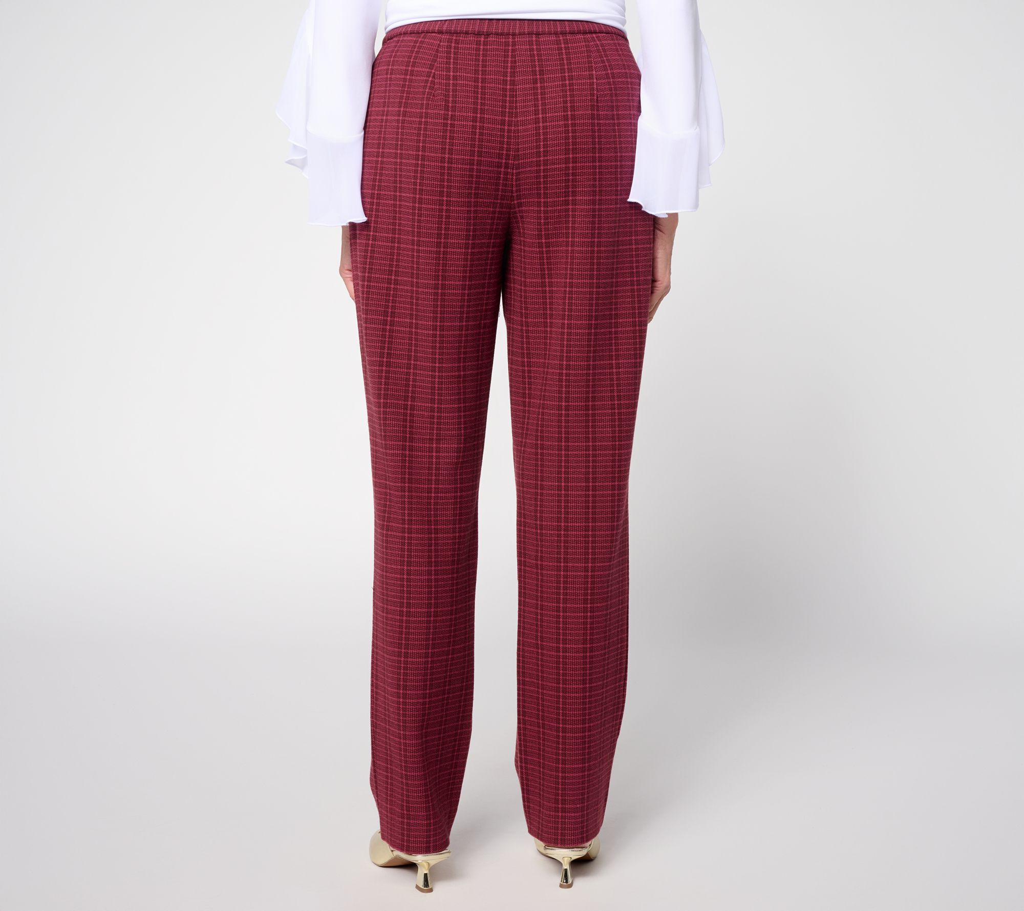 Plaid jacquard knit pants bring visual interest to work days or weekend outings, with a tailored straight-leg silhouette designed for comfort and versatility. On-seam pockets and a pull-on waistband streamline your routine, while creased legs offer a smart finish for easy pairing with your favorite tops and shoes. From Susan Graver.