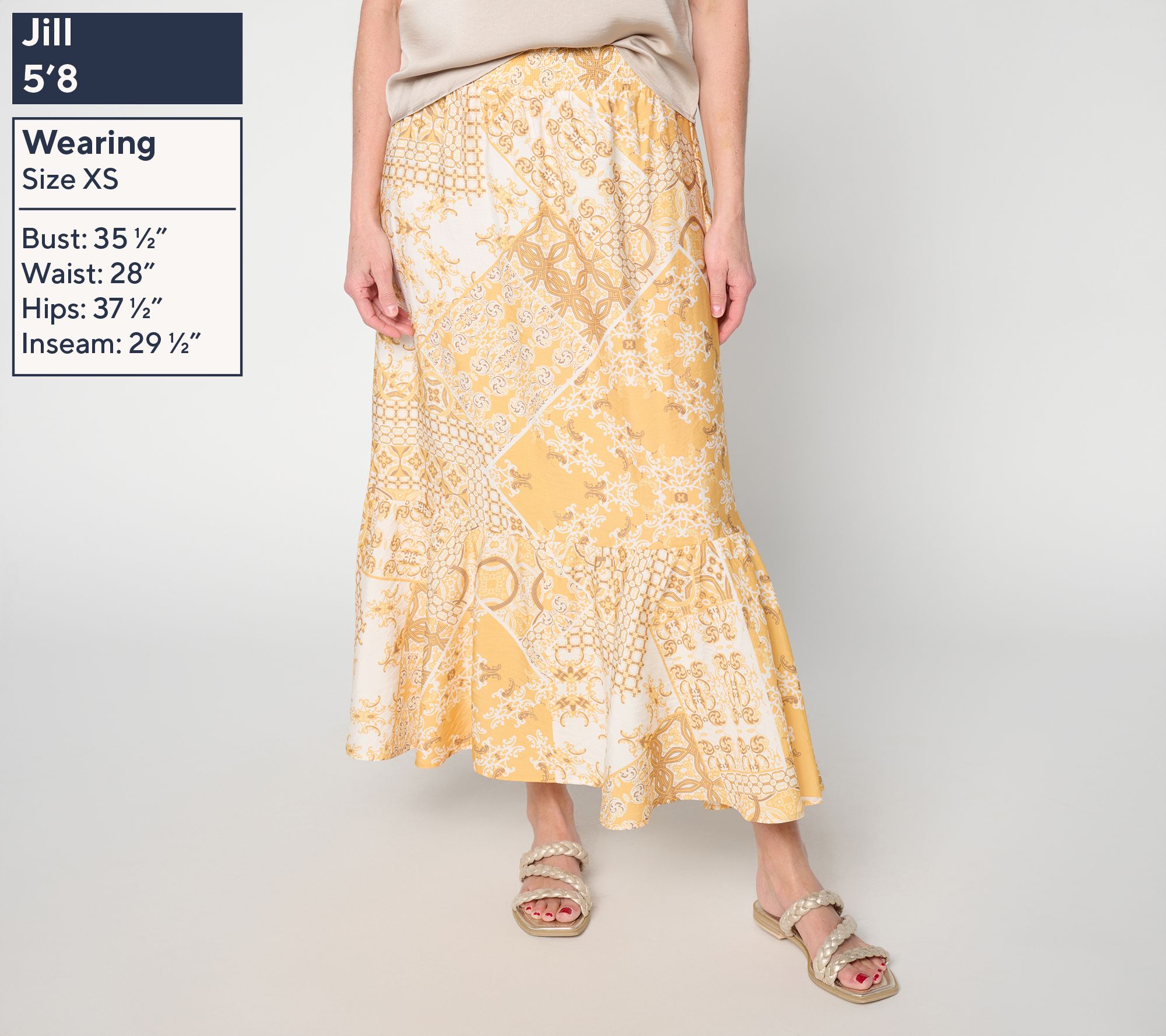 From a stroll through the boutiques to brunch with your bestie, this printed skirt in Dolce woven has all the right moves. The smocked waistband comfortably flatters your silhouette while the ruffled bottom tier gives breezy movement to every step -- or dance routine. (What a fresh look for salsa night!) From Susan Graver.