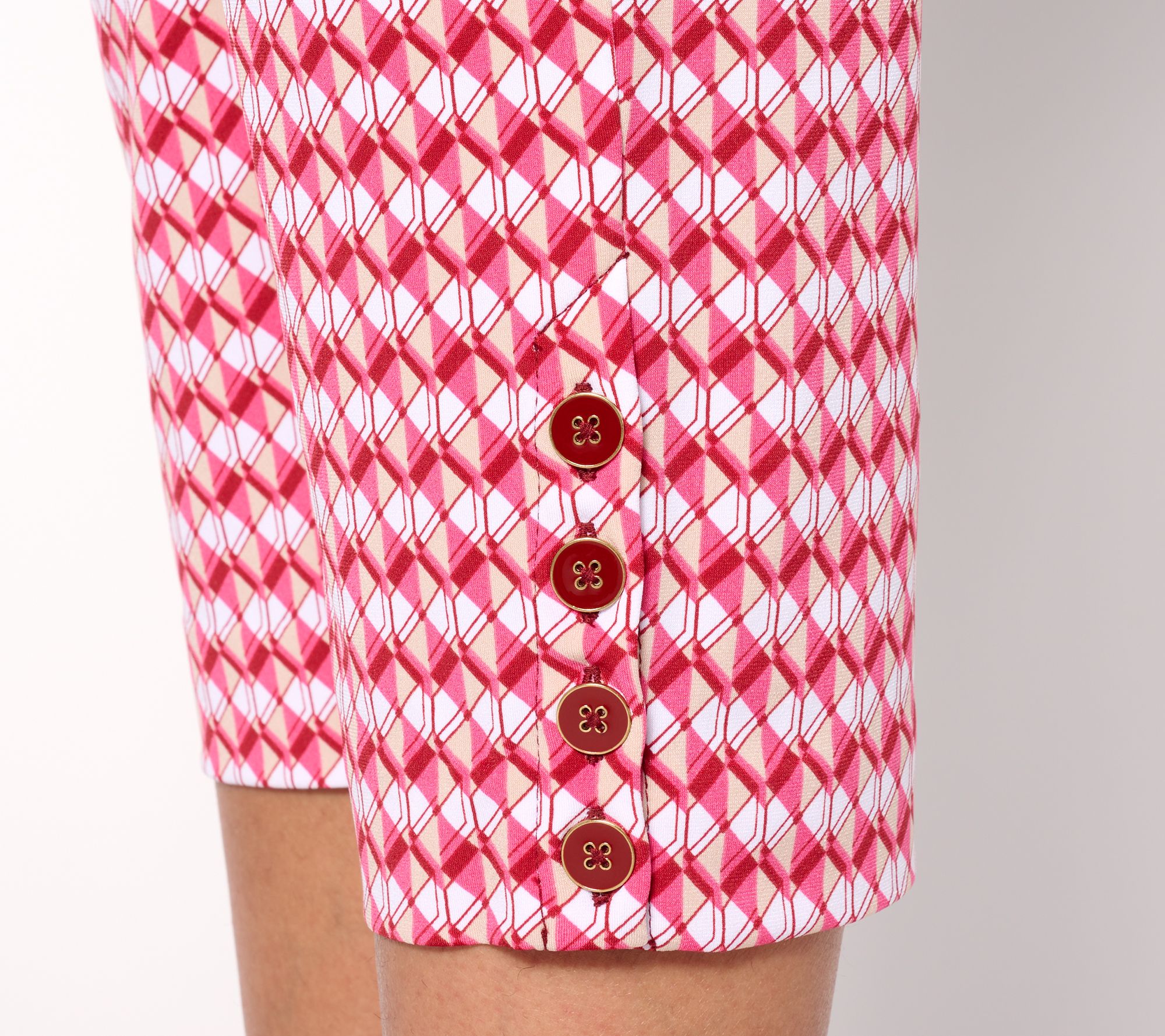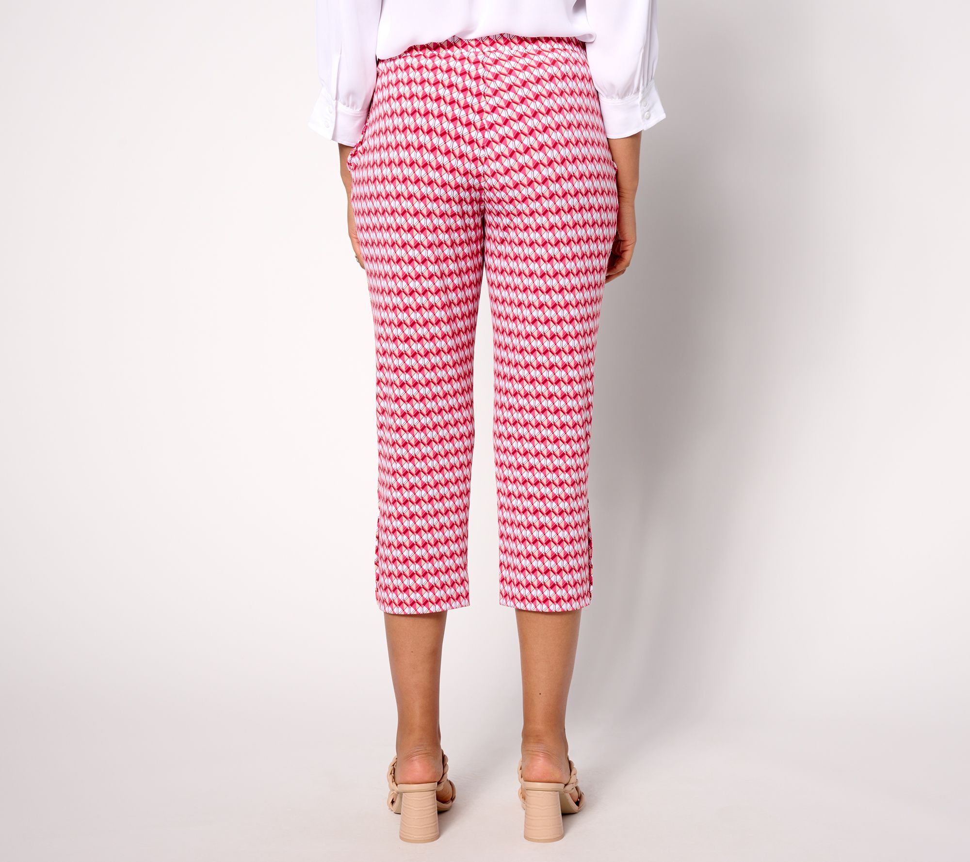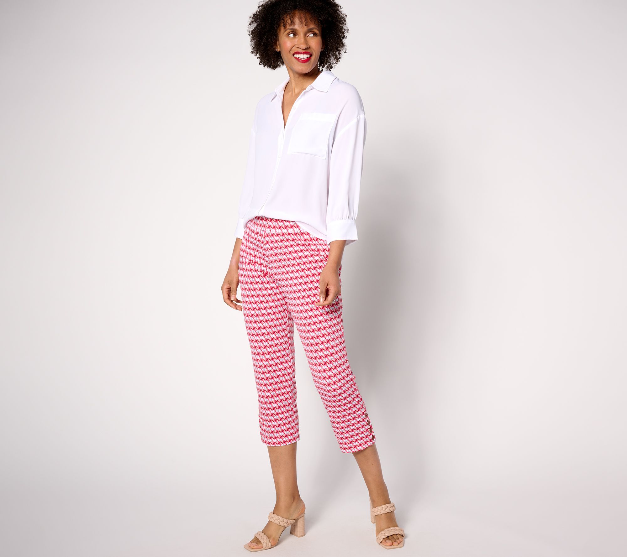 Great news for Liquid Knit® lovers -- the season's most sought-after cropped pants are now crafted in the flowy feel-good fabric. Shiny buttons dress things up on this printed take. Simply add a button-front shirt and heeled sandals for an effortless and polished ensemble. From Susan Graver.