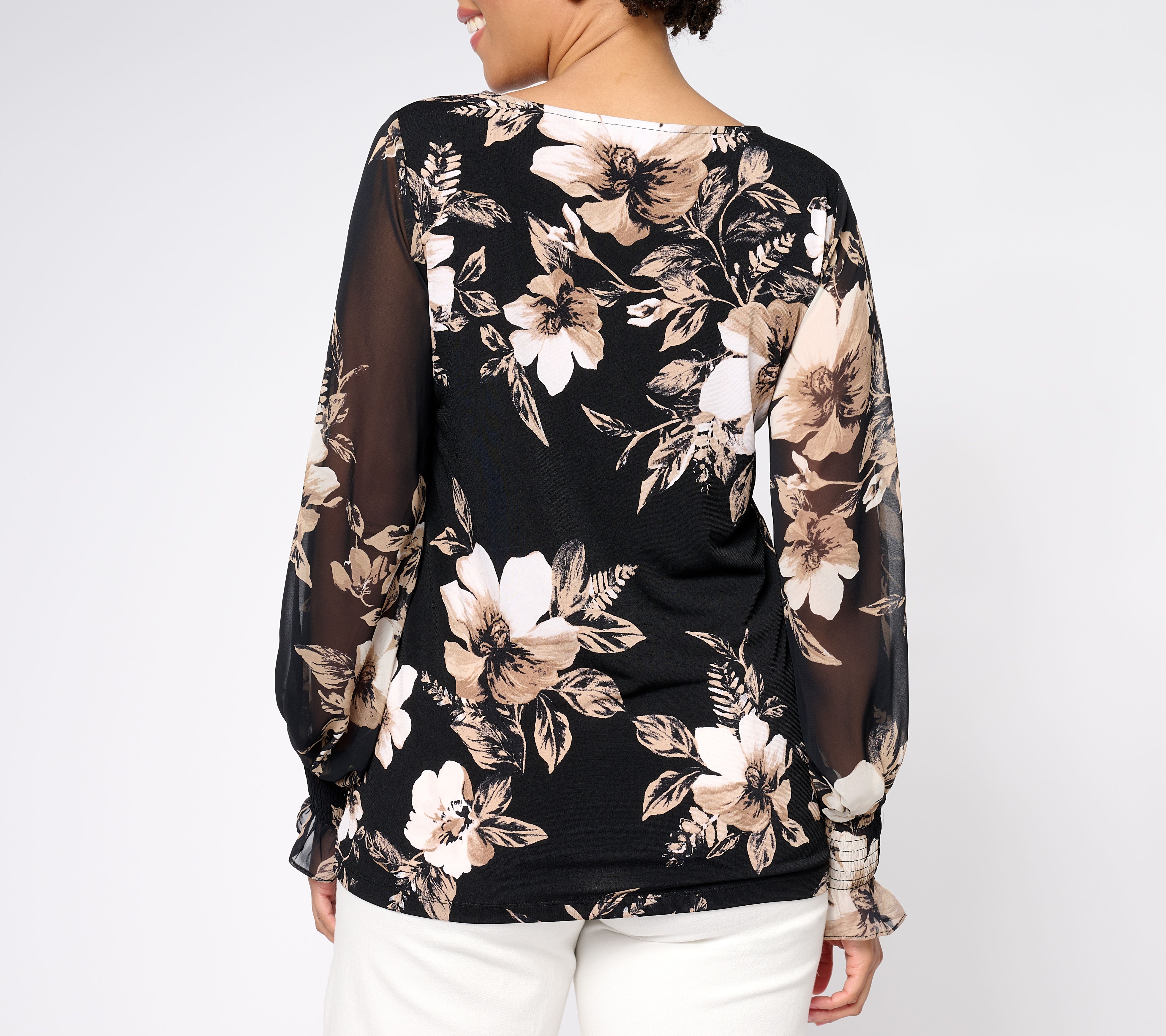 Susan Graver Petite Printed Liquid Knit Tunic with Chiffon Sleeves