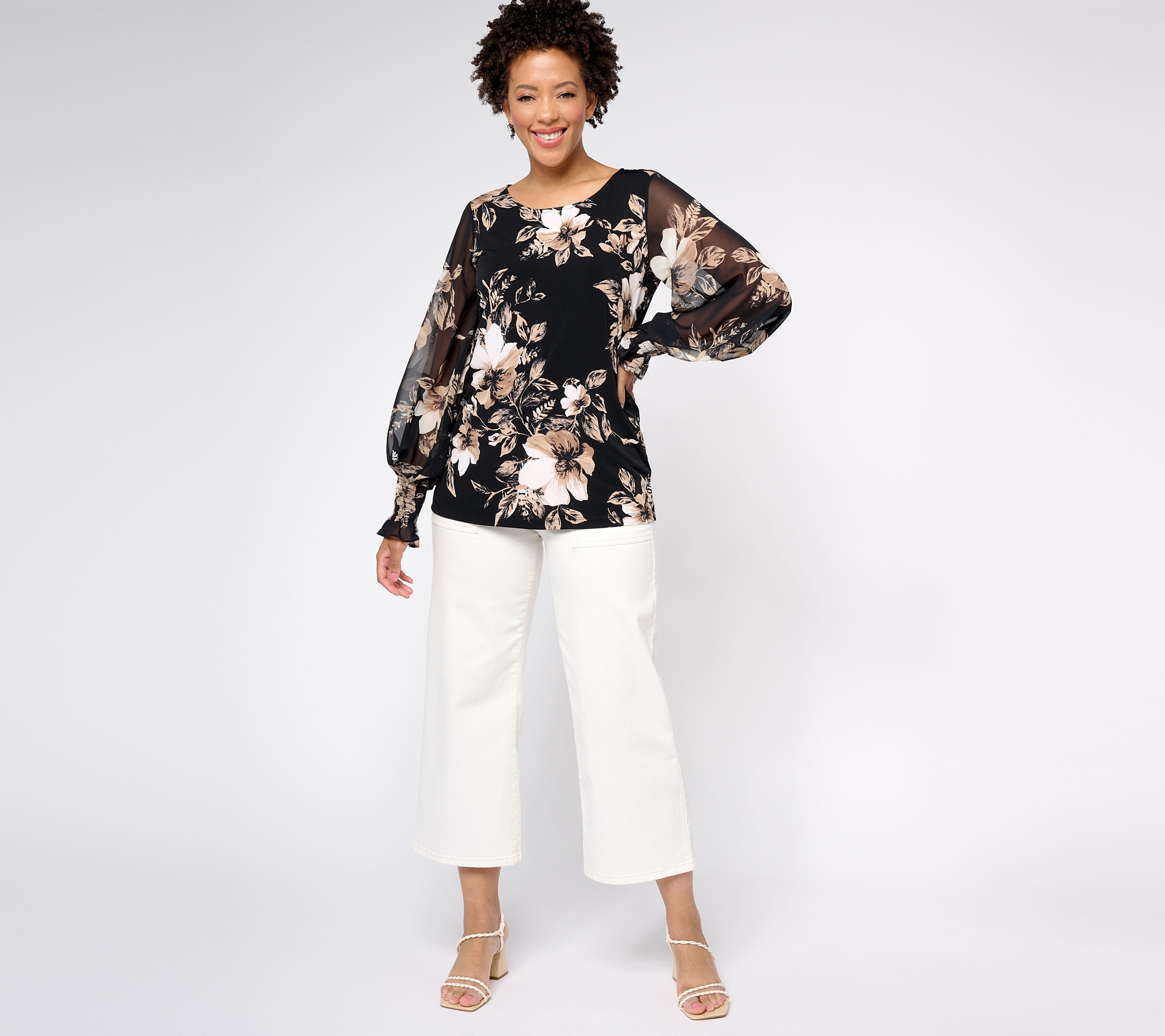 • Features: allover print, crewneck, long woven chiffon sleeves with elastic smocking at cuff, straight hemline