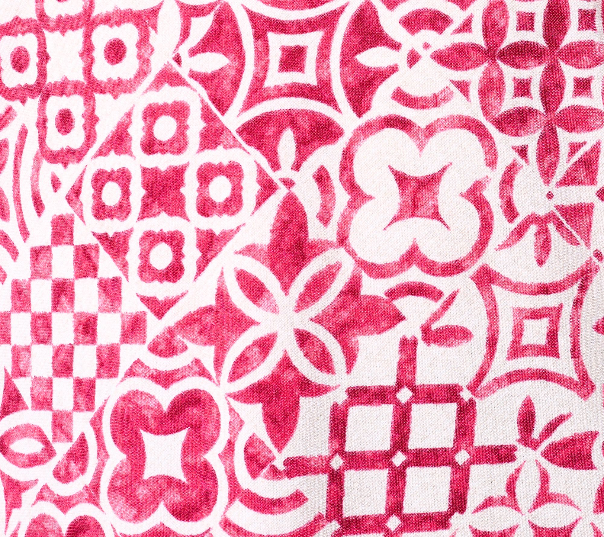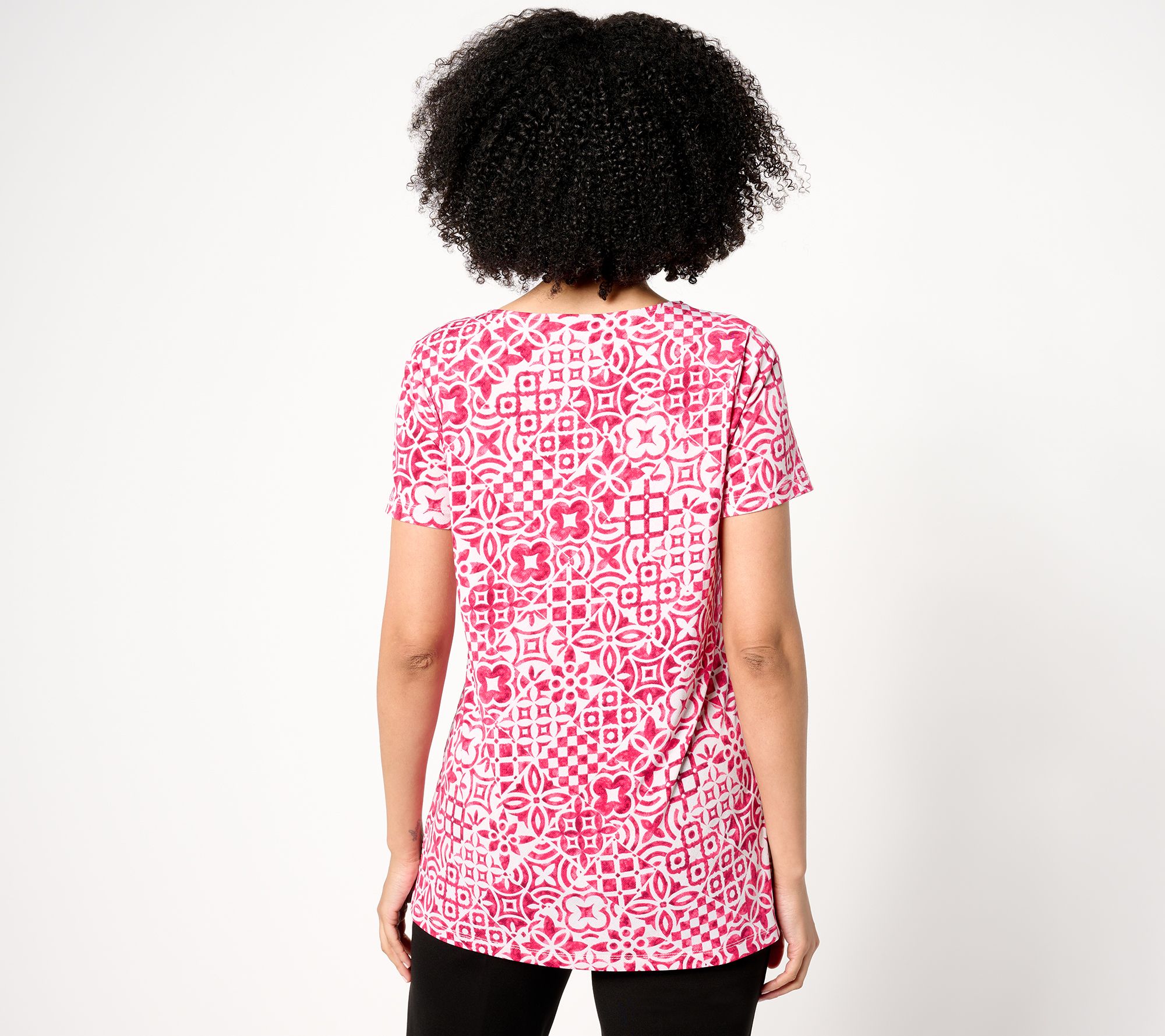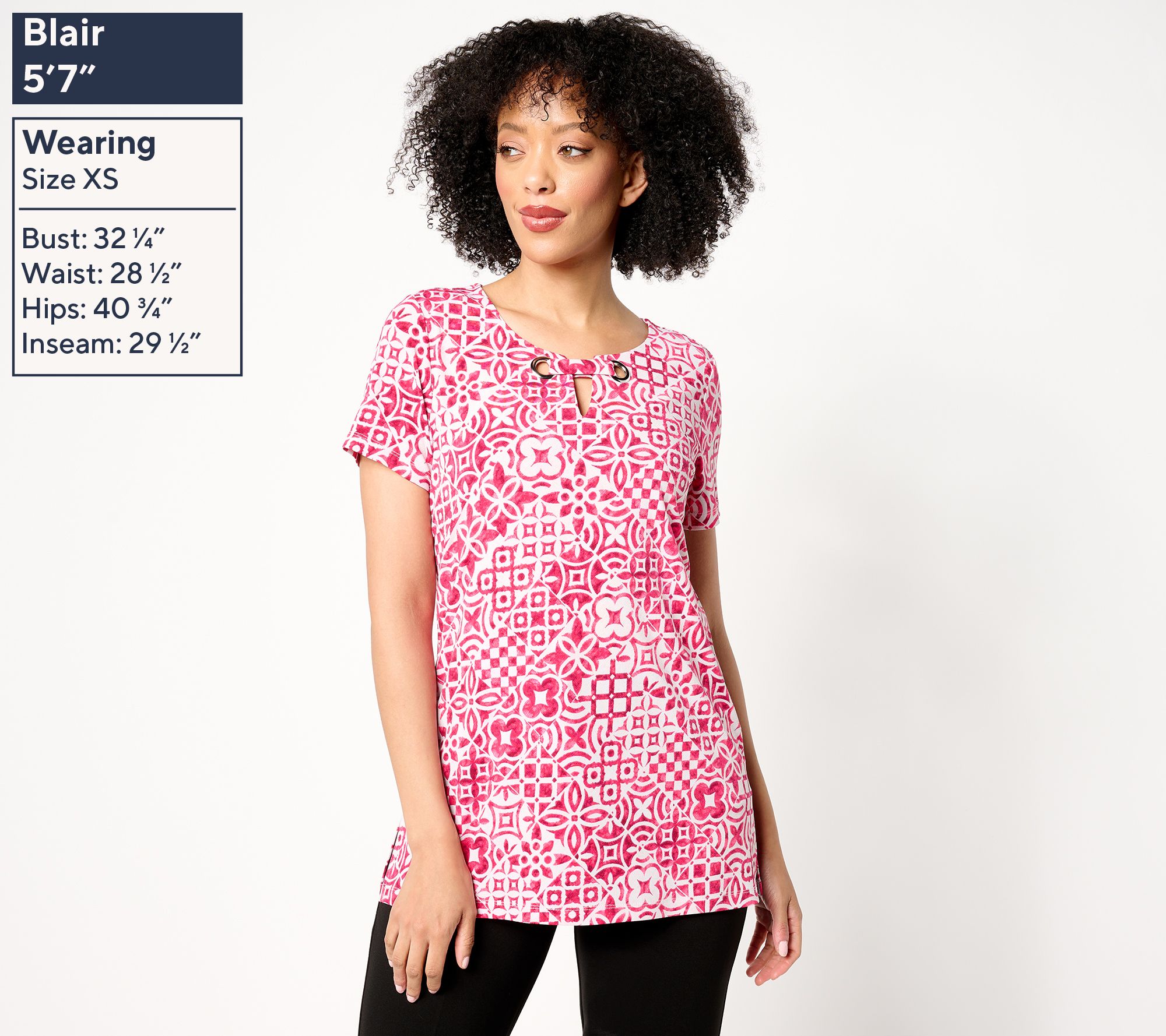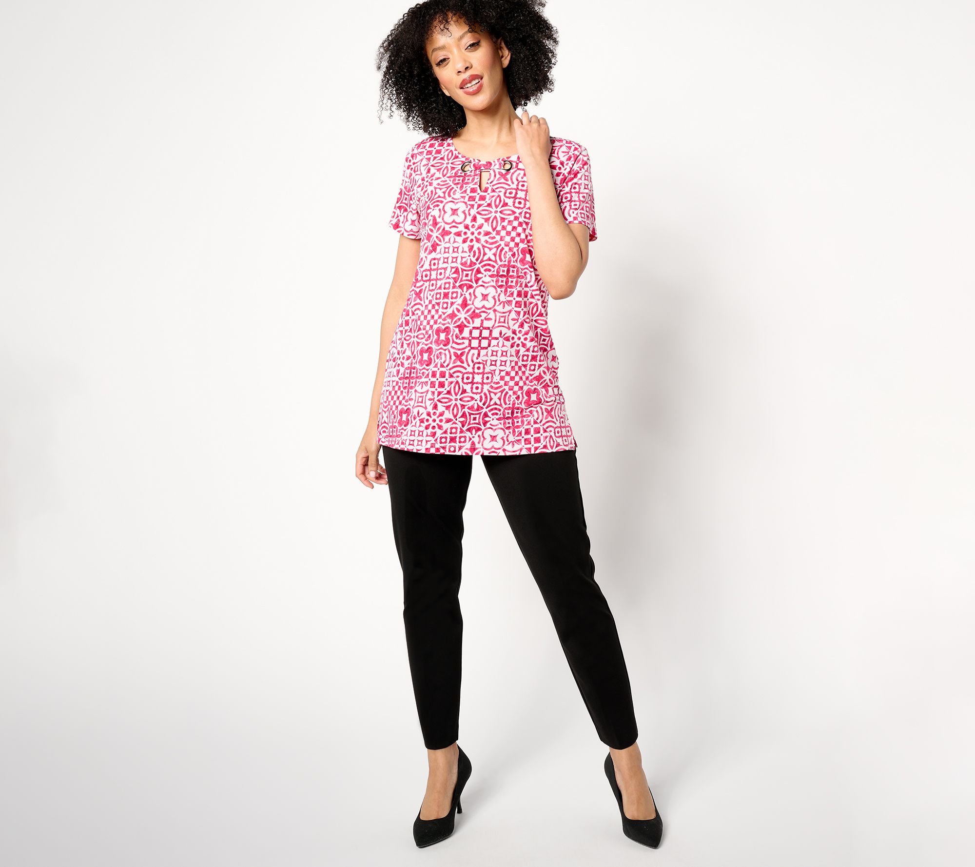 The comfort of a tee, the coverage of a tunic, and the undeniable style of a designer shirt, this versatile top takes your look next level thanks to a grommet accent on the split V-neckline and lively print. But how does it feel? Delightful! The carefree combo of Liquid Knit® fabric and a semi-fitted silhouette means you can wear this new favorite on repeat with leggings, jeans, or dress pants. From Susan Graver.