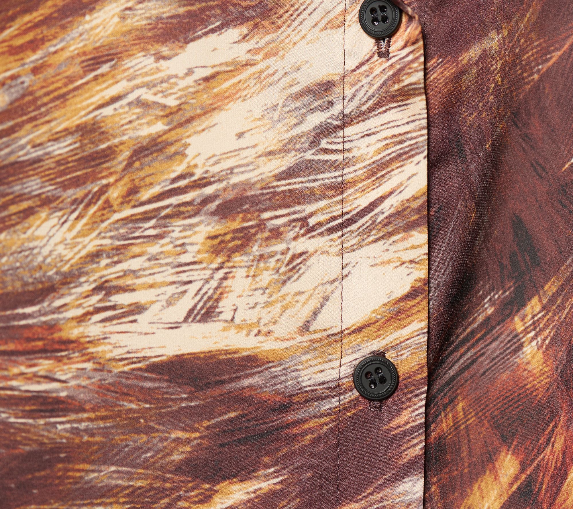 • Features: allover print, collar, long sleeves, button-front closure, button cuffs, side-seam pockets, shirttail hem