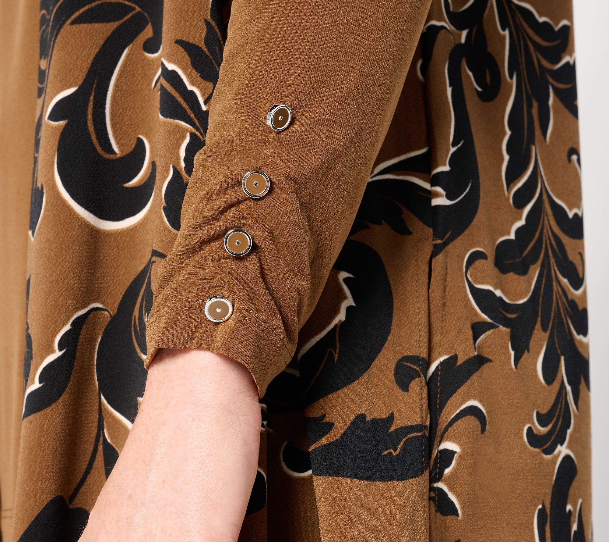 • Top Features: bracelet sleeves, shirring, decorative buttons