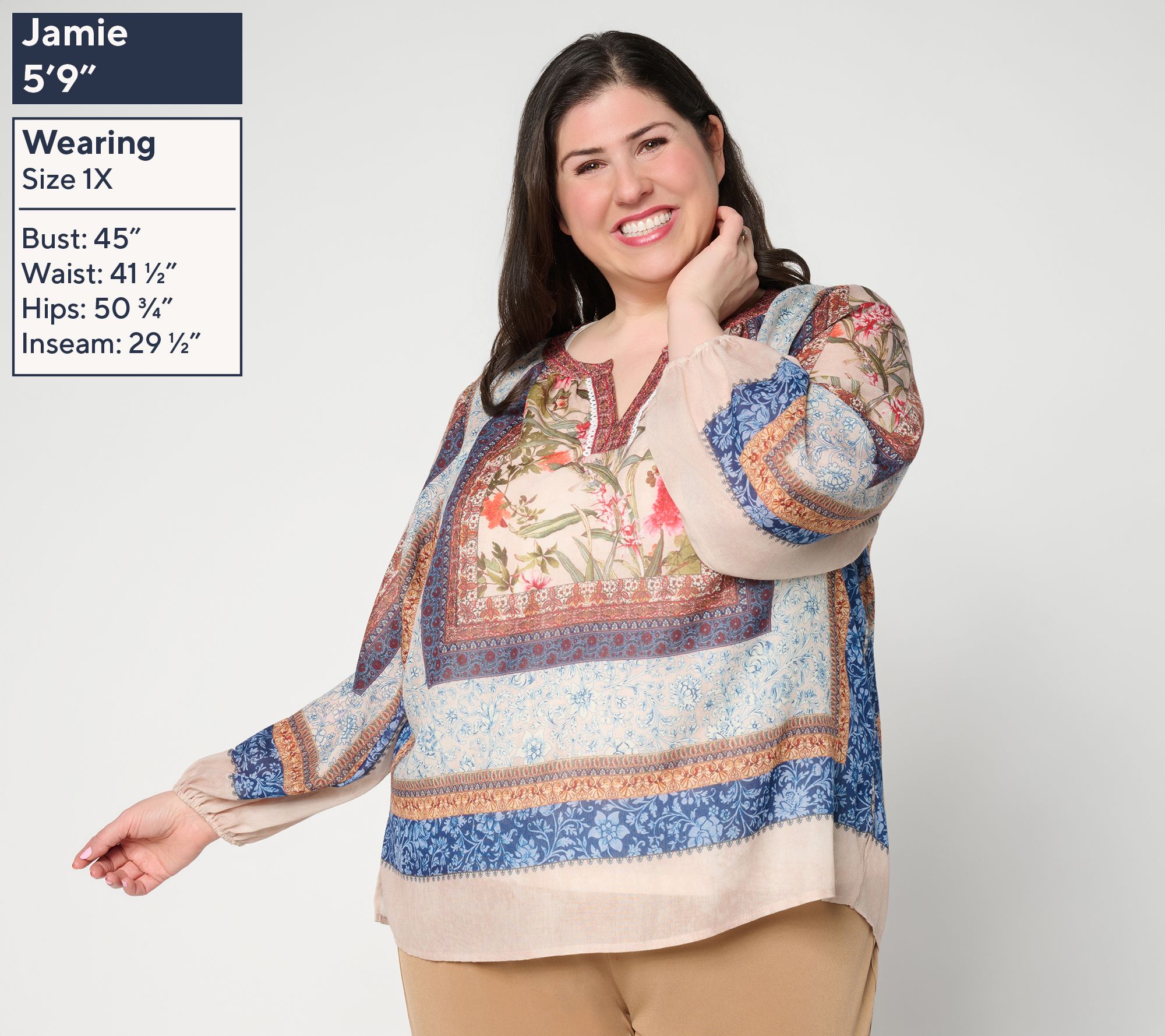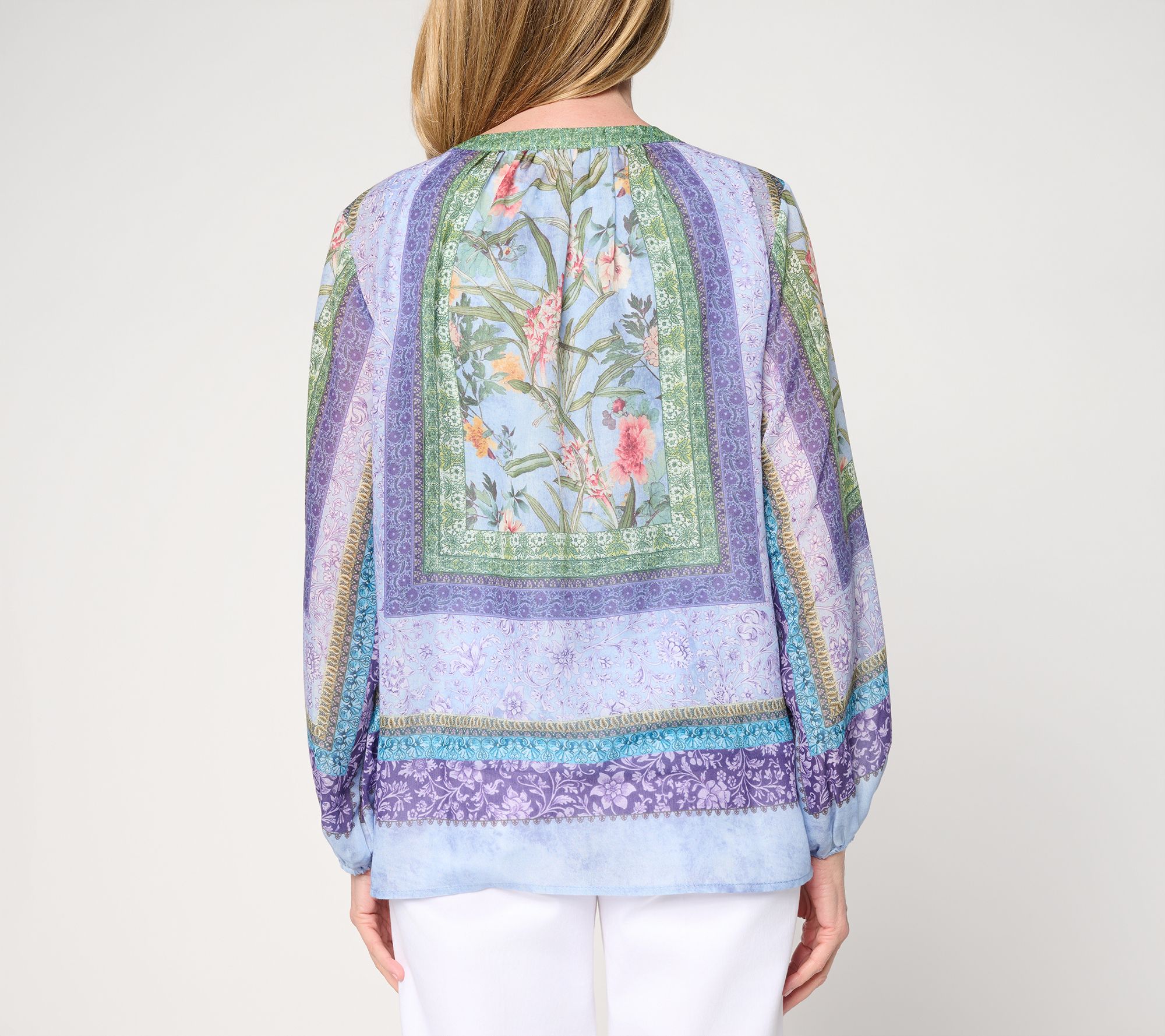 Tunic Features: front placket and embellished trim, full peasant sleeves with elastic cuffs, straight bottom hem with side slits, placed border prints