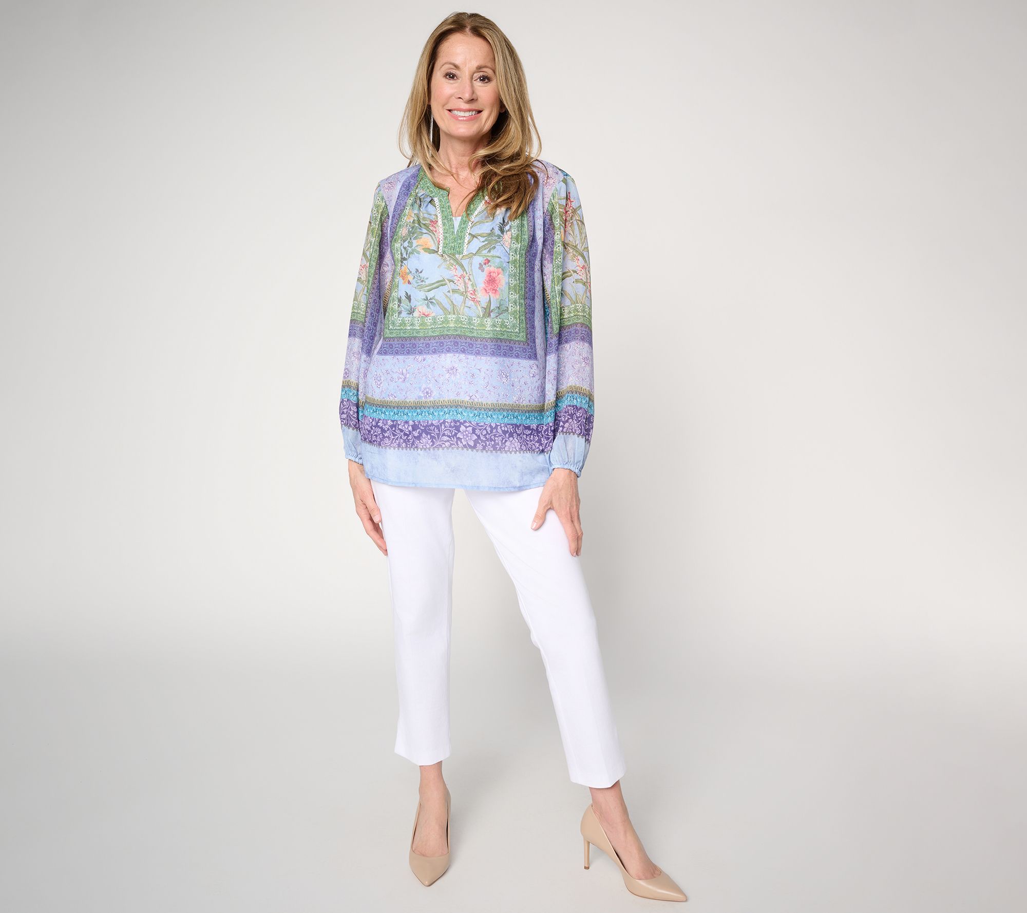 Slip into the carefree charm of this printed peasant tunic and knit tank set, ideal for strolls through local markets or relaxing weekend brunches. The woven tunic shines with its boarder print, embellished front detail, and flowing peasant sleeves, while the coordinating soft tank offers all-day comfort beneath. From Susan Graver.