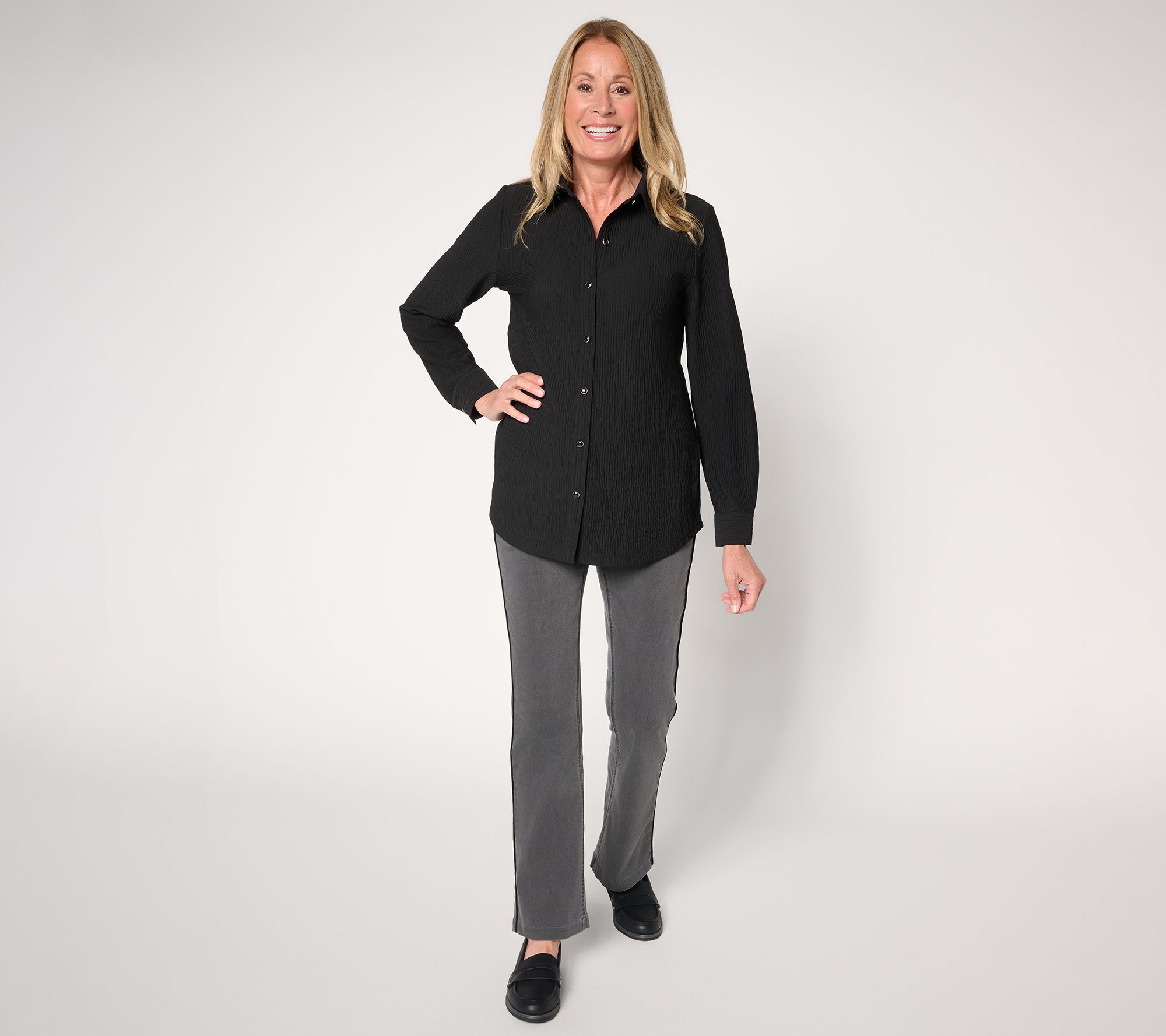 Craving a fresh take on denim? Slip into these soft stretch jeans for a stylish spin on weekend plans or casual Fridays at work. The faux suede piping adds a luxe touch, while the Hollywood waistband delivers lasting all-day comfort. Now you've got good reason to pick up those textured loafers or Western-inspired ankle boots you've been eyeing. From Susan Graver.