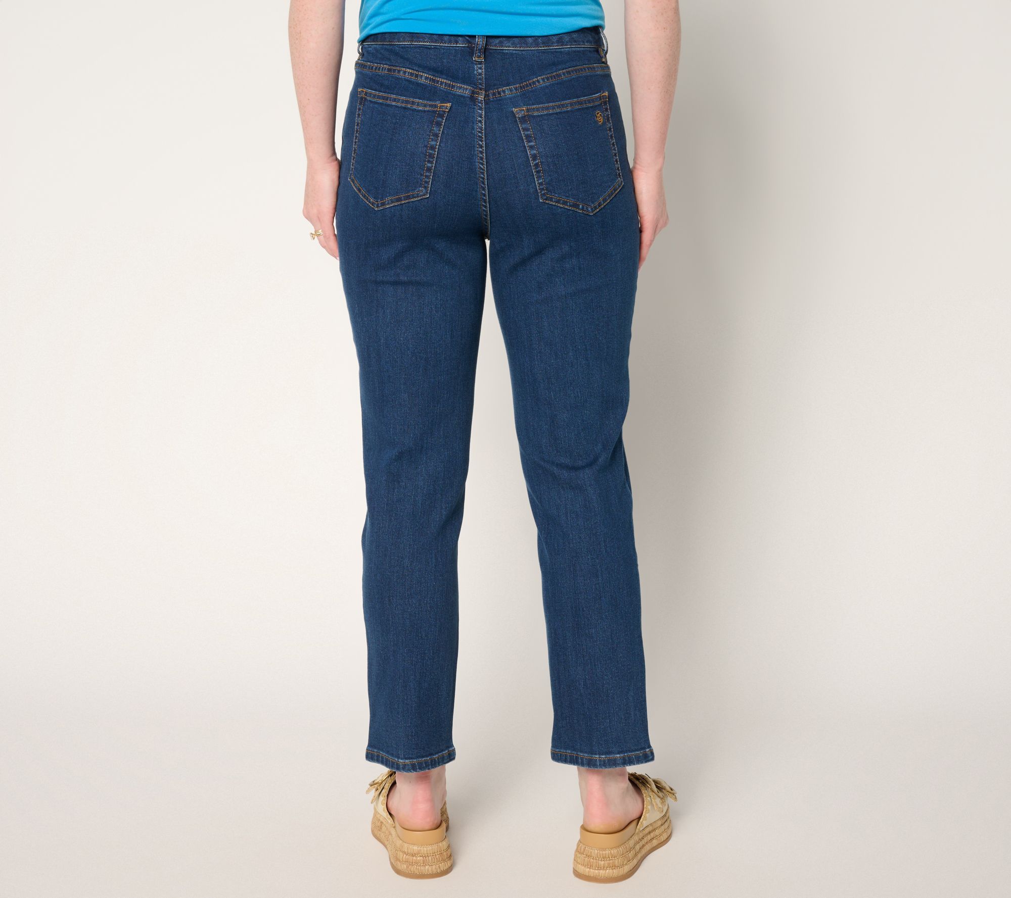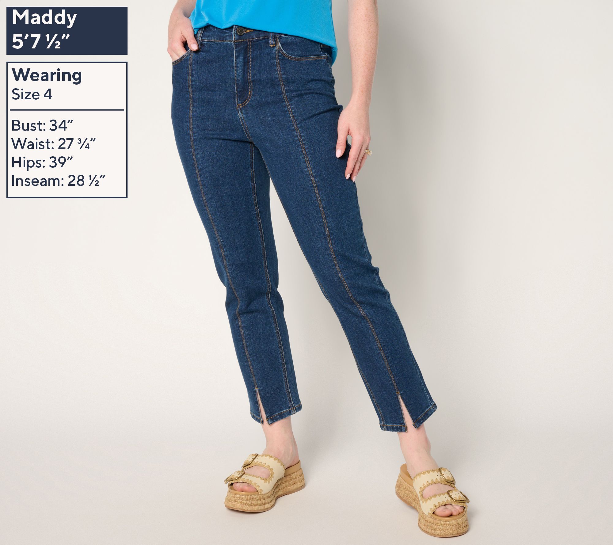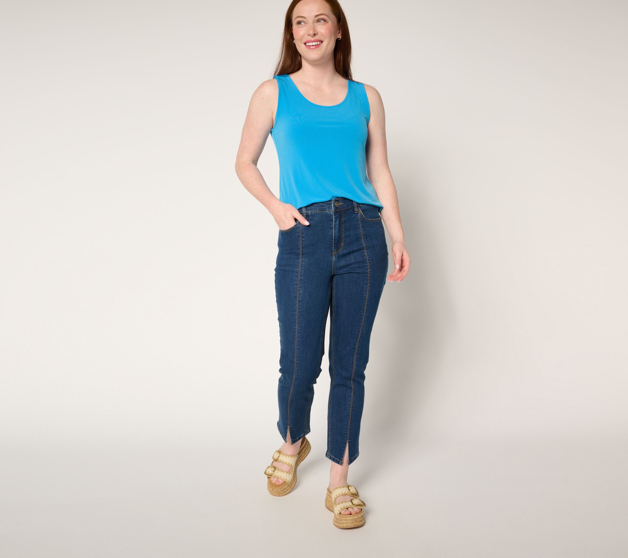 Liven up your wardrobe rotation with these stretch denim ankle jeans, designed for both style and comfort. The flirty front slit at the hem makes your favorite footwear pop, while the contoured waistband, belt loops, and handy front and back pockets add everyday practicality. The semi-fitted shape and straight-leg silhouette sit just slightly below the waist, giving you a flattering look for a day in or a night out. From Susan Graver.