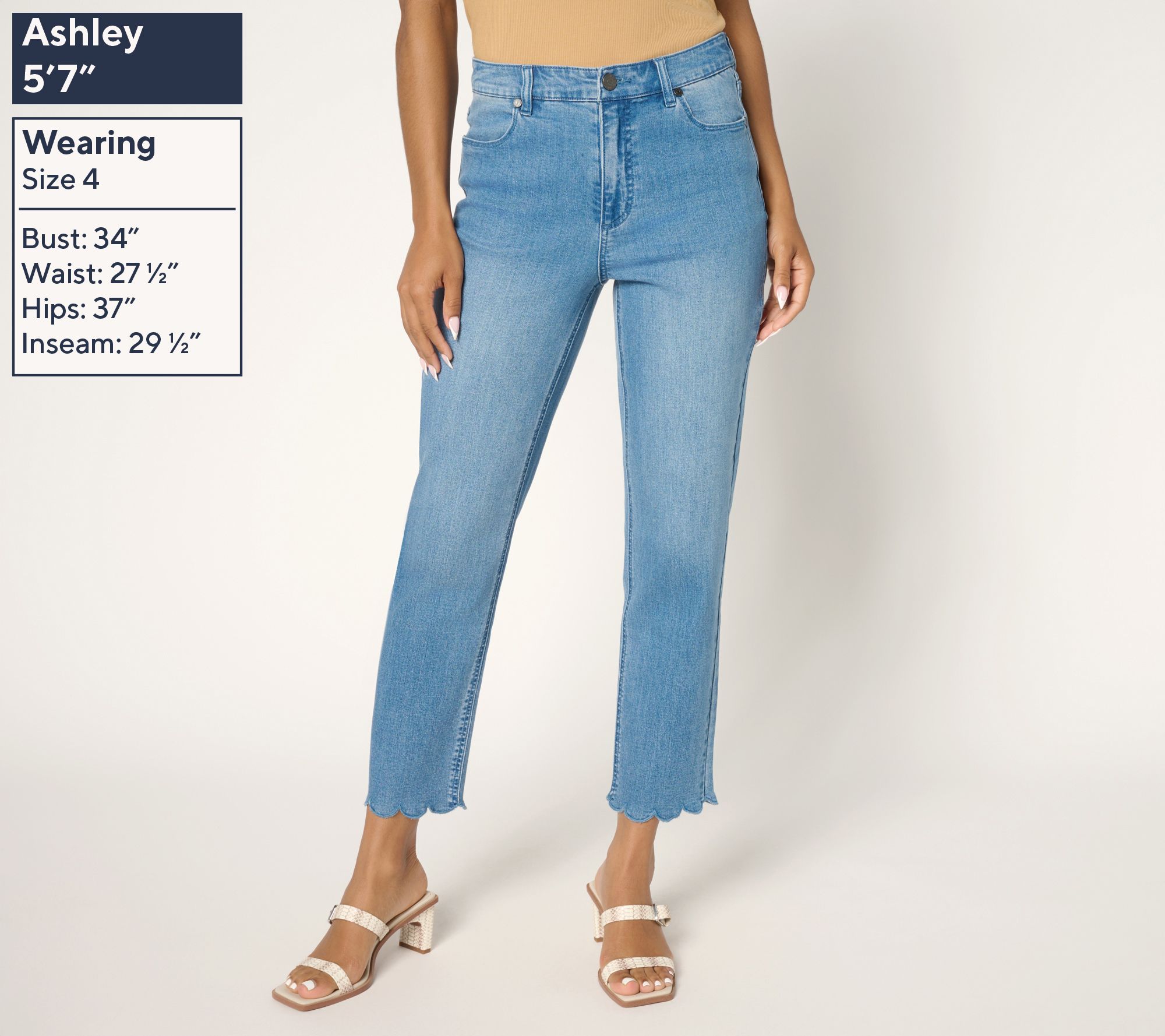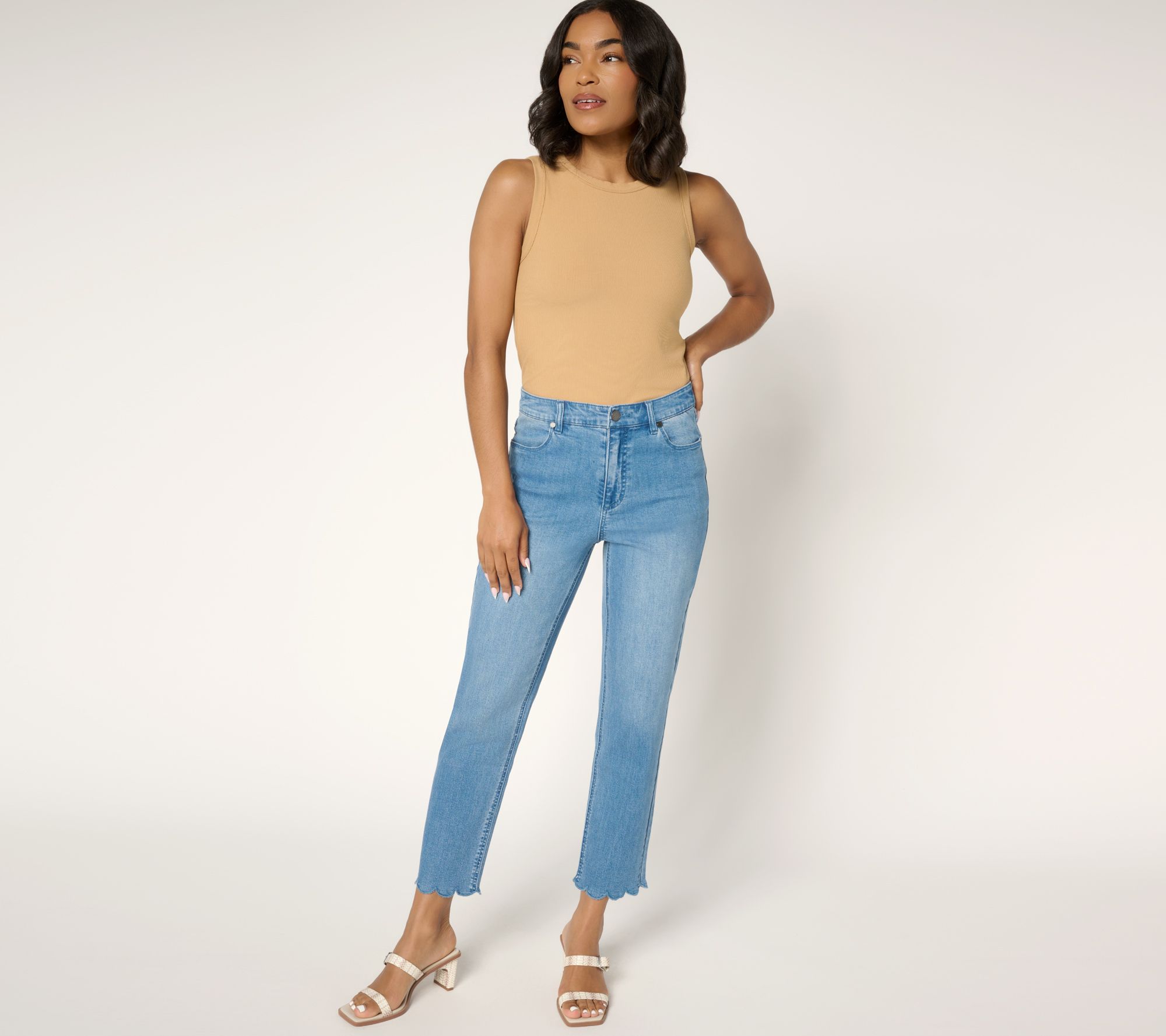 Ready for some (fashion) fun? Take your summer denim game to new heights with these ankle-length (and sandal-approved) jeans from Susan Graver. Playful embroidery lends a breezy feel while the scalloped edge adds a decidedly feminine flourish to any 'fit. Active agenda? Flexible stretch denim can handle it all. From Susan Graver.