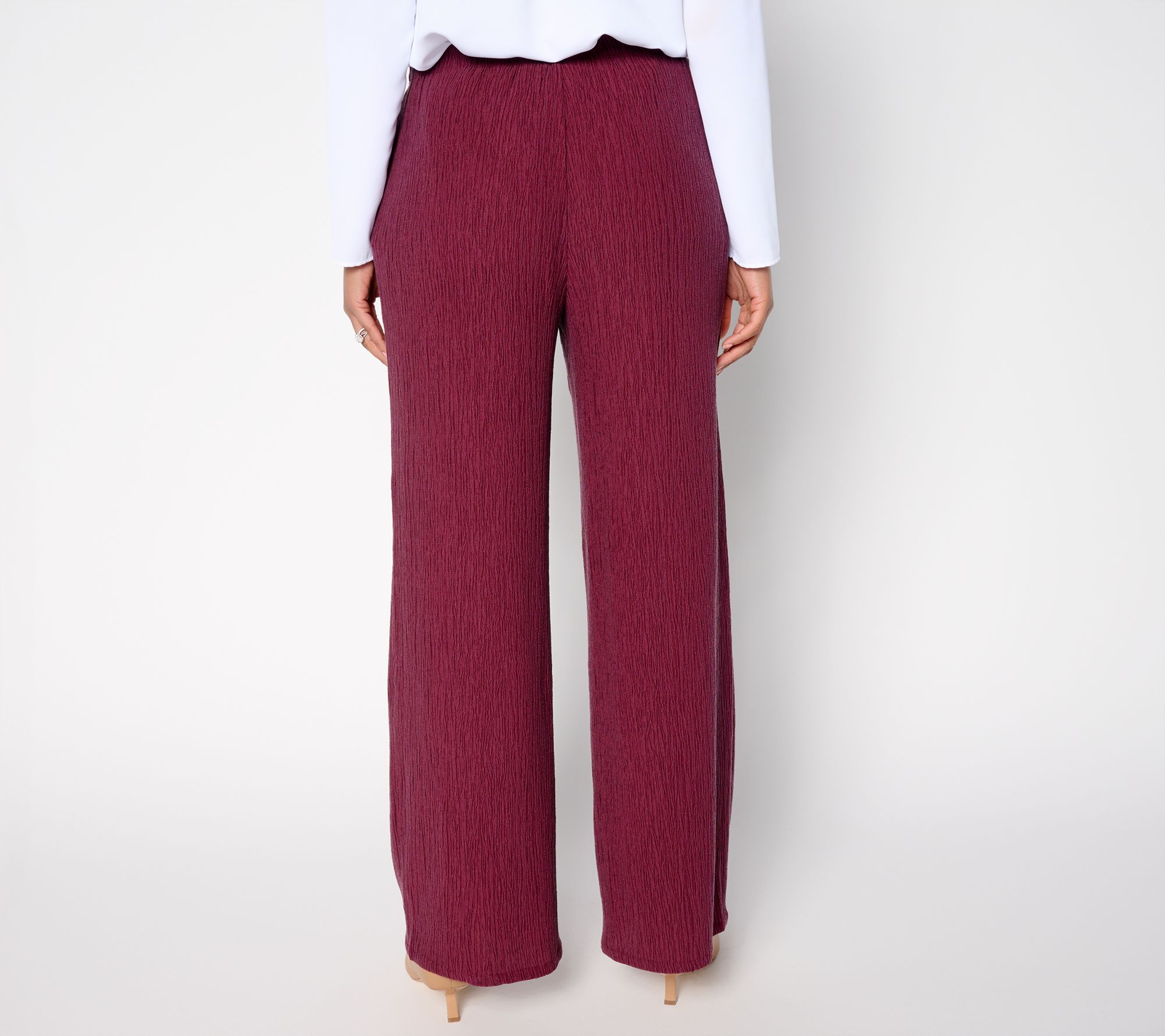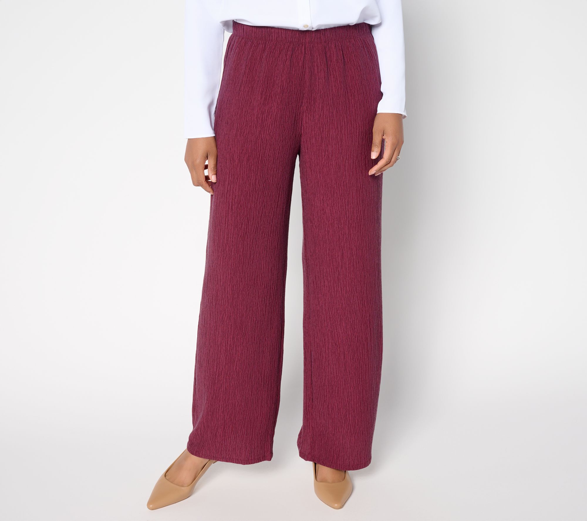 So tailored. So touchable. In-office polish makes a return with these textured pull-ons from Susan Graver. Make room in your everyday lineup for these wide-leg pants -- easy to style with tees, tunics, or that office-ready blouse. The pull-on waistband keeps things relaxed, while the drapey fabric brings a refined touch to all your plans. From Susan Graver.