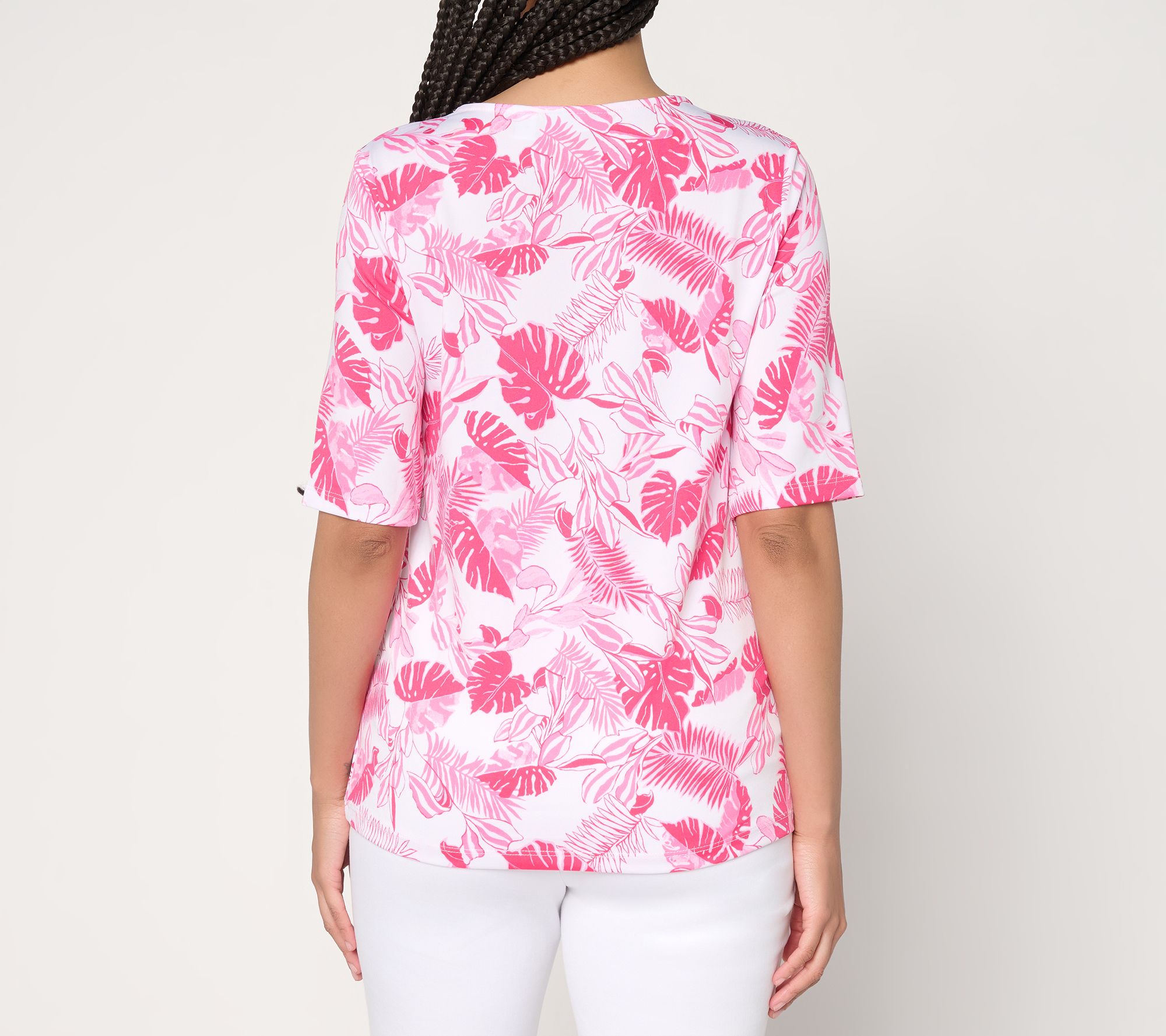 Colorful days out or weekend brunches feel brighter with this vibrant printed knit top. The V-neckline and elbow-length sleeves offer stylish comfort, while the easy pullover design glides on for fuss-free mornings. Pair with dress pants or denim for an instant mood-lifting look. From Susan Graver.