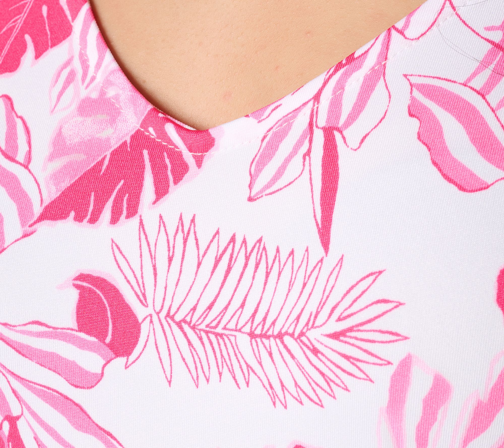 Features: random print poly span V-neck top, pullover style with V-neck opening, elbow-length sleeves, straight bottom hem
