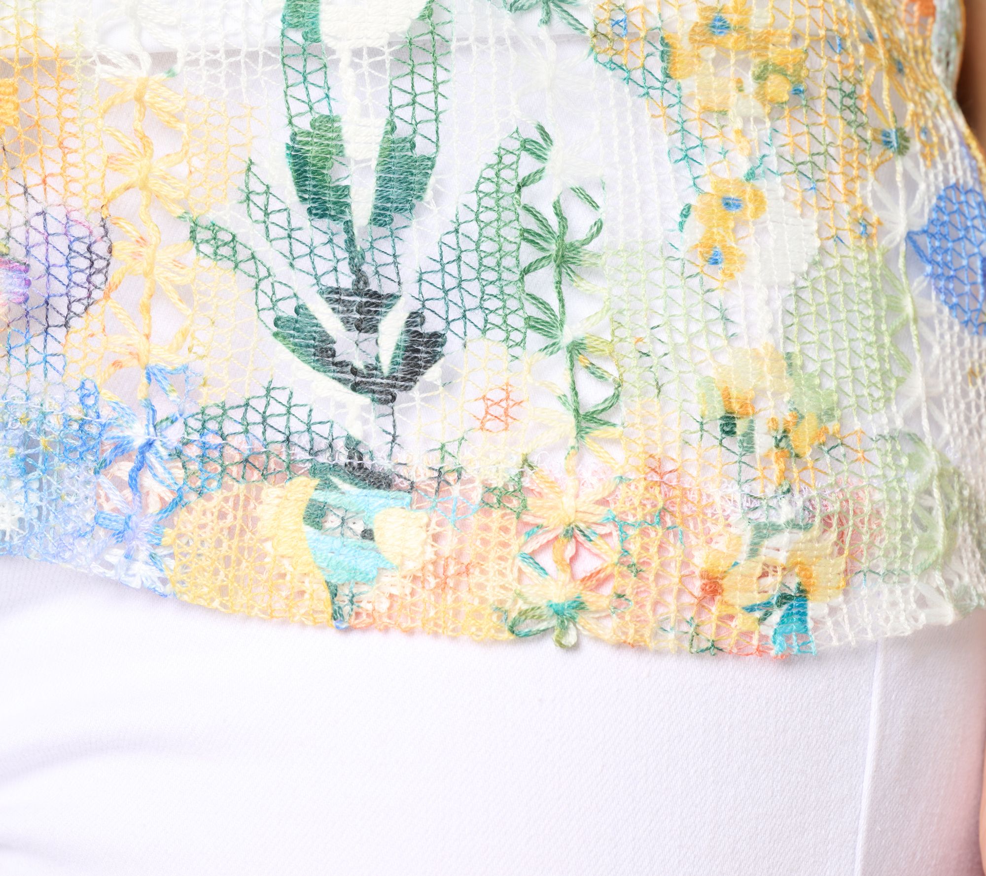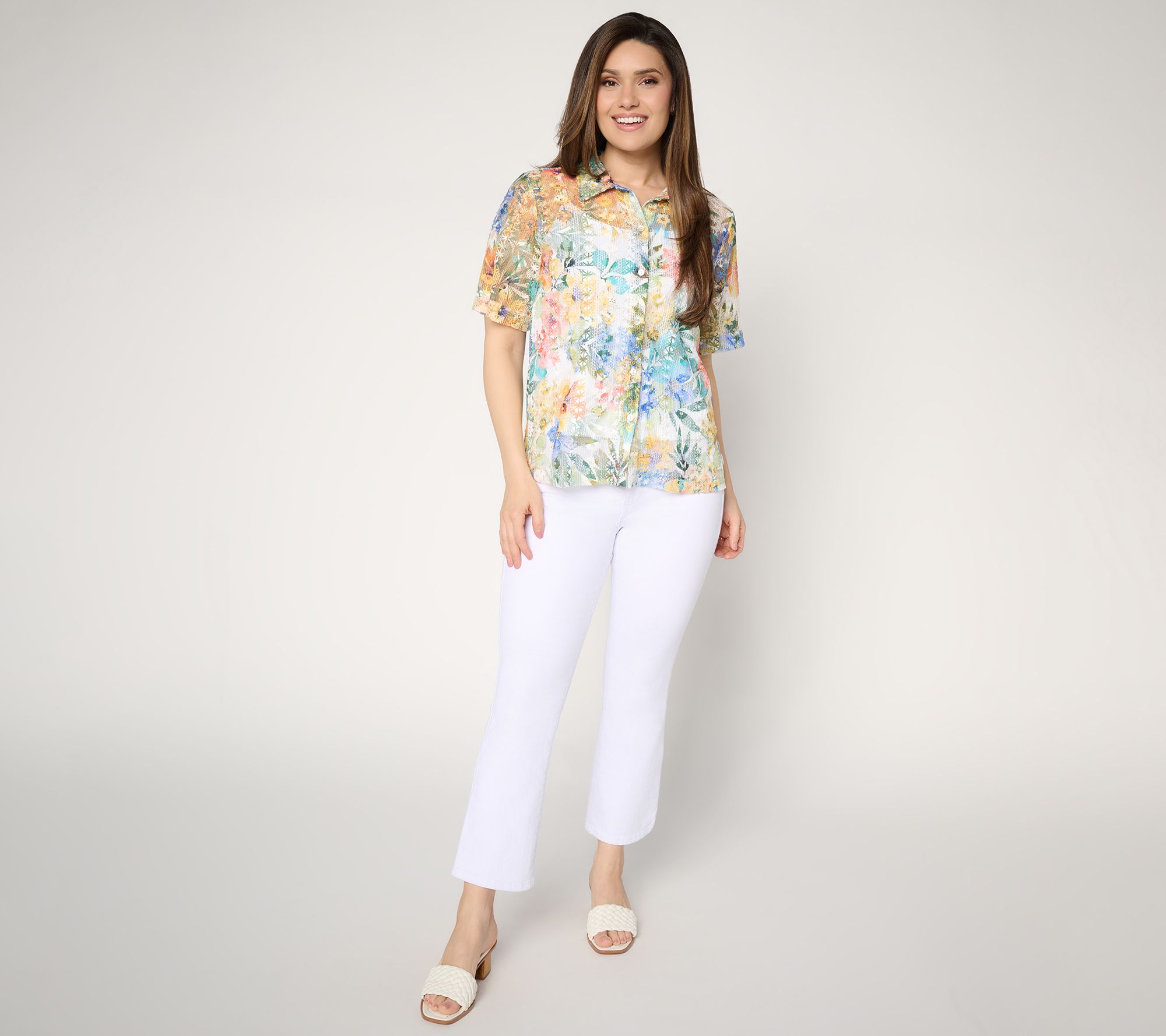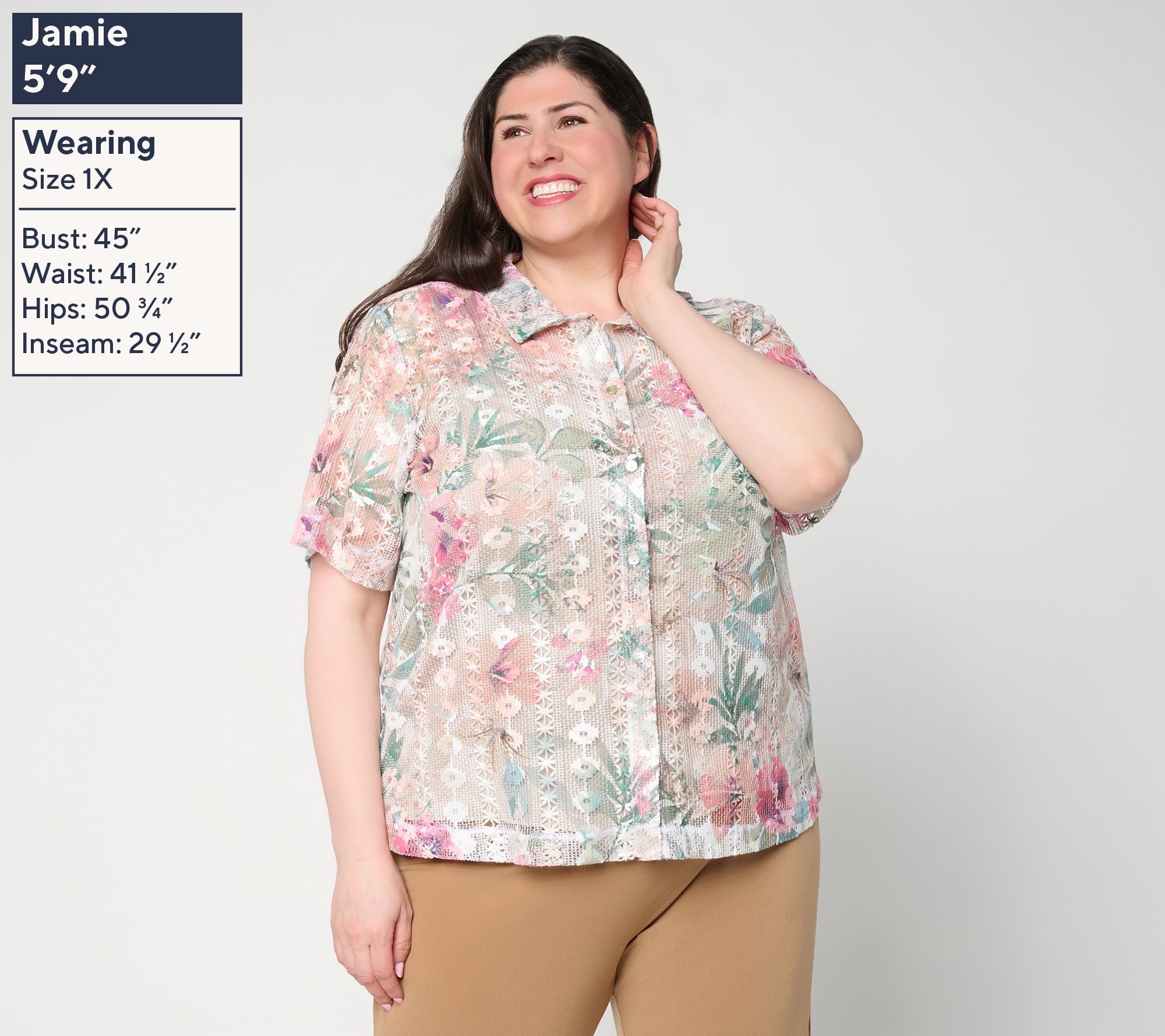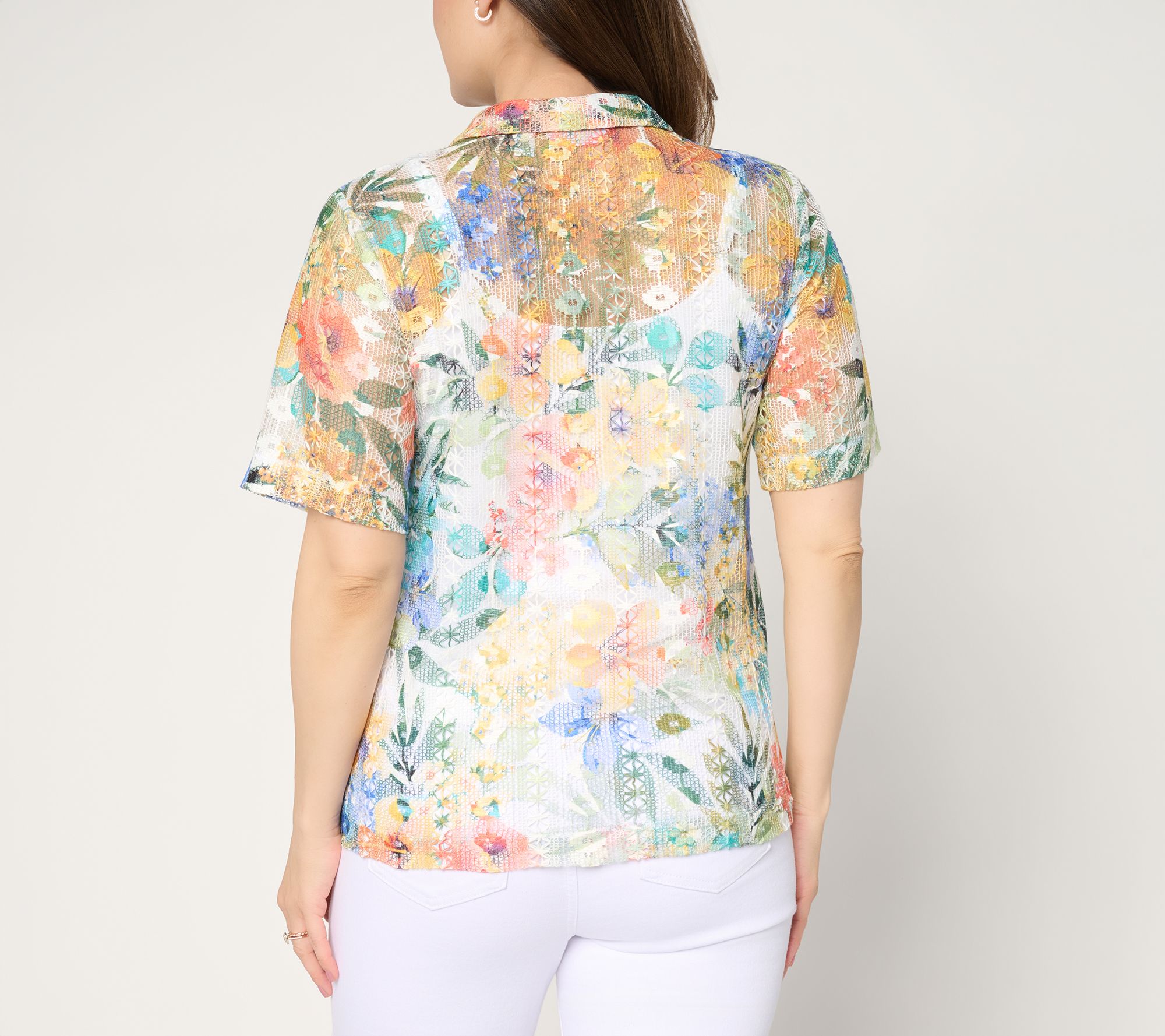 Morning meetings or lunch with friends are a breeze in this printed lace knit button-front shirt, bringing effortless style to your everyday routine. The easy silhouette with a straight hem and short sleeves offers versatile wear -- just add a tank and slacks or jeans for a look that moves with you from casual outings to laid-back afternoons. From Susan Graver.