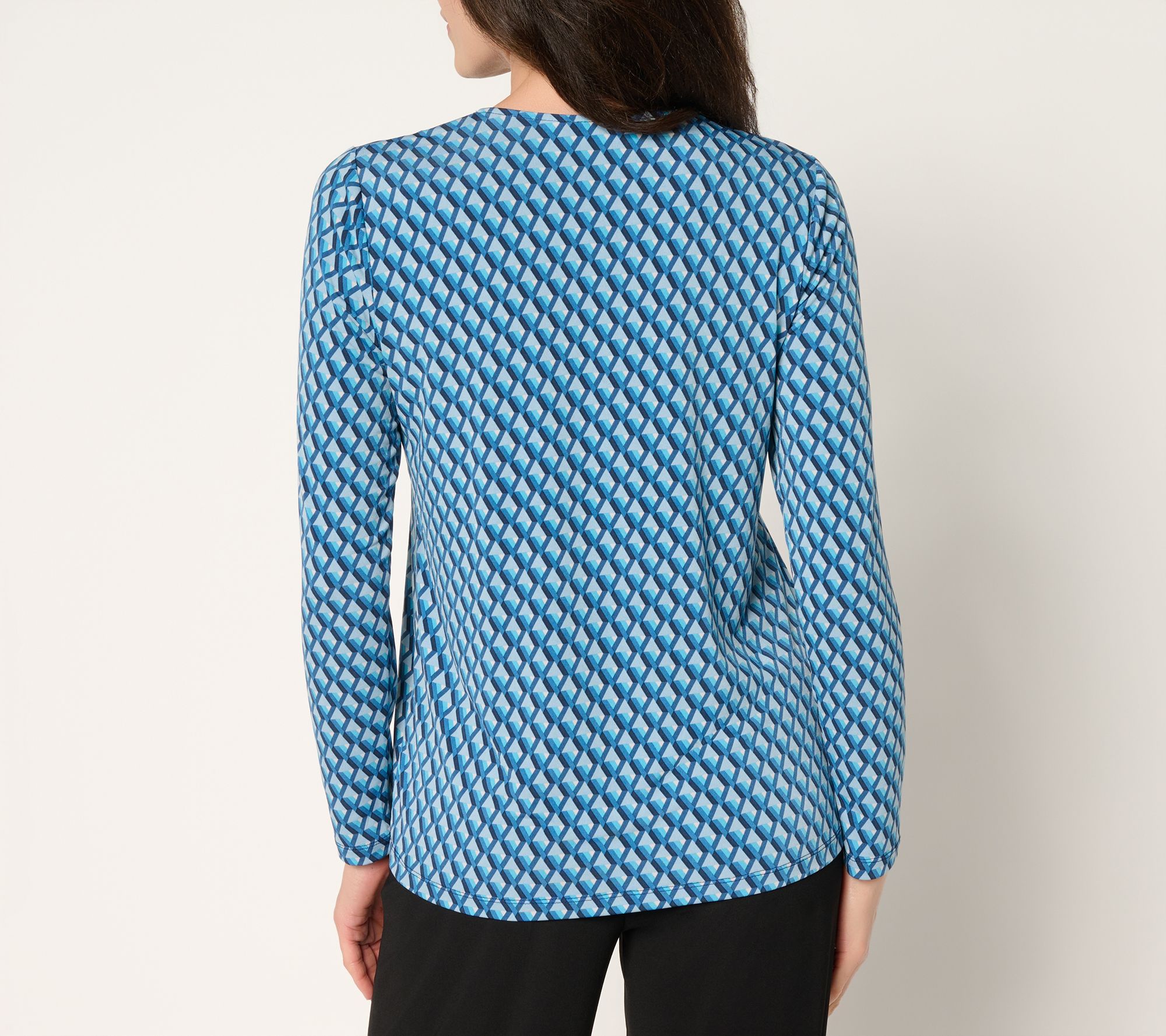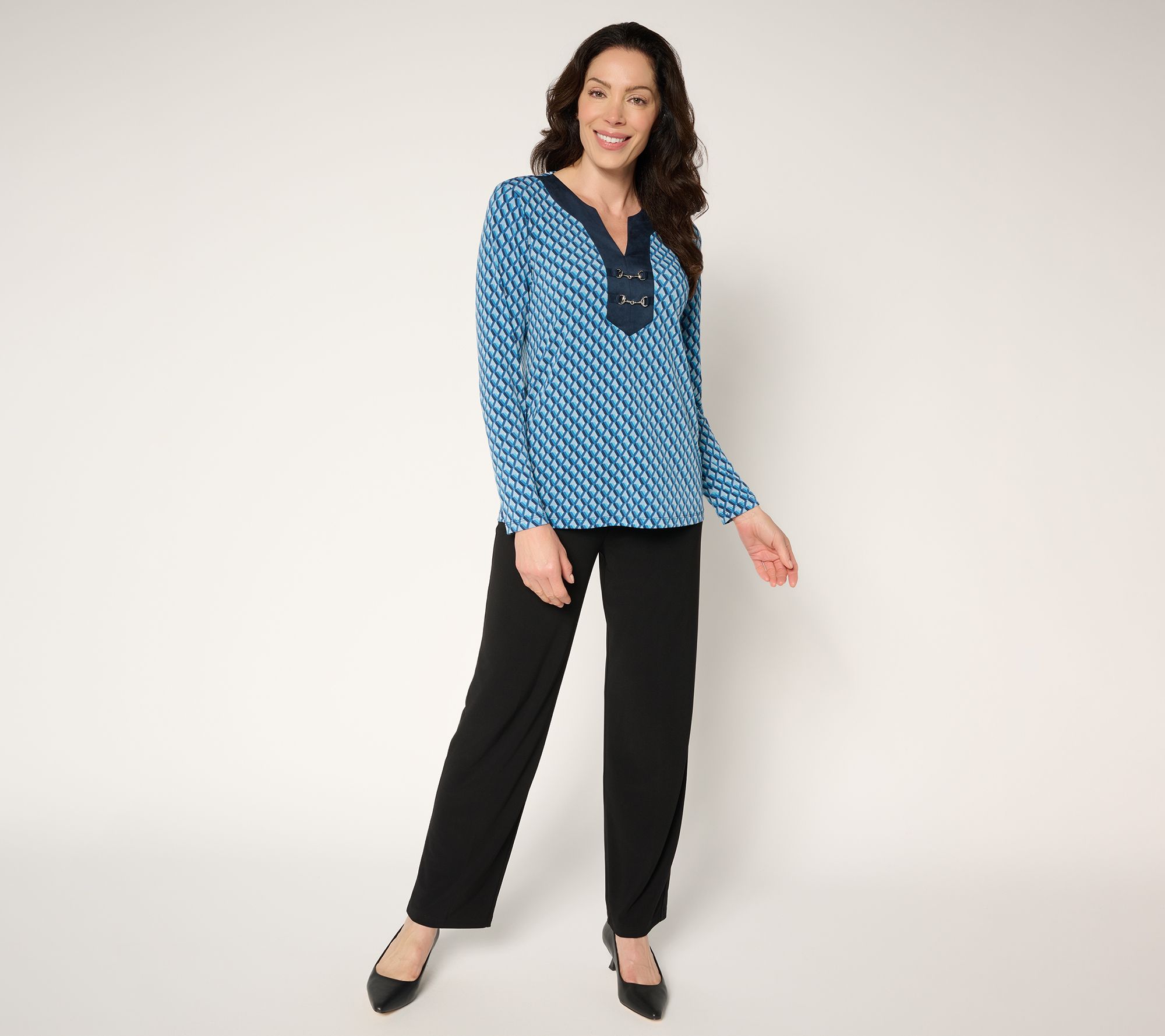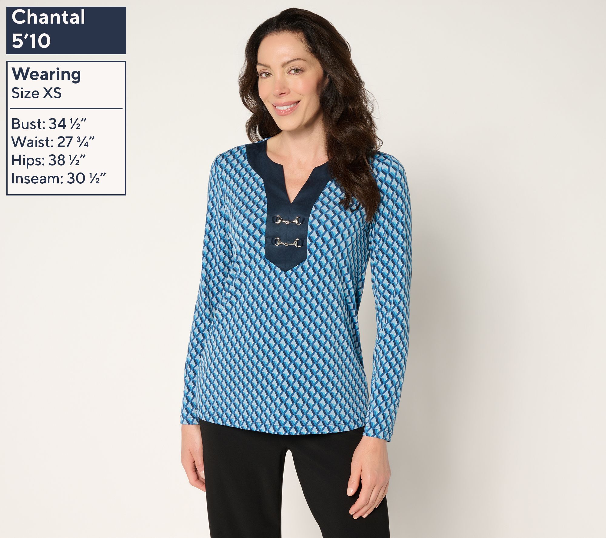 Move seamlessly through your day in this Liquid Knit® top, designed with a printed pattern and plush faux suede accents for a hint of texture. The split neckline with decorative hardware adds standout detail, while long sleeves and a straight hem provide versatile style for both busy mornings and laid-back afternoons. From Susan Graver.