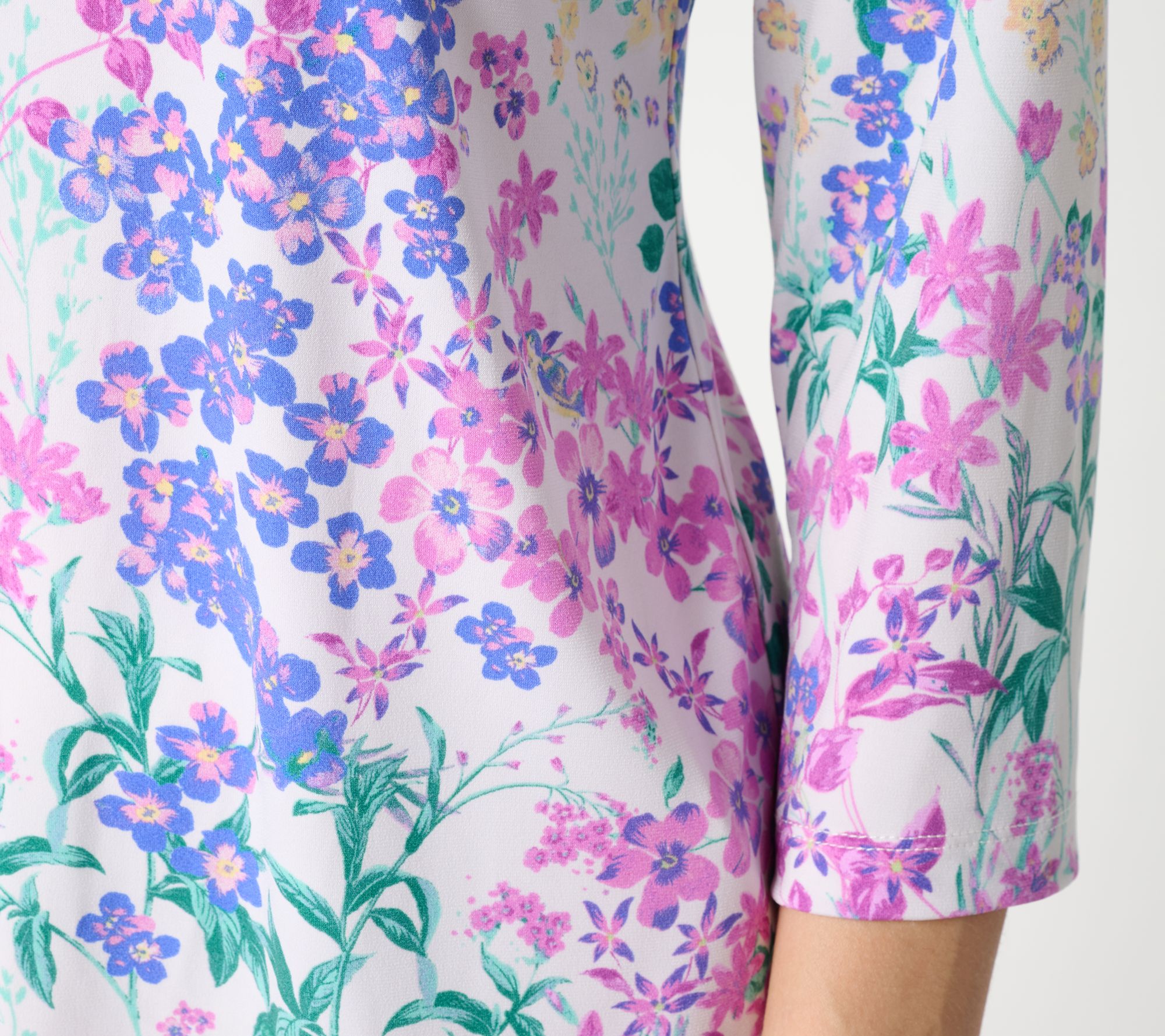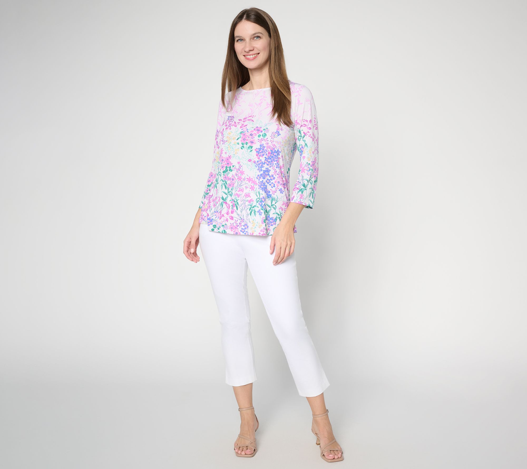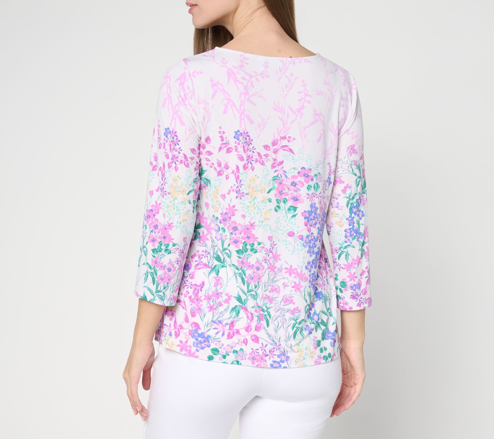 Bring along a bouquet of blossoms wherever you go! Whether you're meeting friends for coffee or heading out for an afternoon of errands, this printed A-line knit top brings a fresh pop of color and ease to every outing. The fluid Liquid Knit® drape and bateau neckline offer a figure-flattering silhouette with elegant movement, while 3/4-length sleeves and a pullover style make it a breeze to wear from season to season. From Susan Graver.
