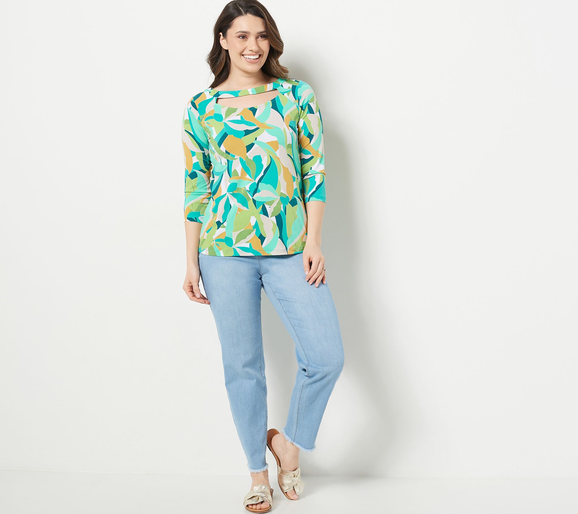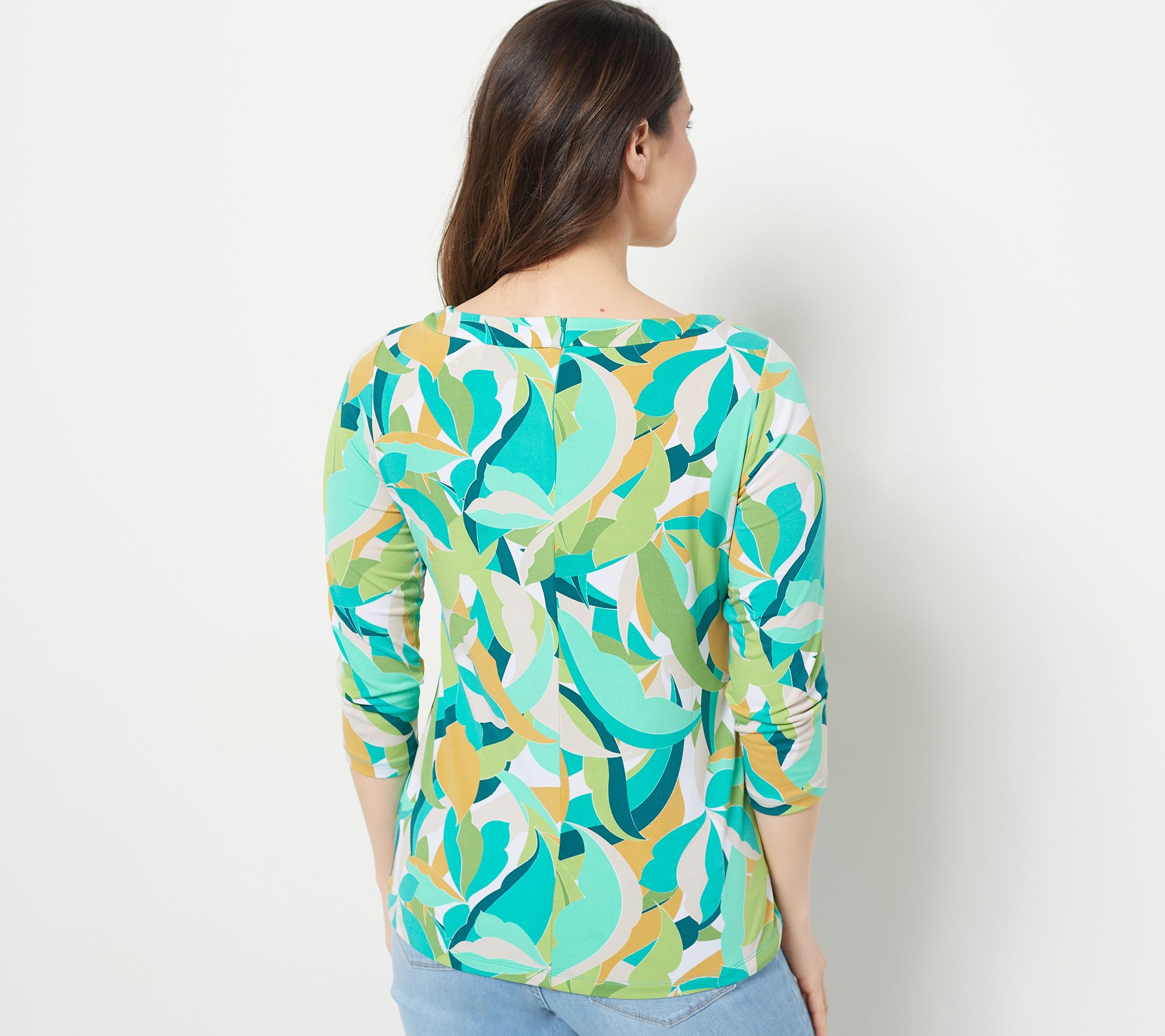 Susan Graver Printed Liquid Knit 3/4-Sleeve Top with Cutout Detail