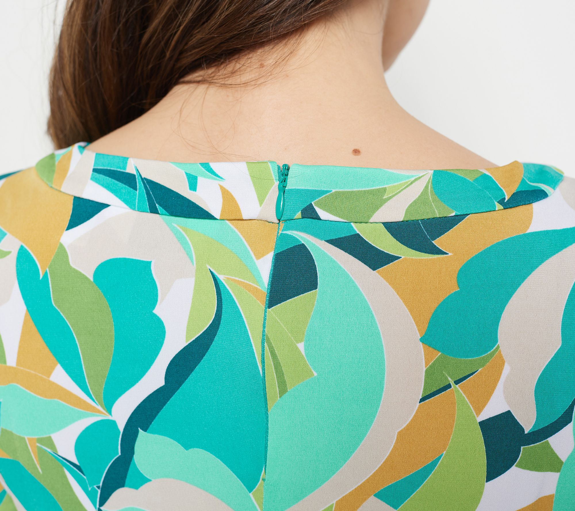 • Features: allover print, 3/4-length sleeves, scoop neck, front keyhole detail, back invisible zipper, straight hem